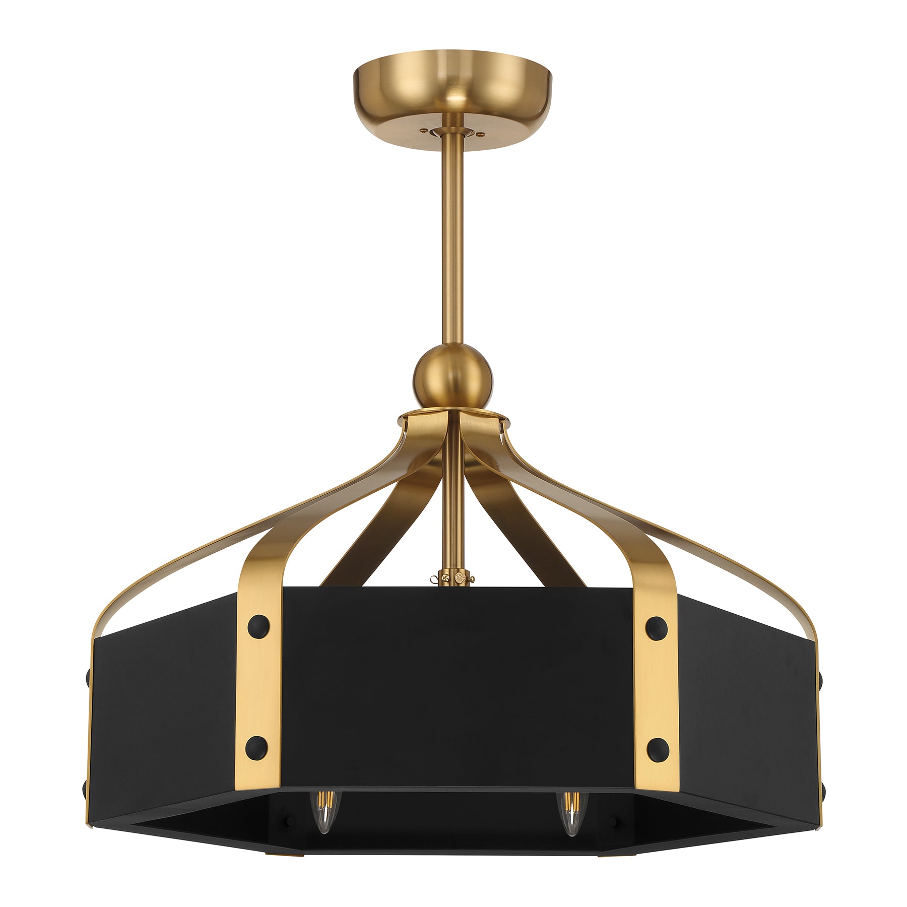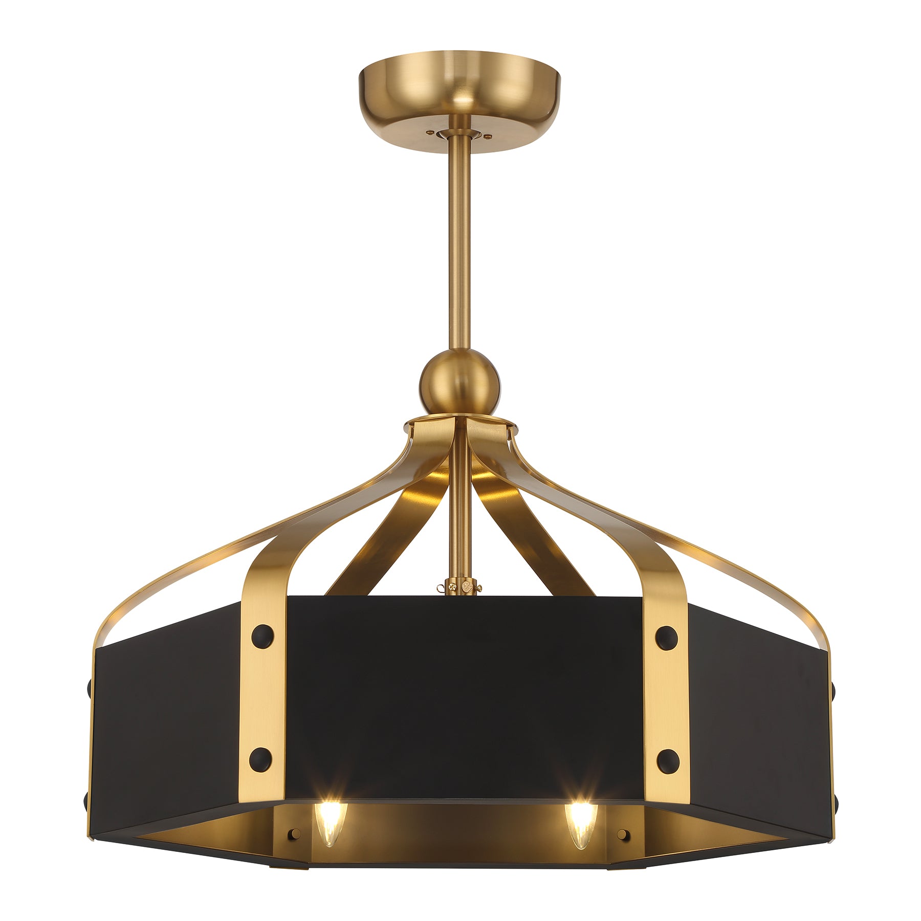 The Savoy House Sheffield 6-light Fan D'Lier offers up a beautiful, elegant and classic look with a lantern-like style and a Matte Black finish with Warm Brass accents. It is 9.7" in height and 26" in width. Uses six candelabra size bulbs of up to 60 watts per bulb. LED bulbs are included.