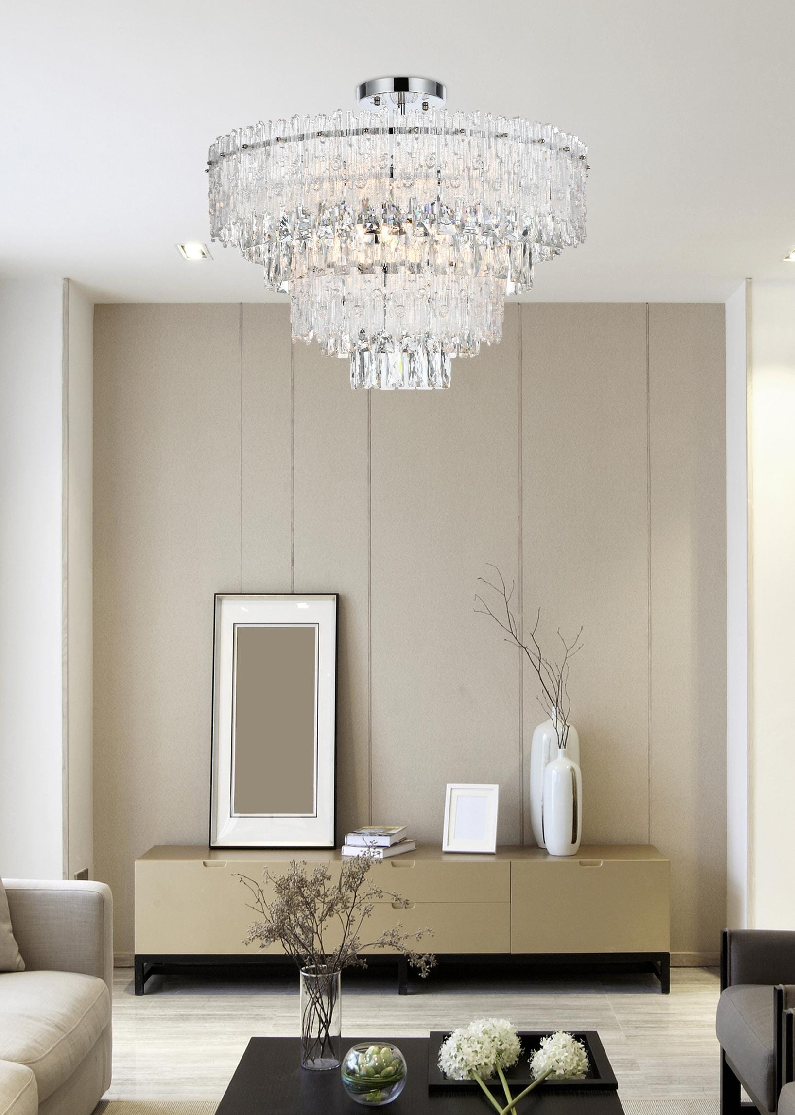 Transform your home with the opulent charm of this indoor lighting, meticulously designed to make a statement in any space. The light fixture showcases an intricate array of precision-cut clear crystals, each expertly faceted to maximize light refraction and create a dazzling display of brilliance. These crystals are complemented by textured glass accents that add depth and visual interest, casting a soft, shimmering glow across the room. Available in your choice of chrome or satin gold finishes, it is the epitome of luxury and modern elegance. As part of a coordinated collection, it also includes matching chandeliers, wall sconces and flush mounts, allowing you to create a harmonious lighting scheme throughout your home.