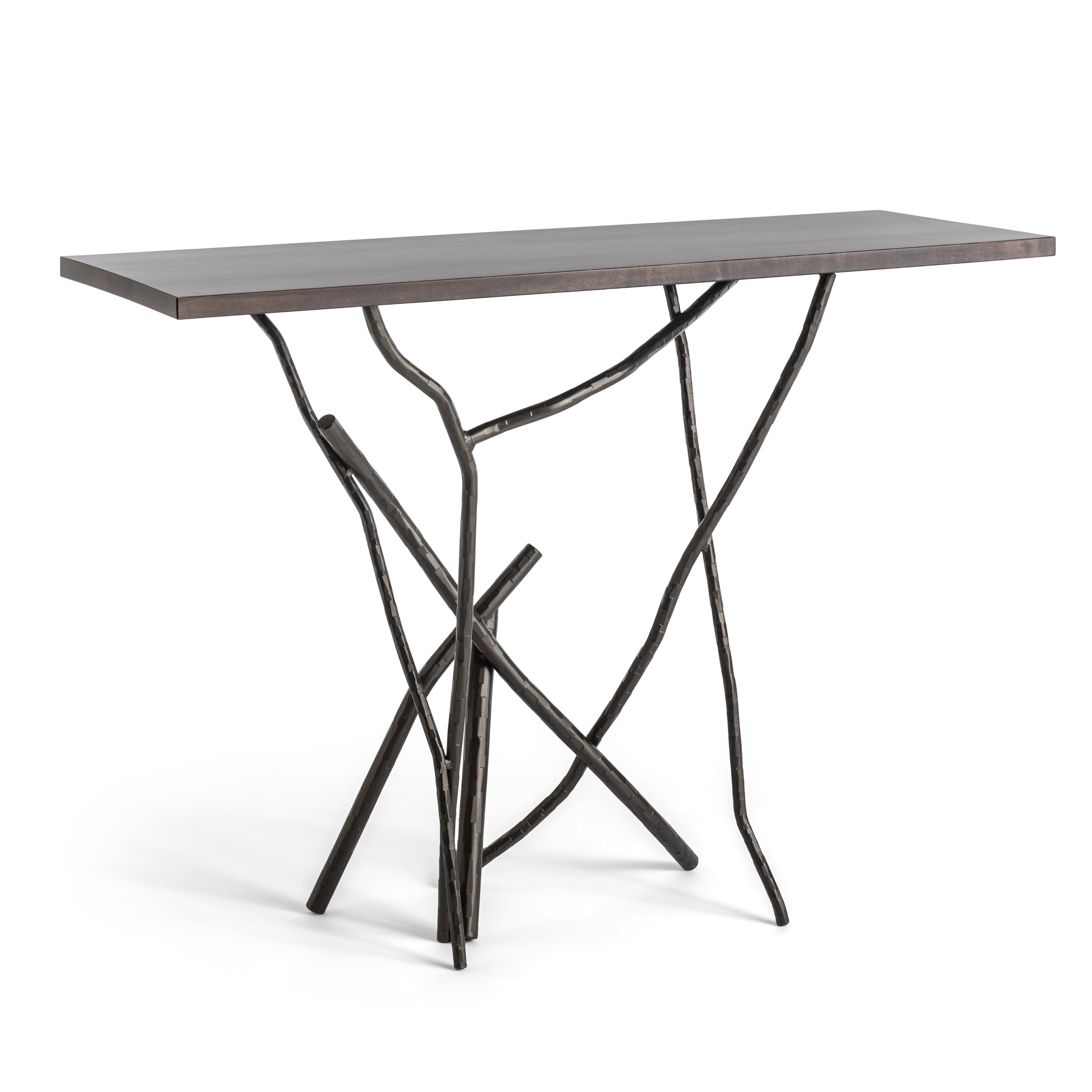 The Brindille Console Table is a showstopper with its trademark, artisan-made "branches" of hand-hammered aluminum that serve as the console's legs, with a solid Vermont maple wood top that completes the organic nature of the Brindille Collection. It is an ideal piece to place against a wall, the back of a sofa or other furniture, to maximize the space. Available in all standard finishes.