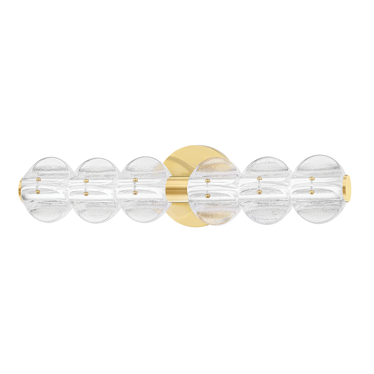 Circular motifs, textural glass, and jewelry-like pins and clasps embellish the graceful fixtures of the Lindley family. Molded and strung along the frame like beads, the three-dimensional glass discs create a scalloped-edge silhouette. The fixtures in this family range from a small sconce to a large-scale ring chandelier, marrying timeless materials with on-trend shapes. Choose from classic Aged Brass or a more contemporary Polished Nickel finish.