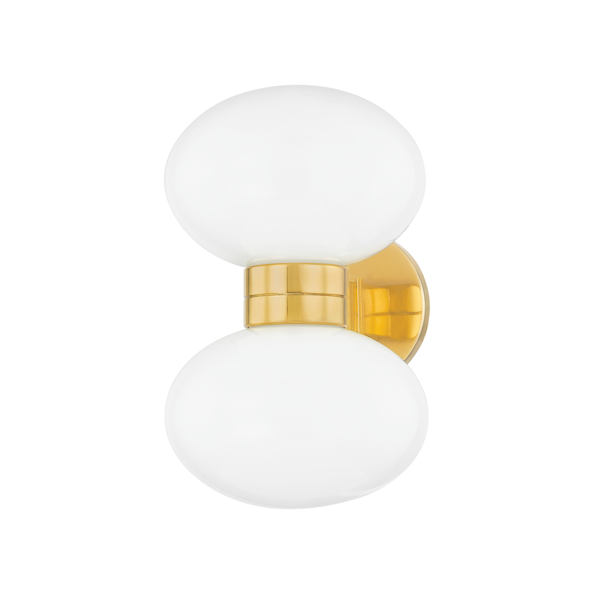 An ode to the gentle curves of the Art Nouveau period, Otsego features two large opal glossy bulbs in an hourglass formation. This double wall light produces an atmospheric glow, bringing a welcoming ambiance to any space. Choose from two finishes?Aged Brass for a vintage feel, or Polished Nickel for a sleek, modern style.