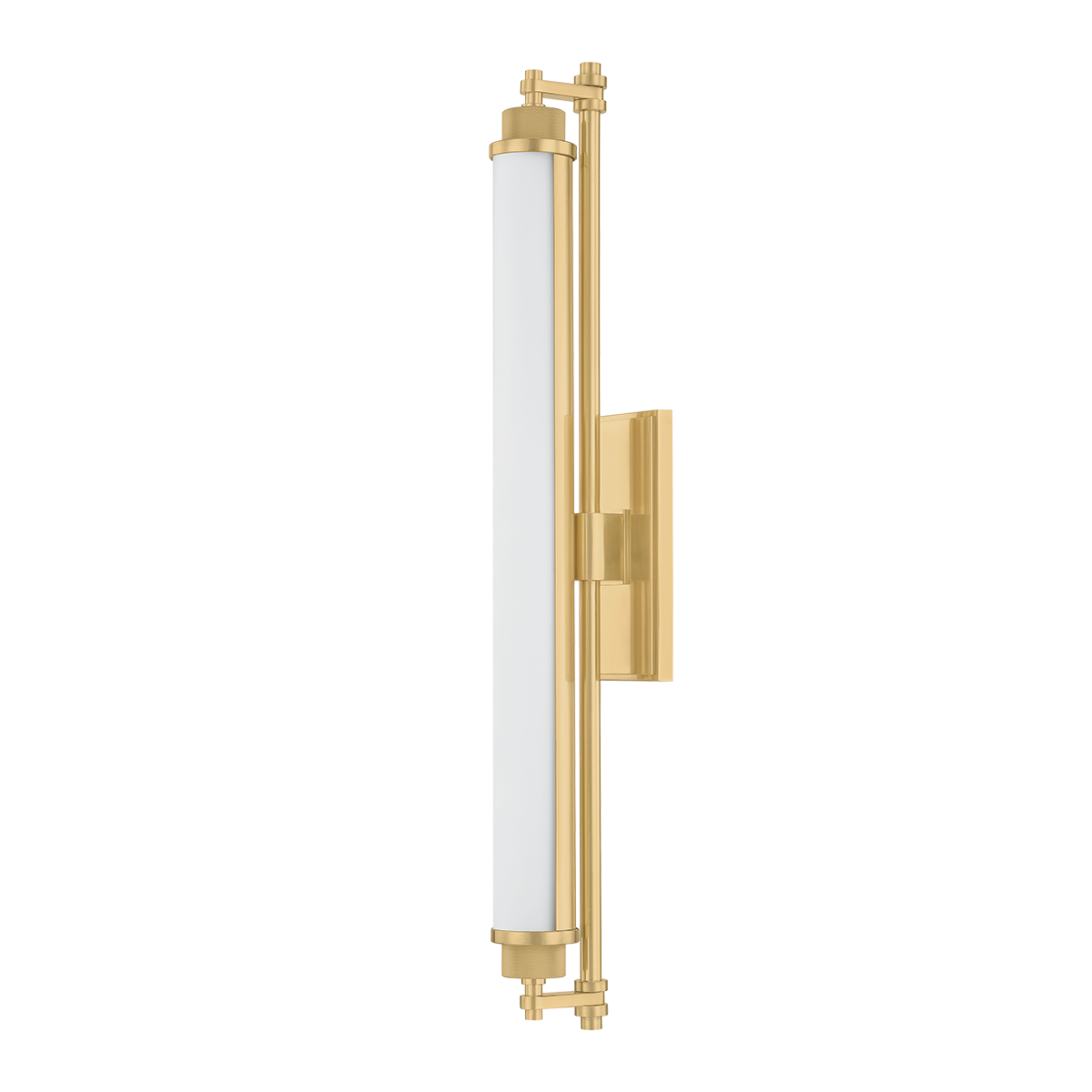 Designed for bath and powder rooms, Plandome is a sleek, machine-inspired sconce with high functionality. Featuring a single LED-lit opal matte glass tube supported by a central stem, this slender fixture can be used individually or in multiples as needed. Finished in Aged Brass or Polished Nickel, the metalwork adds a stylish quality to a thoroughly modern sconce. Available in two sizes.