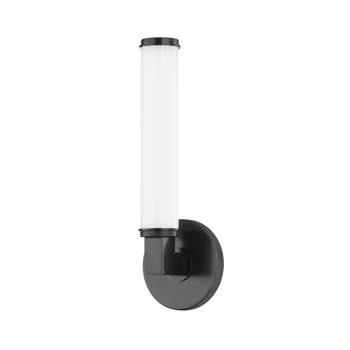 Add a dramatic effect to the bath or sophistication down a hallway with this modern one or two-light sconce that has timeless appeal. A recognizable sconce form feels fresh with detailed metalwork like the thick rectangular arm set against a round backplate and the knurled detailing on the ends of the opal glossy glass shades. Available in Aged Brass or Old Bronze.