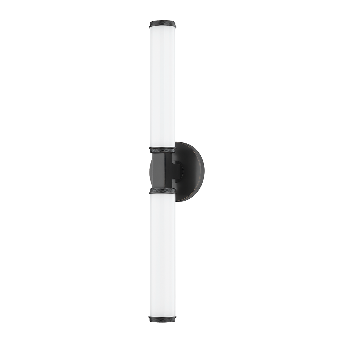 Add a dramatic effect to the bath or sophistication down a hallway with this modern one or two-light sconce that has timeless appeal. A recognizable sconce form feels fresh with detailed metalwork like the thick rectangular arm set against a round backplate and the knurled detailing on the ends of the opal glossy glass shades. Available in Aged Brass or Old Bronze.
