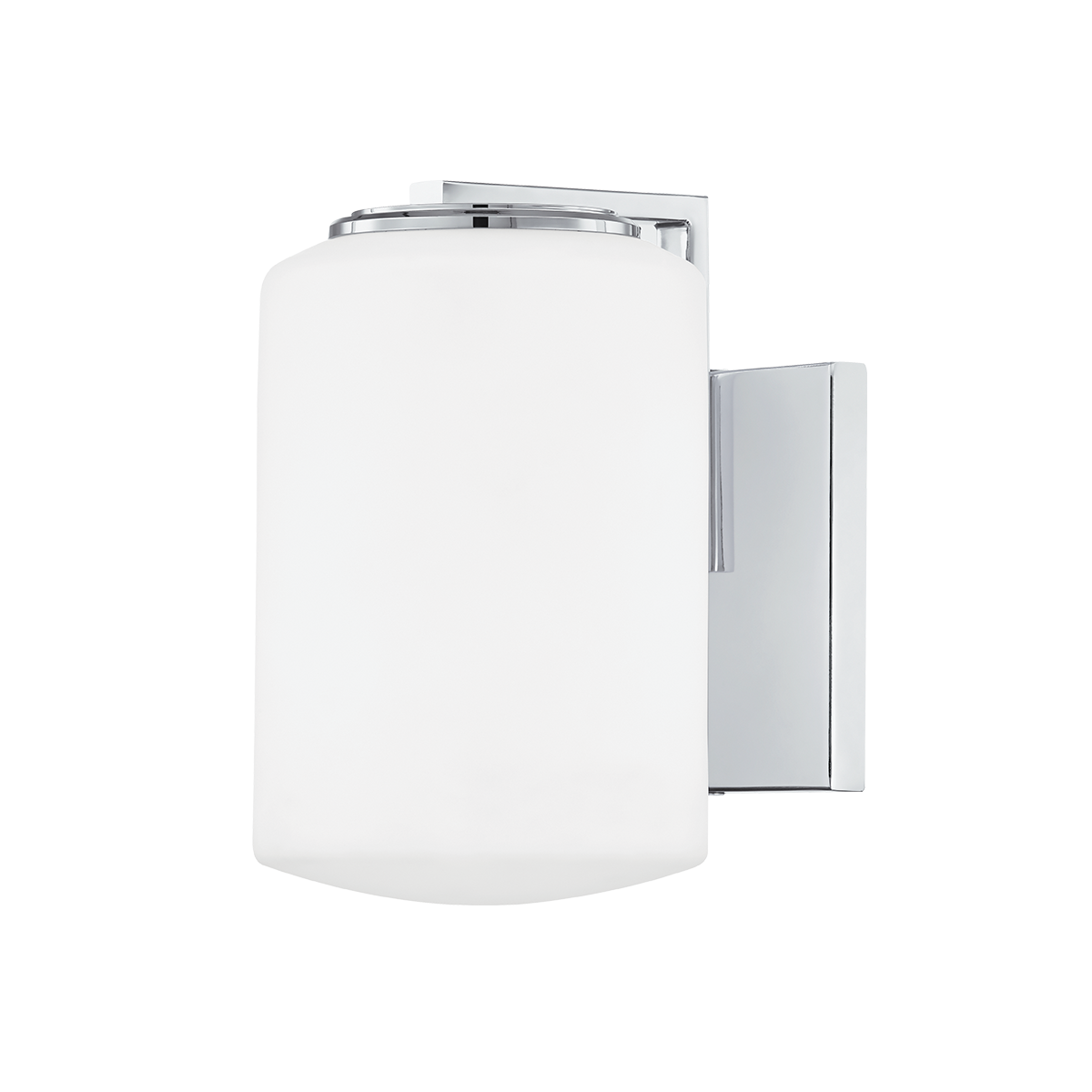 With shades large enough to nearly hide the backplate, these bath and vanity fixtures appear to hang in midair. Bulbs enclosed inside the opal matte cylindrical shades give off a soft glow. Polished chrome accents at the shade top, arm and backplate give the fixture a clean look.