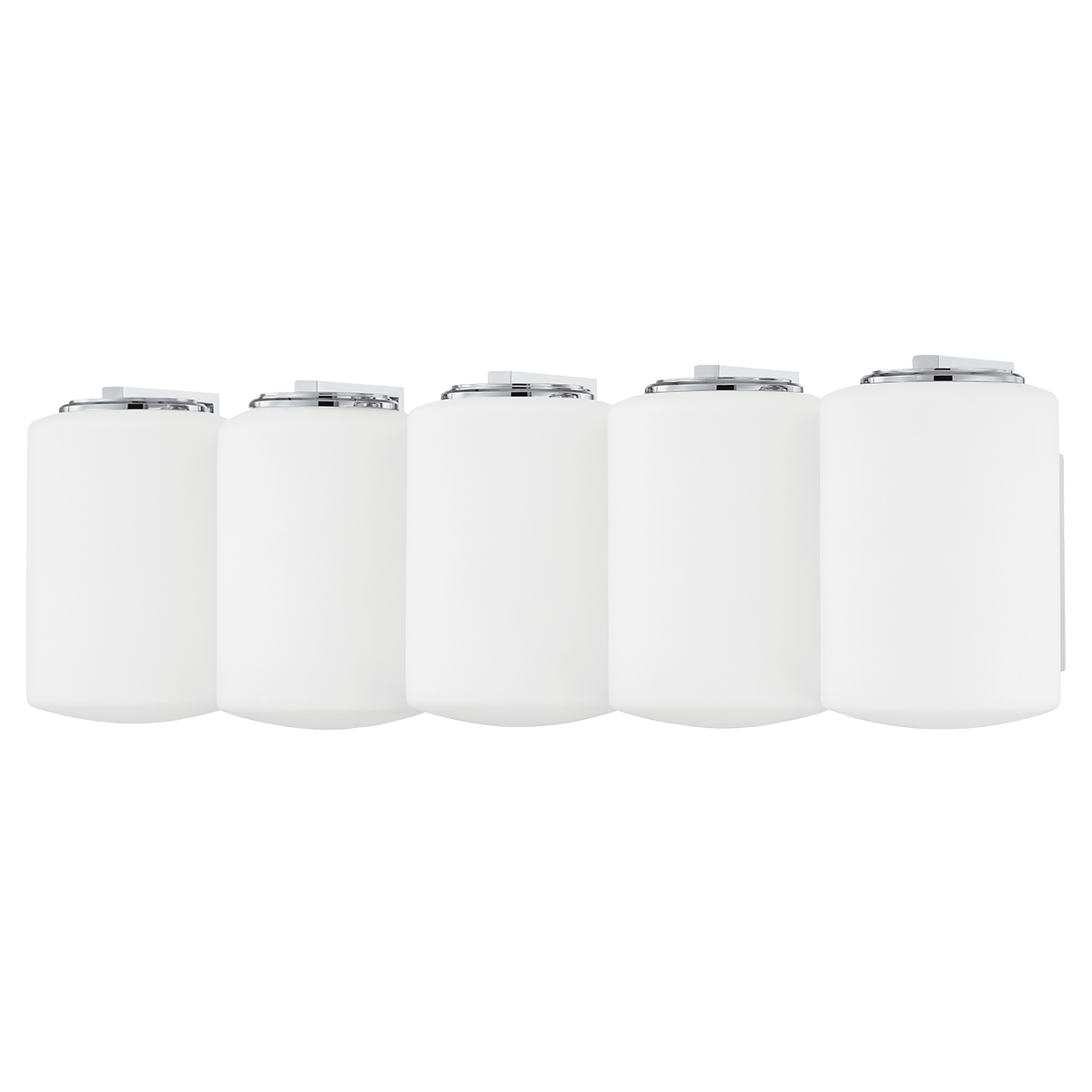 With shades large enough to nearly hide the backplate, these bath and vanity fixtures appear to hang in midair. Bulbs enclosed inside the opal matte cylindrical shades give off a soft glow. Polished chrome accents at the shade top, arm and backplate give the fixture a clean look.
