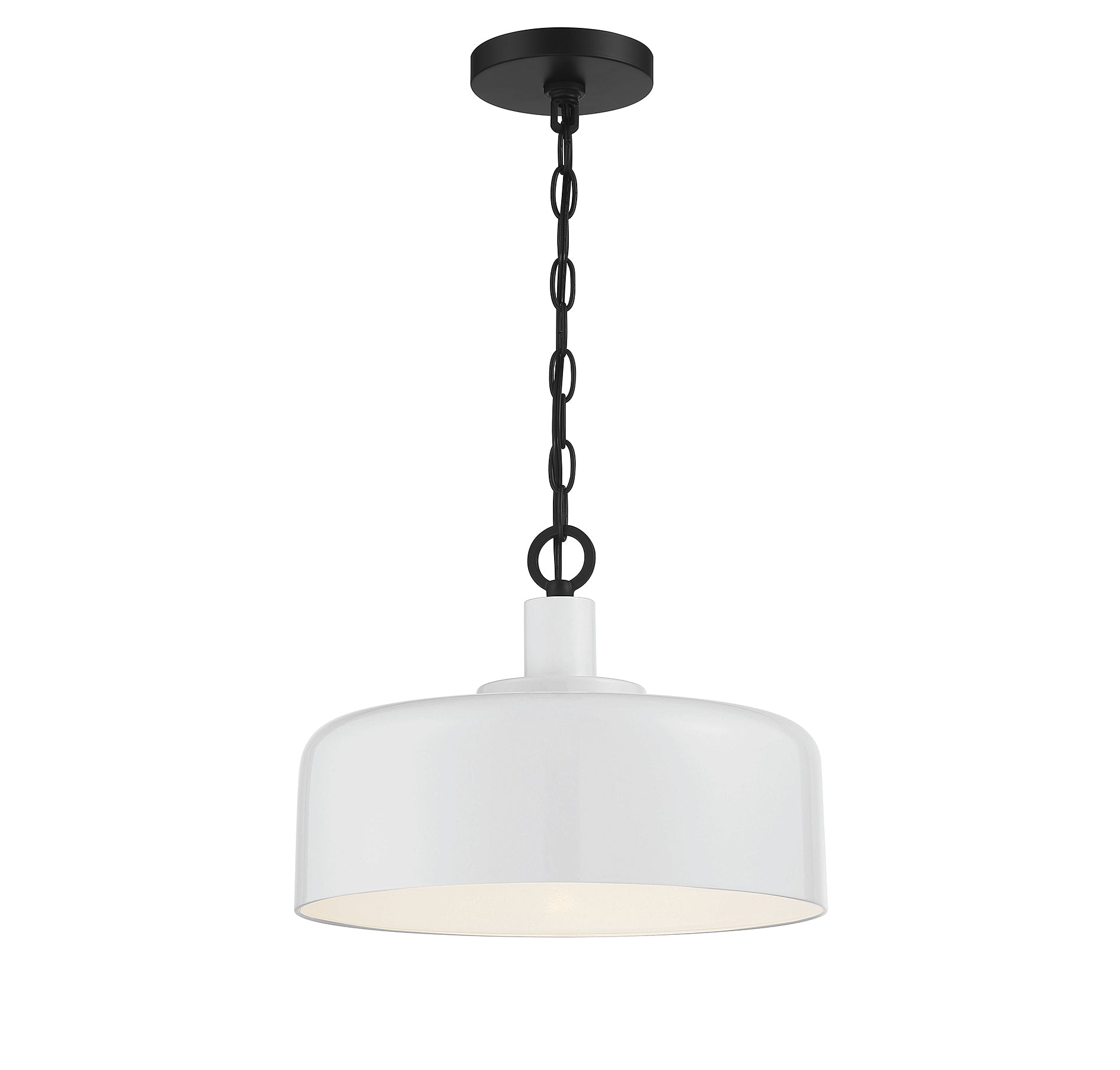 No matter where you live, you can easily add a touch of farmhouse appeal to your home with this Meridian 1-light pendant. It flaunts a wide white metal shade that has down-home charm and pairs well with the black chain. Whether used alone or in multiples, this pendant is perfect for spaces with farmhouse, rustic and contemporary looks. This pendant is 10.25" in height and 14" in width, plus it includes 120" of chain to let you adjust the height. This pendant uses 1 standard size bulb of up to 60 watts, is LED compatible and is dimmable.