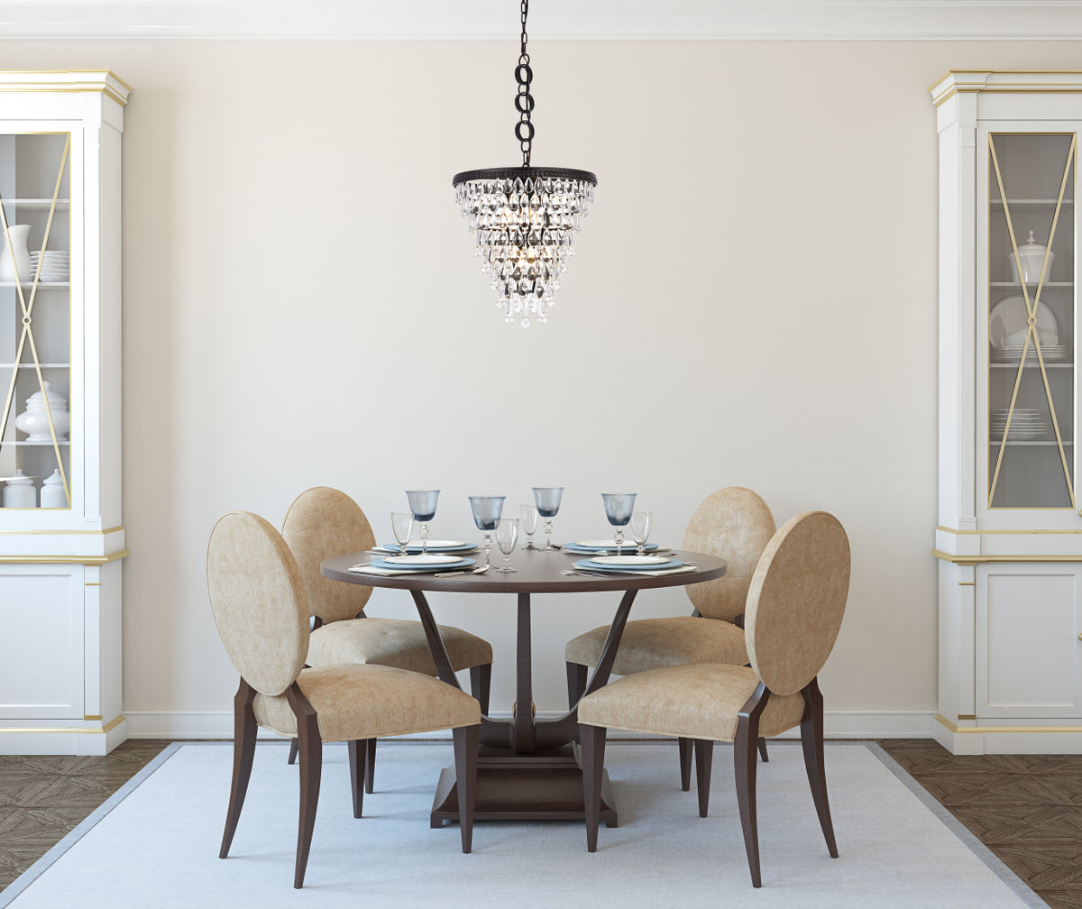Like the sun setting on a frozen lake, this collection shimmers with tiers of icy crystals reflecting the soft glow of the candelabras. True to its Nordic namesake, the cascades of royal-cut clear crystals complement the etched black finished frame. Suspended by an elegantly looped chain that draws the eye to the cool sheen below.