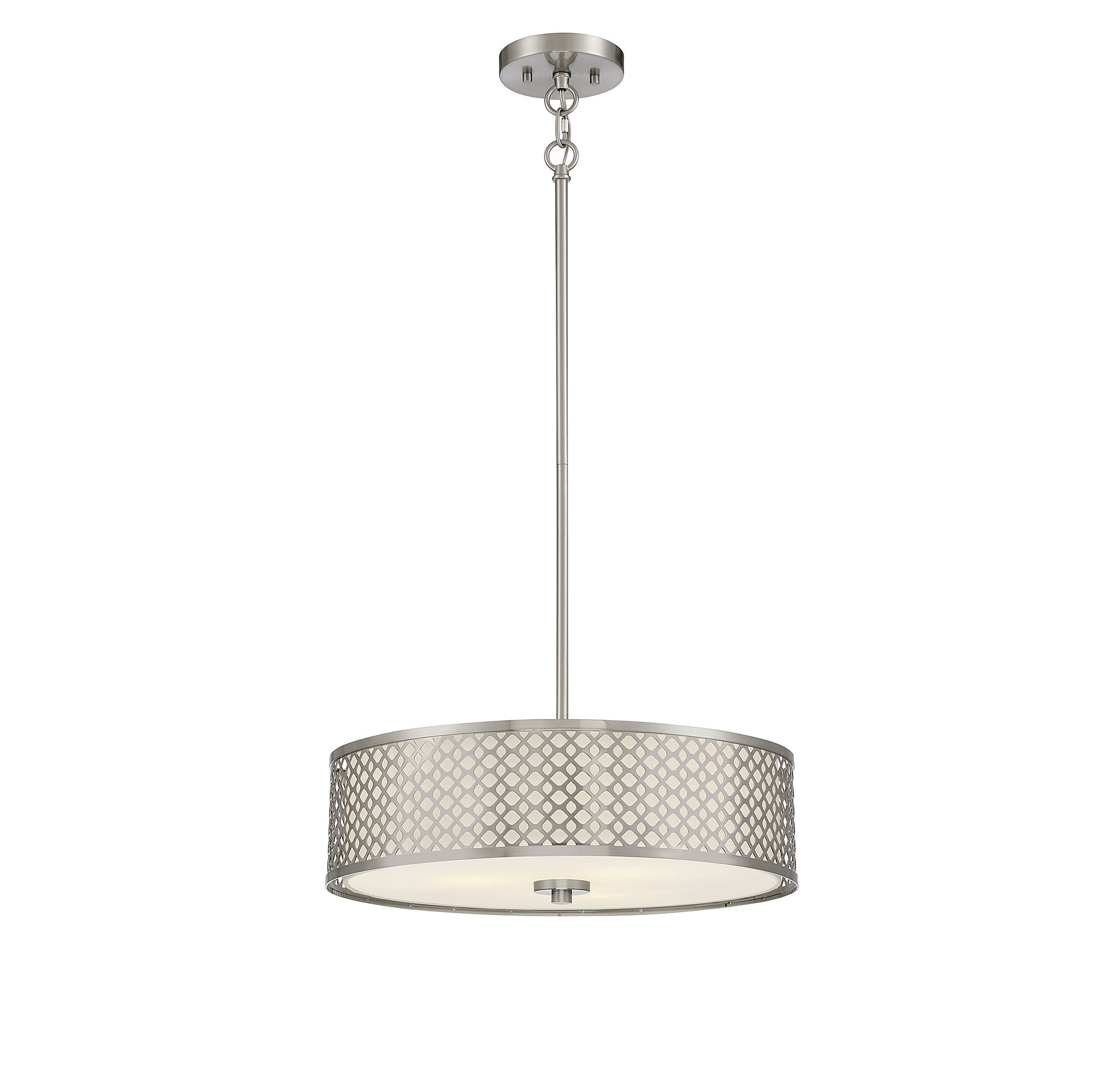 Classic lighting style gets an eye-catching upgrade in this 3-light Meridian pendant. Its sleek drum-shaped white fabric shade is decorated with a metal pattern finished in brushed nickel to create another dimension of texture and interest. Use this pendant alone or in multiples to brighten up rooms with modern, contemporary or transitional styles. This pendant is 5" in height and 18" in width, plus it includes four 12" downrods and one 6" downrod to let you adjust the height for a maximum of 59". This pendant uses 3 medium size bulbs of up to 60 watts each, is LED compatible, is dimmable and can be used on a sloped ceiling.