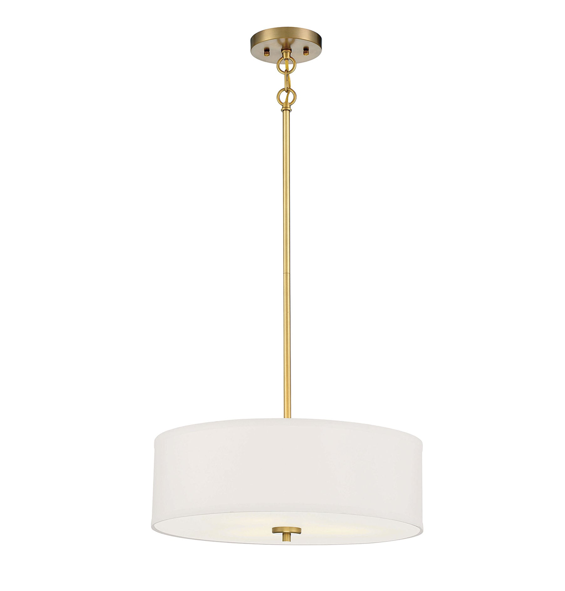 This Meridian 3-light pendant presents timeless drum pendant lighting style that is perfectly suited for brightening up any space. Its crisp shade of white fabric pairs well with the bold natural brass finish. Whether you use this pendant alone or in multiples, you will love how it looks! This pendant is 6.5" in height and 18" in width, plus it includes four 12" downrods and one 6" downrod to let you adjust the height for a maximum of 60.5". This pendant uses 3 standard size bulbs of up to 60 watts each, is LED compatible, is dimmable and can be used on a sloped ceiling.