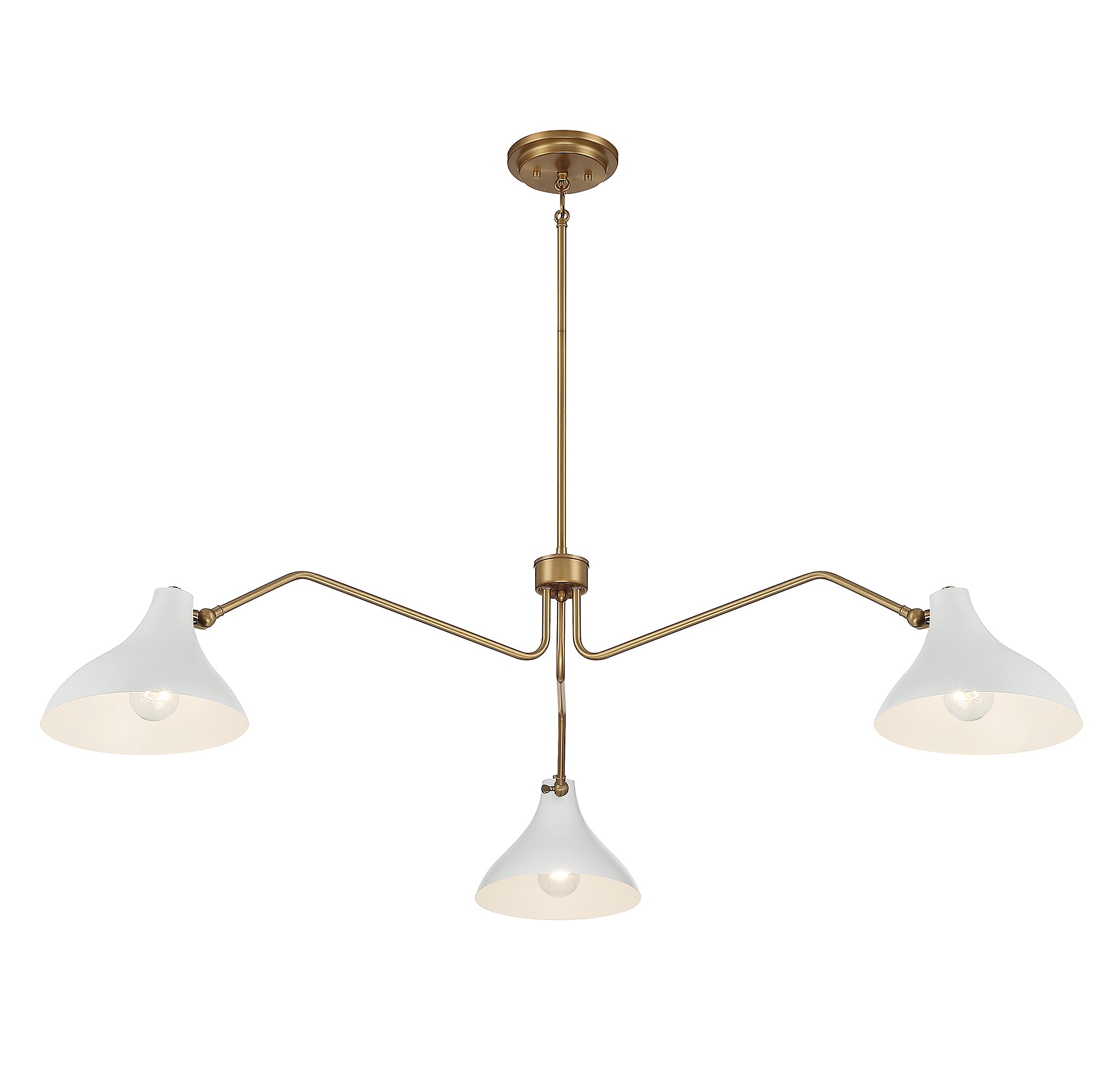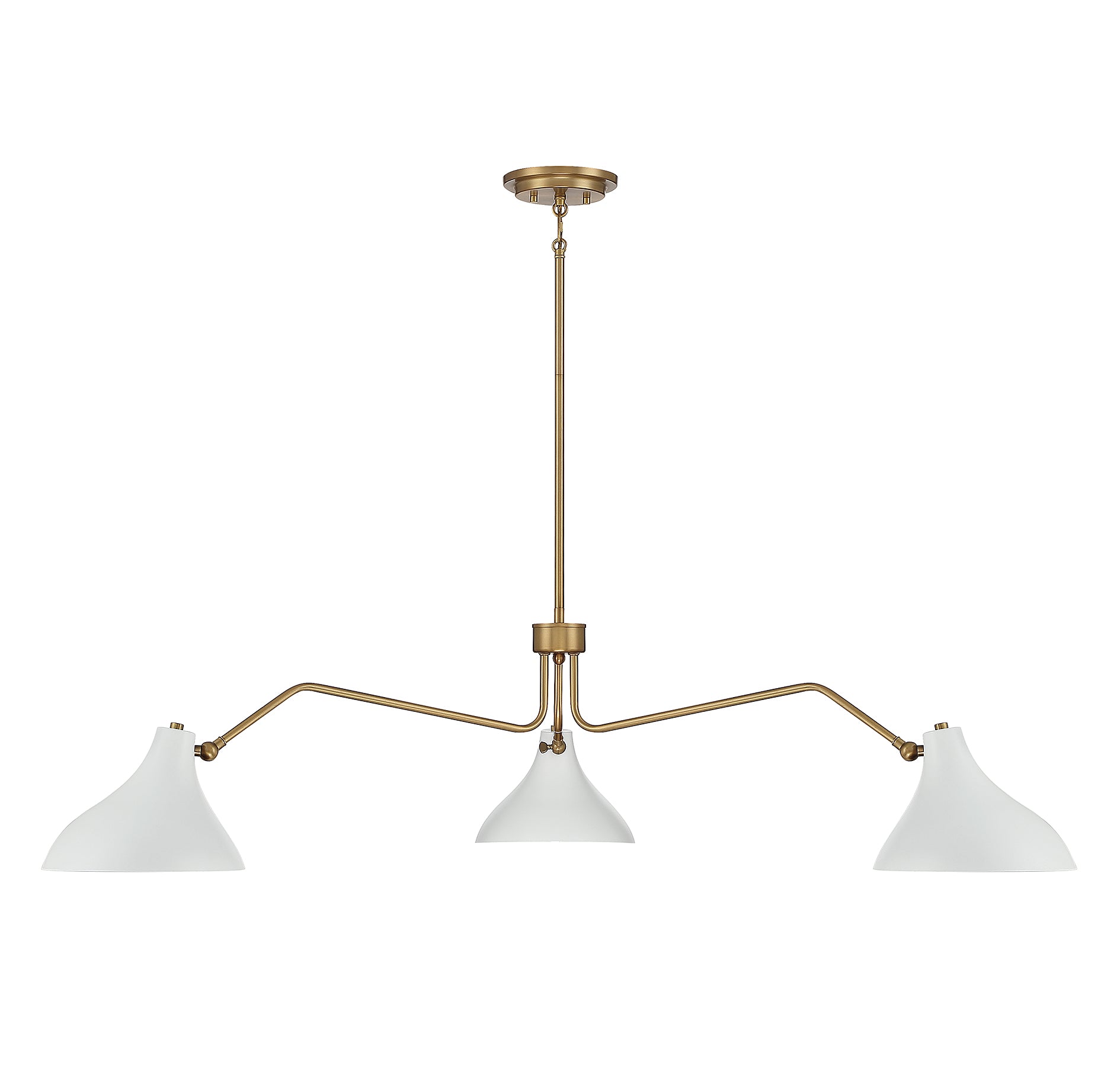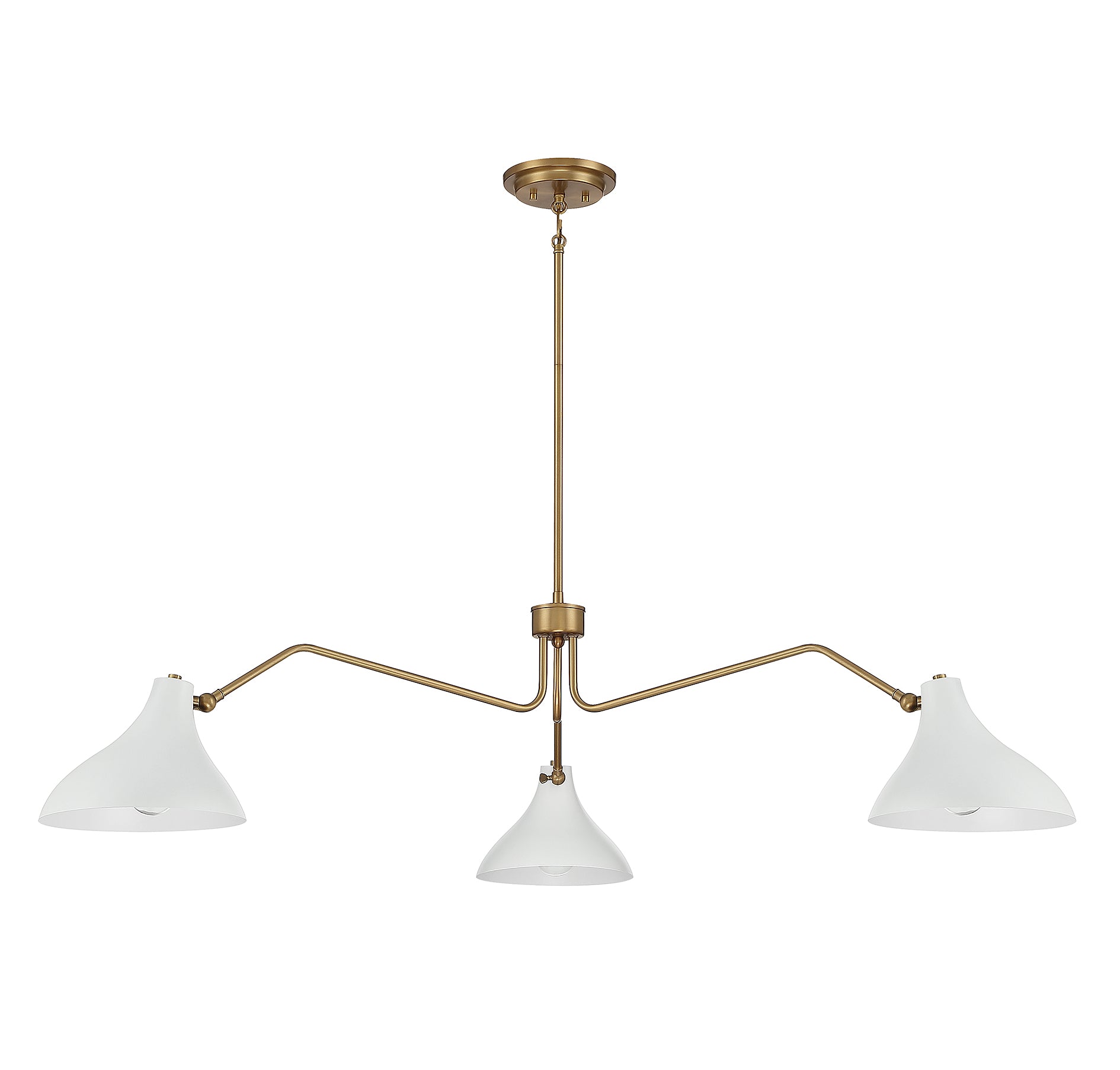 This Meridian 3-light pendant showcases curving vintage-inspired shades on long, dramatically angled arms and is finished in a stylish pairing of white with natural brass. 11.5" height, 48" width. Max height 65.5". Max 60 watts per bulb, standard size A19 bulbs recommended. LED bulb compatible. Supplied with four 12" rods and one 6" rod.