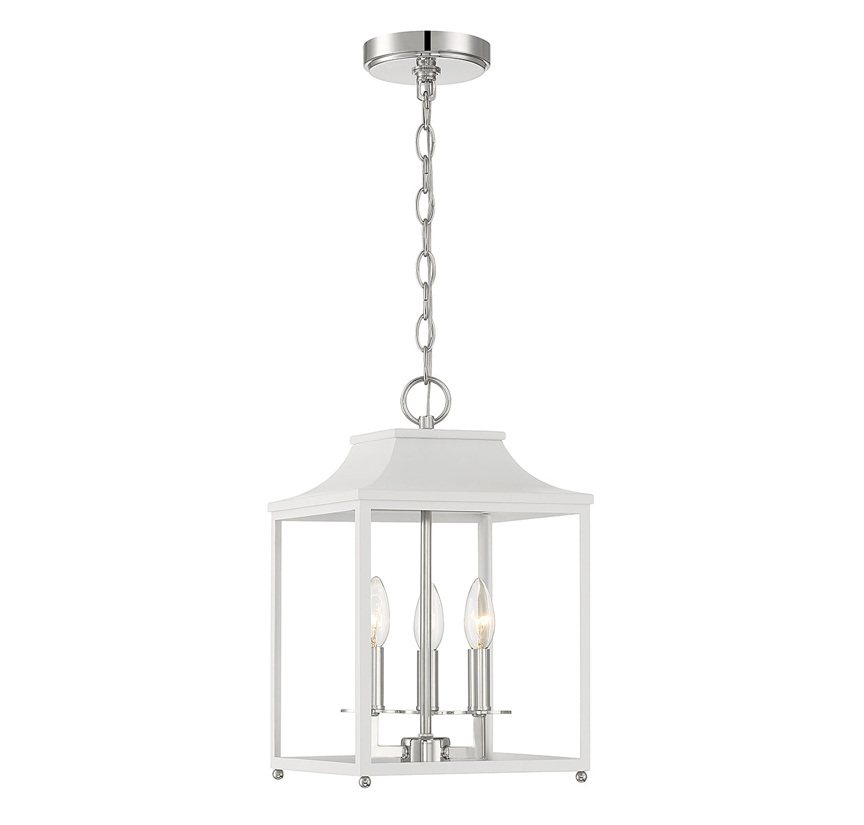 Crisp and traditional lantern style lighting is given an update in this 3-light pendant, which features a white finish accentuated by polished nickel. 16" height and 10" width. Uses candelabra size bulbs with a max of 60 watts per bulb. LED bulb compatible. Supplied with 120" of chain.