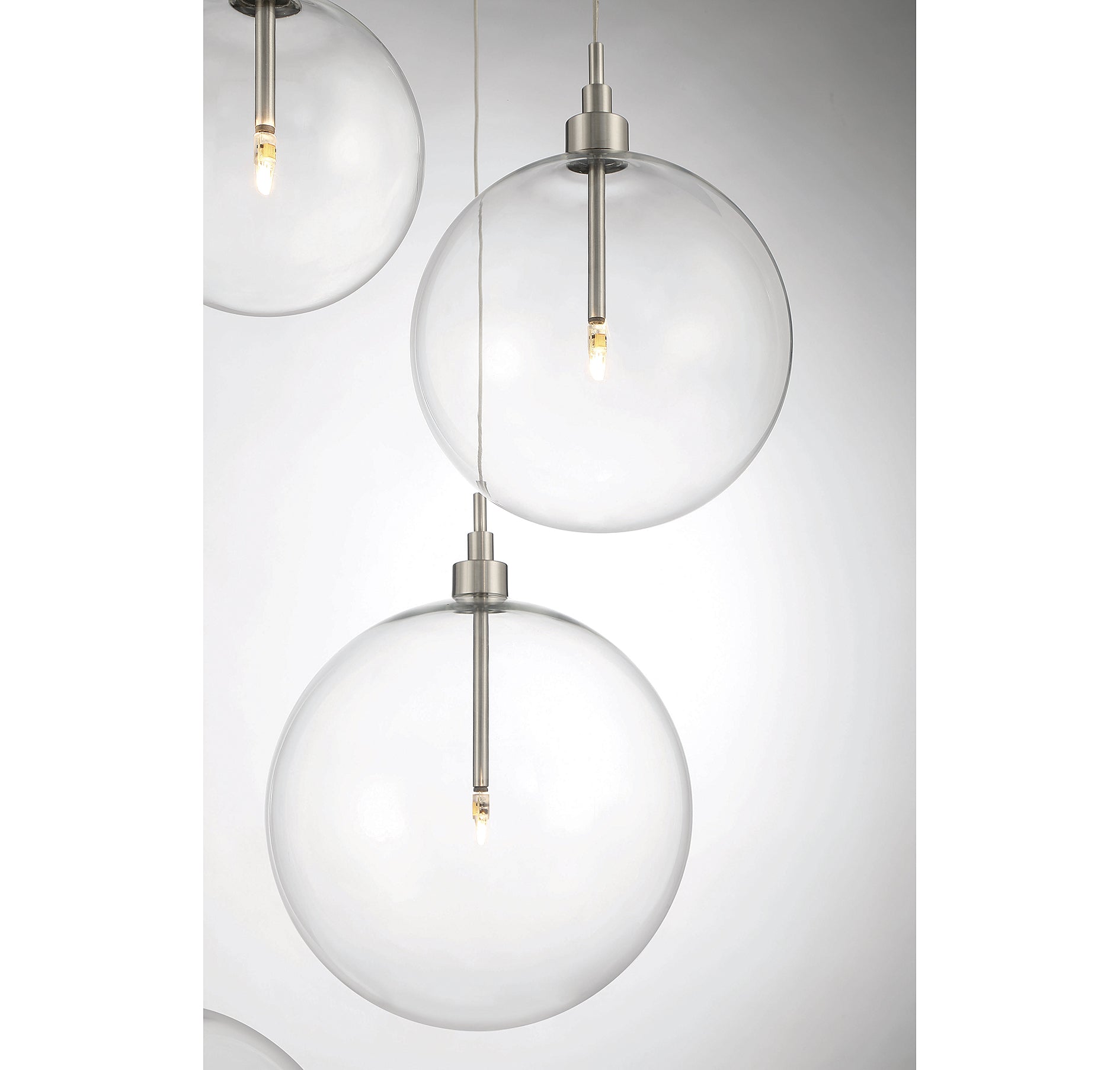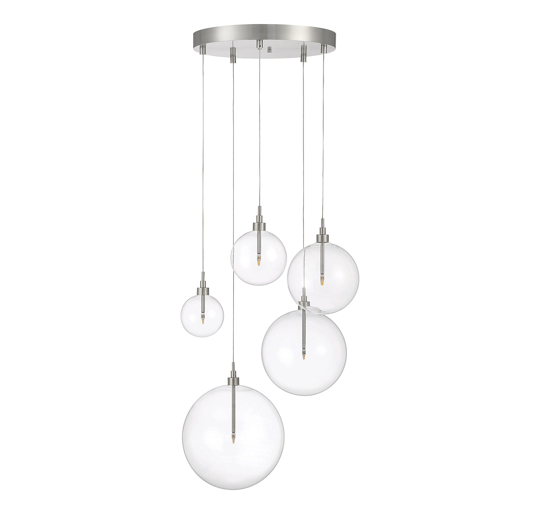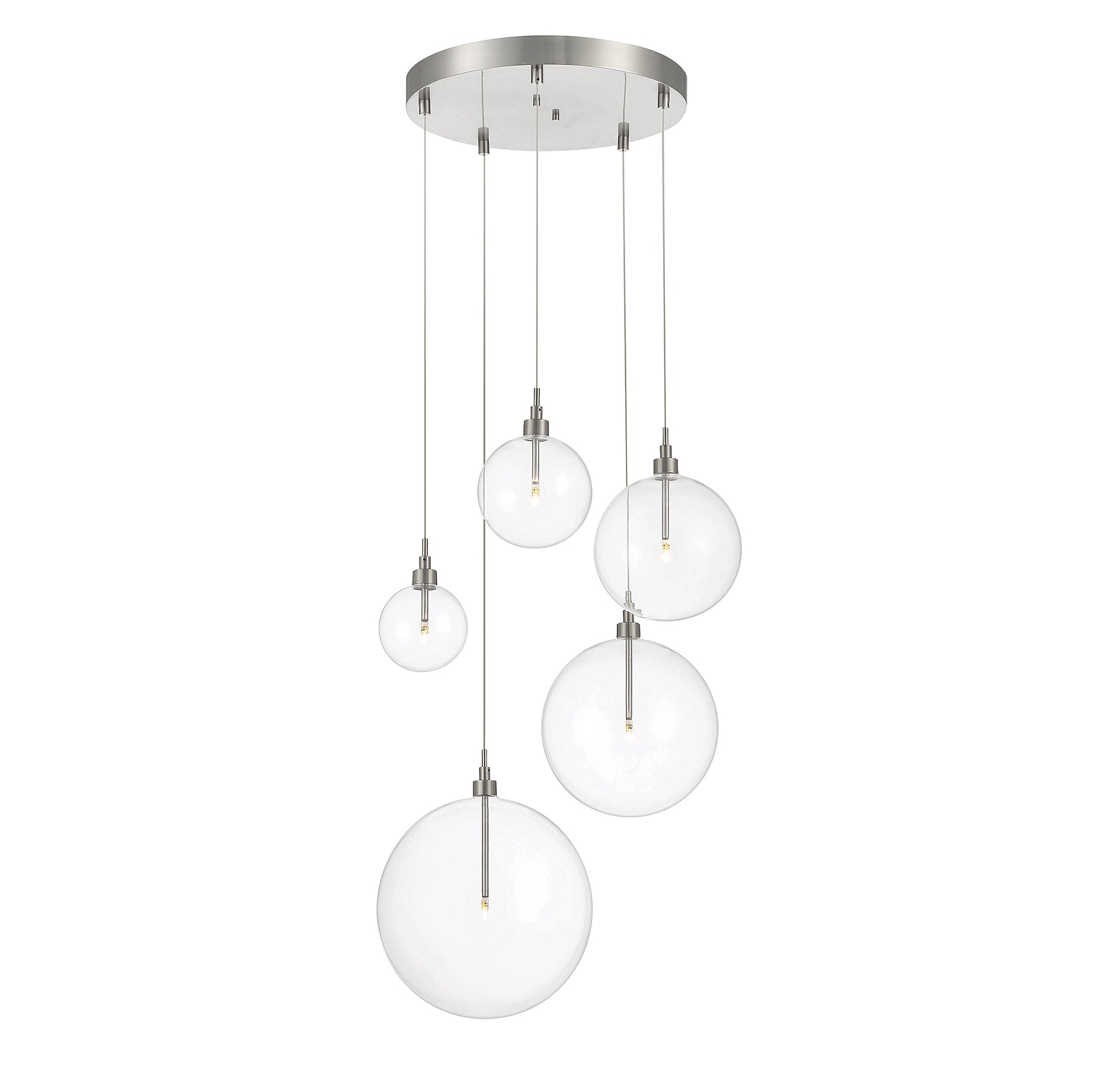 This Meridian 5-light pendant showcases clean, minimal styling with hand-blown orbs of clear glass and a brushed nickel finish. You can adjust the hanging height of each light for total customization! Bi-pin T4 LED bulbs included.