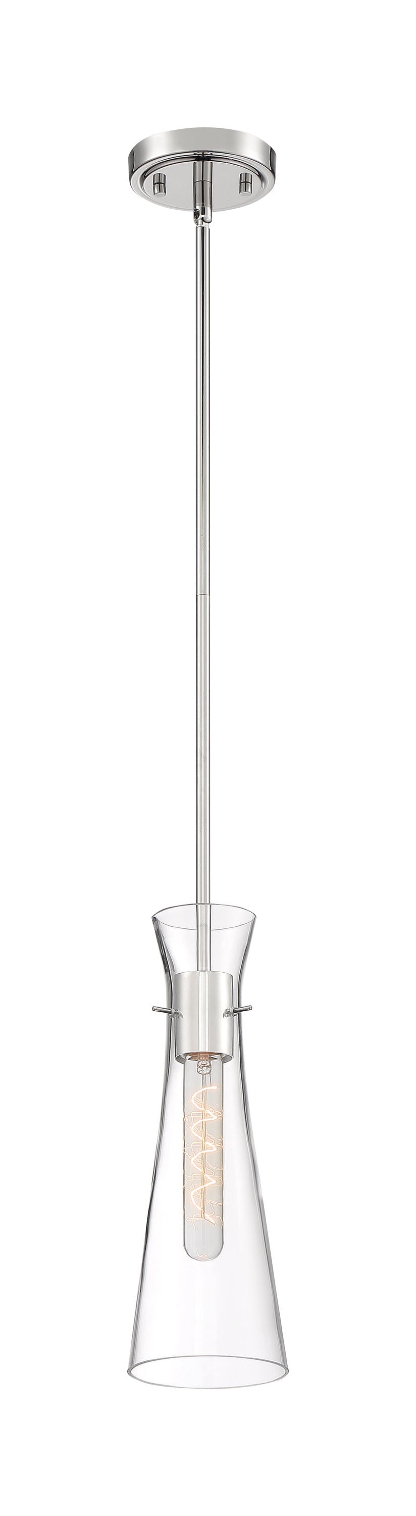 The Bahari one-light pendant sports a glass shade that resembles a tight waisted crystal clear, beaker that surrounds the single T9 light source. This provides a distinct visual appearance that is complemented by the Polished Nickel finish. The 14 inches length and 4 inches diameter glass is suspended by a three-point mount that extends from adjustable stems. The silhouette allows the Bahari to be used in both a single or multiple light application.