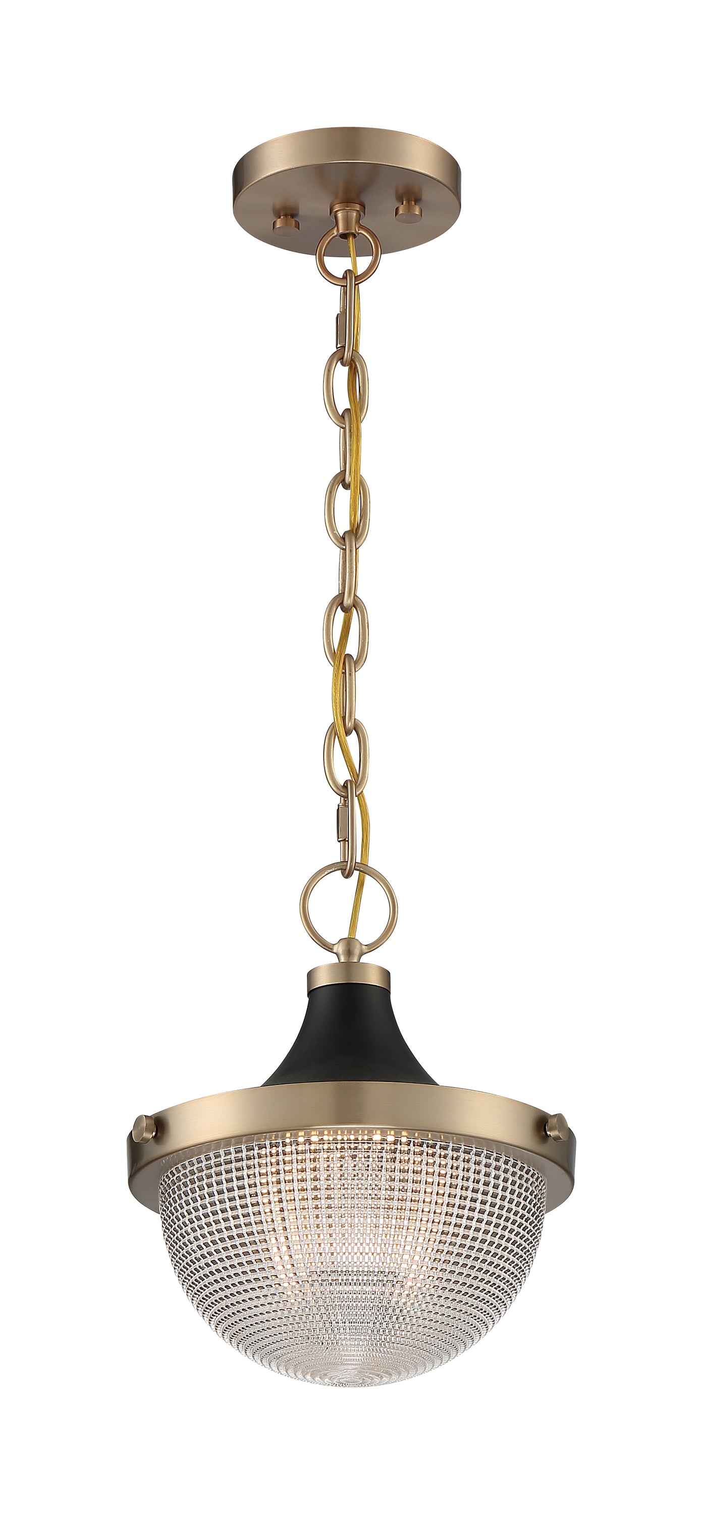 Faro is a streamlined, retro industrial design small one-light pendant that combines complementary finishes with vintage-styled prismatic glass. The Burnished Brass and Matte Black tones mimic a vintage fixture, while the clear prismatic glass diffuses the light that shines through. The Faro small pendant is 10 inches wide by 11.375 inches high, allowing it to stand alone or when several are grouped together makes an impactful design statement.