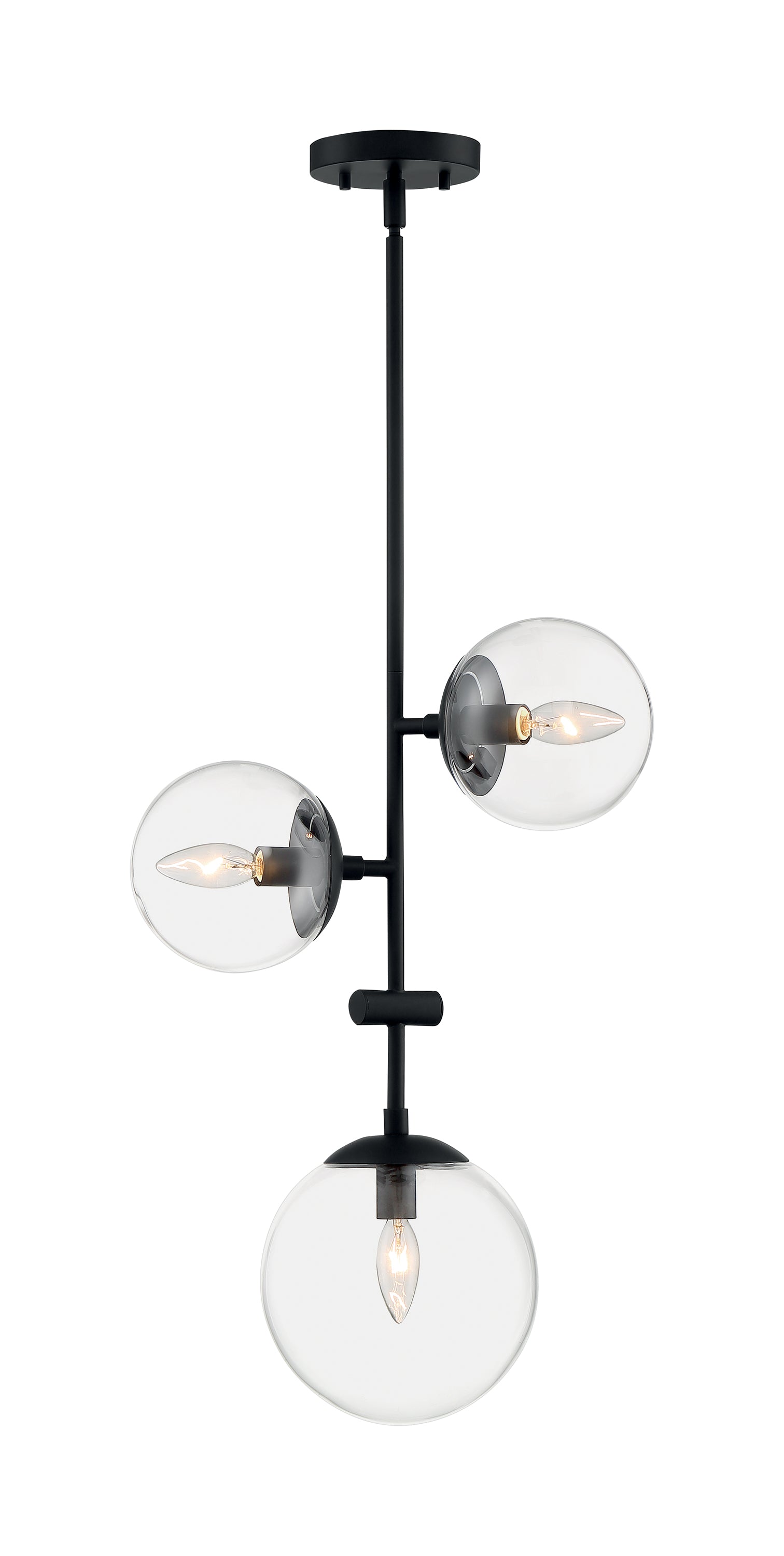 Sky is a modern pendant that is visually stimulating. The asymmetrical design of the Sky three-light pendant and the clear glass orbs that enclose the bulbs creates the feeling of floating illuminated bubbles. The ever-popular Matte Black finish amplifies the modern design. The Sky three-light pendant is 14.875 inches wide by 22.375 inches making it perfect as a single light source or can be grouped in multiples in a linear application.