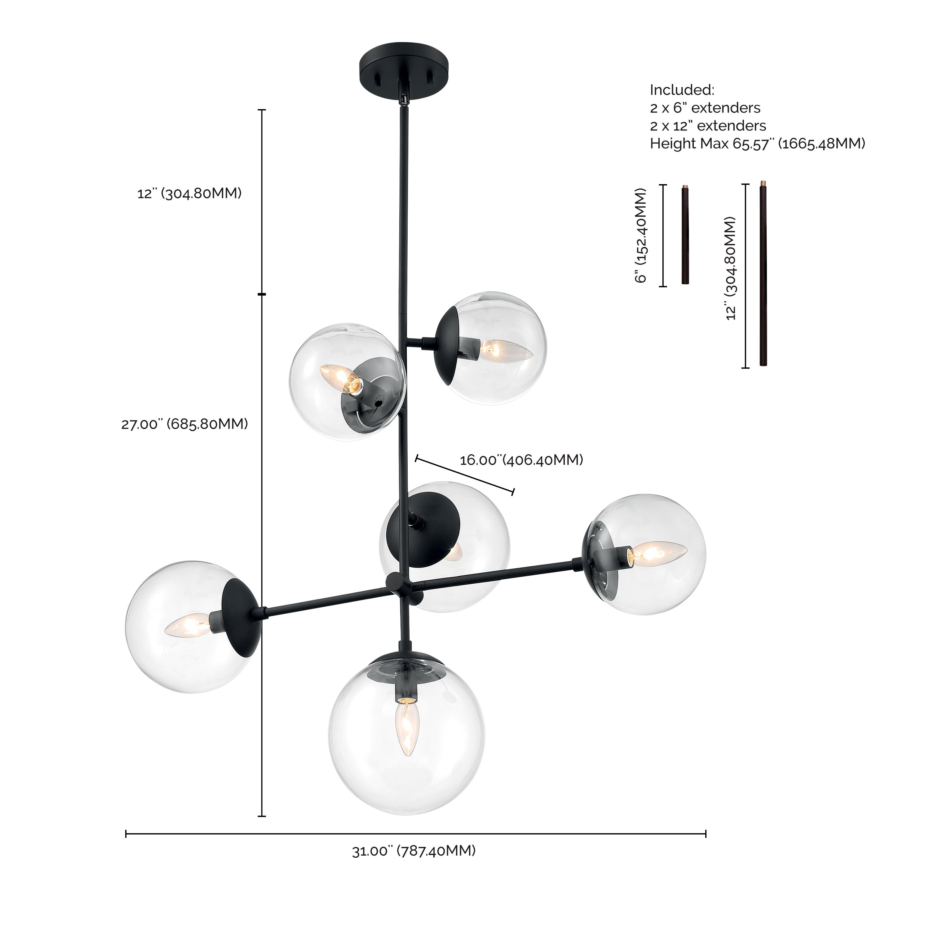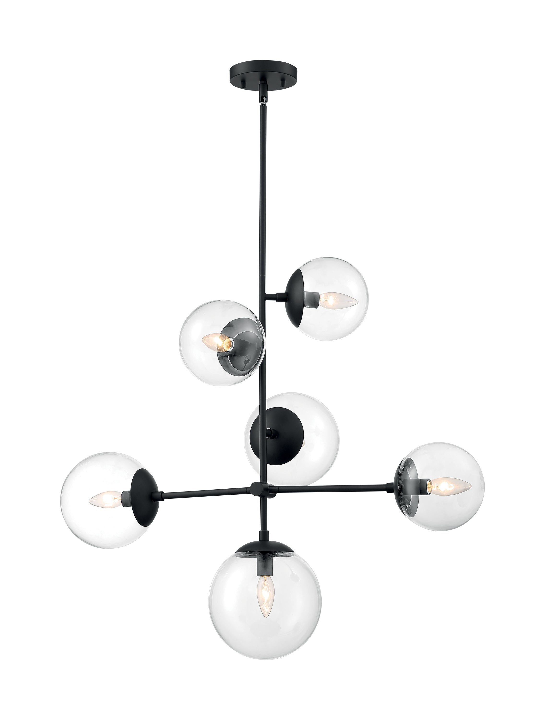 Sky is a modern pendant chandelier that is visually stimulating. The asymmetrical design of the Sky six-light pendant chandelier and the clear glass orbs that enclose the bulbs creates the feeling of floating illuminated bubbles. The ever-popular Matte Black finish amplifies the modern design. The Sky six-light pendant is 16 inches wide by 22.875 inches high with a 31 inches length making it perfect as a featured light source in a variety of interior applications.