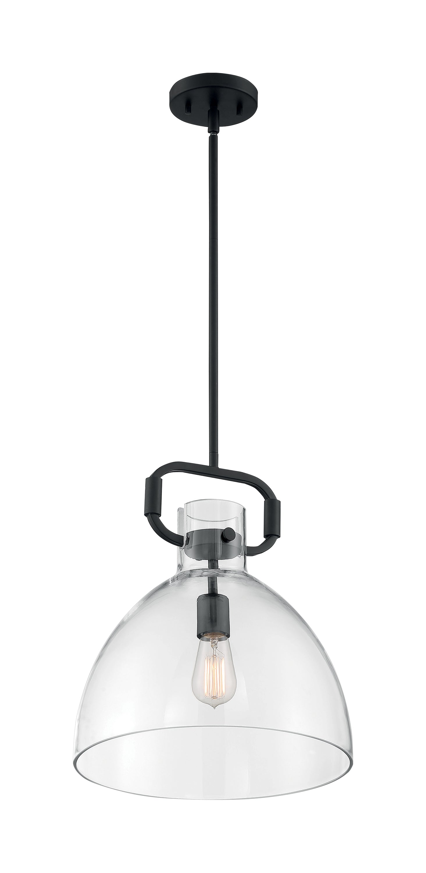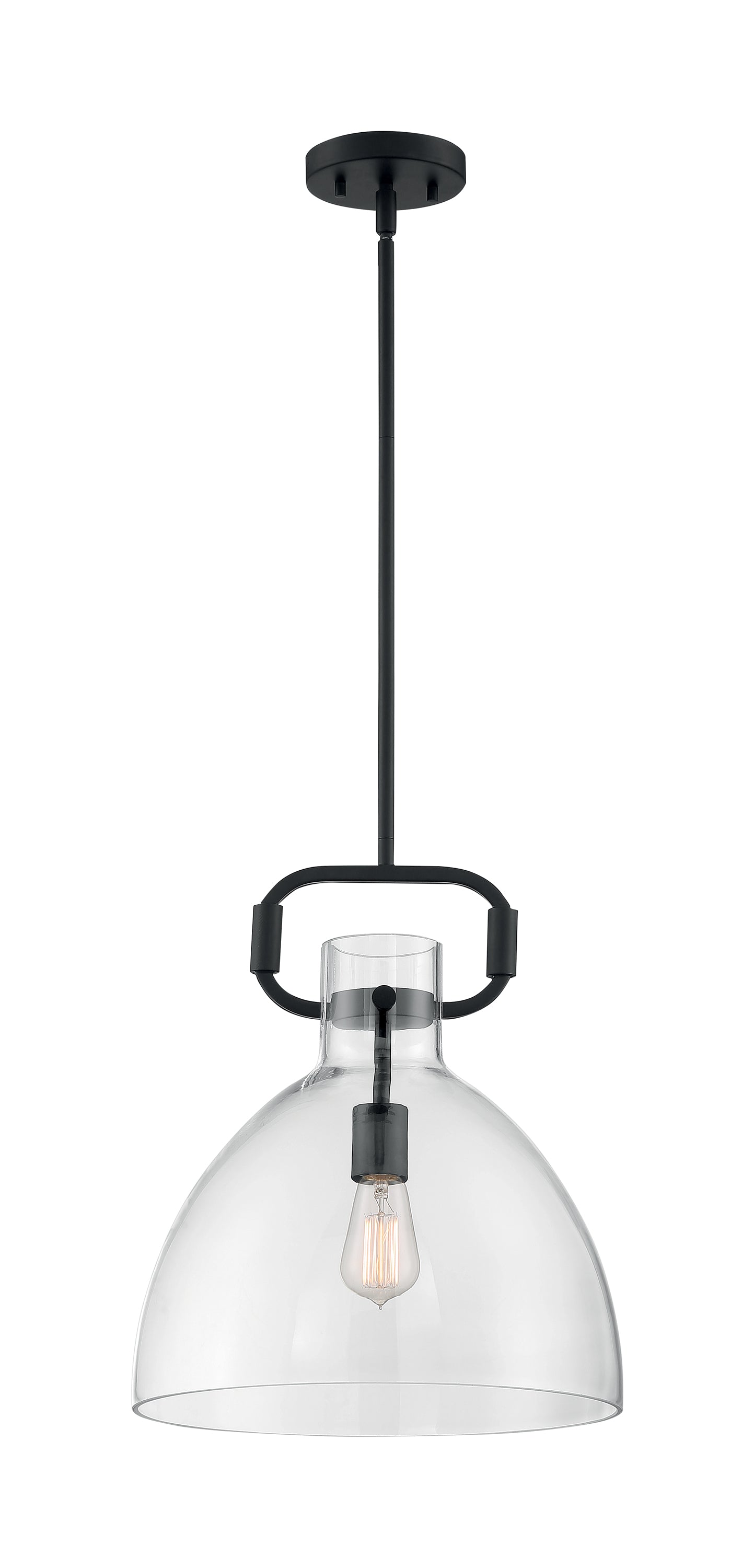 The Teresa 1 lite retro-industrial Bell Pendant measures 14 inches by 16-1/2 inches. With its clear glass shade and exciting transition to matte black hardware, this understated design is impressive with a nostalgic Edison Style Bulb. The Teresa Bell Pendant adds sophisticated style over a small round dining table or grouped in a linear fashion that will complement many applications.