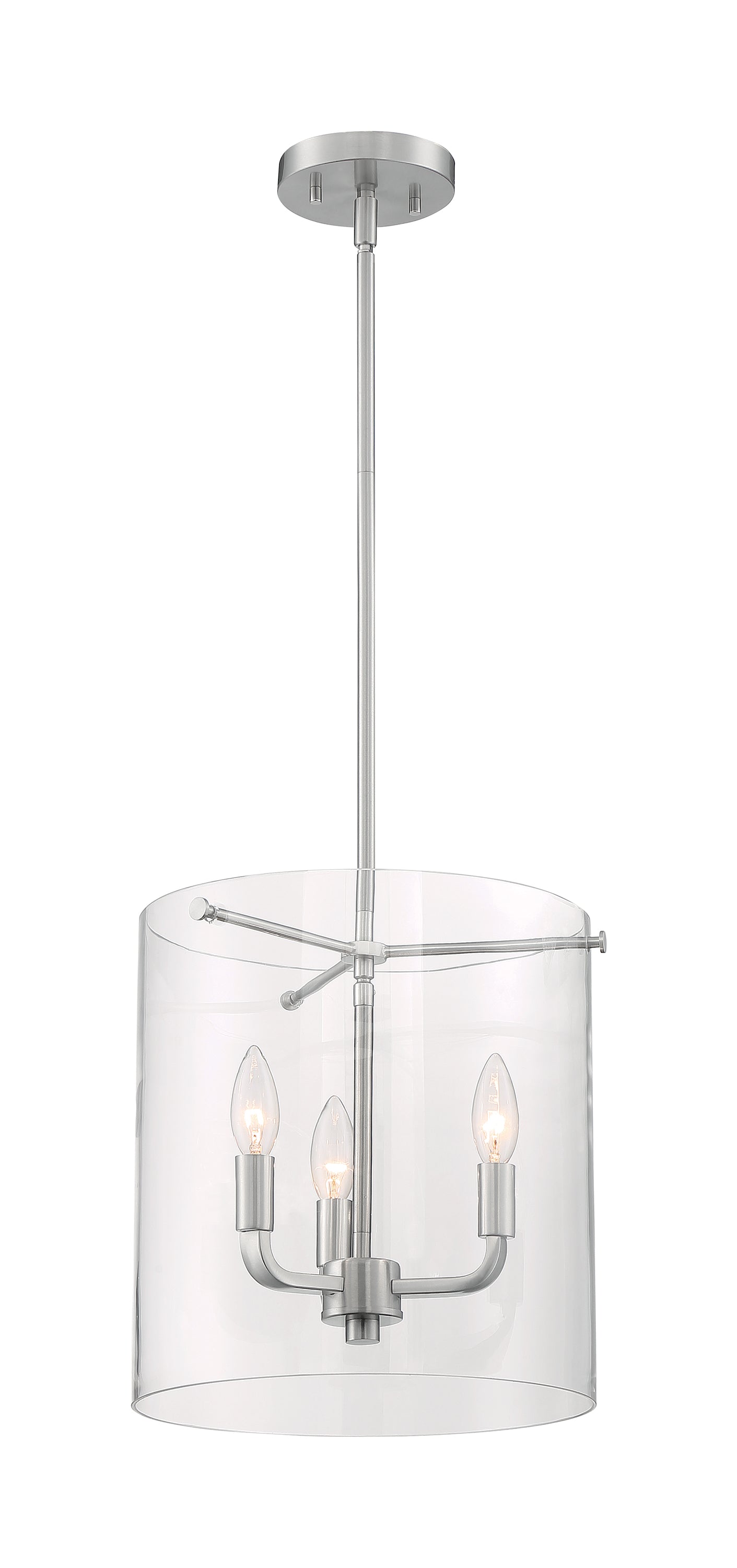 The Sommerset Brushed Nickel three-light pendant features a flat armed three-light cluster and a clear glass shade enclosure with decorative thumb screws. The sleek, streamlined appearance of the Sommerset pendant complements both modern and transitional styles. Sommerset can also be at home in a coastal setting. The 11.75 inches by 12.875 inches size makes Sommerset the perfect light source for any traditional or multiple pendant design.