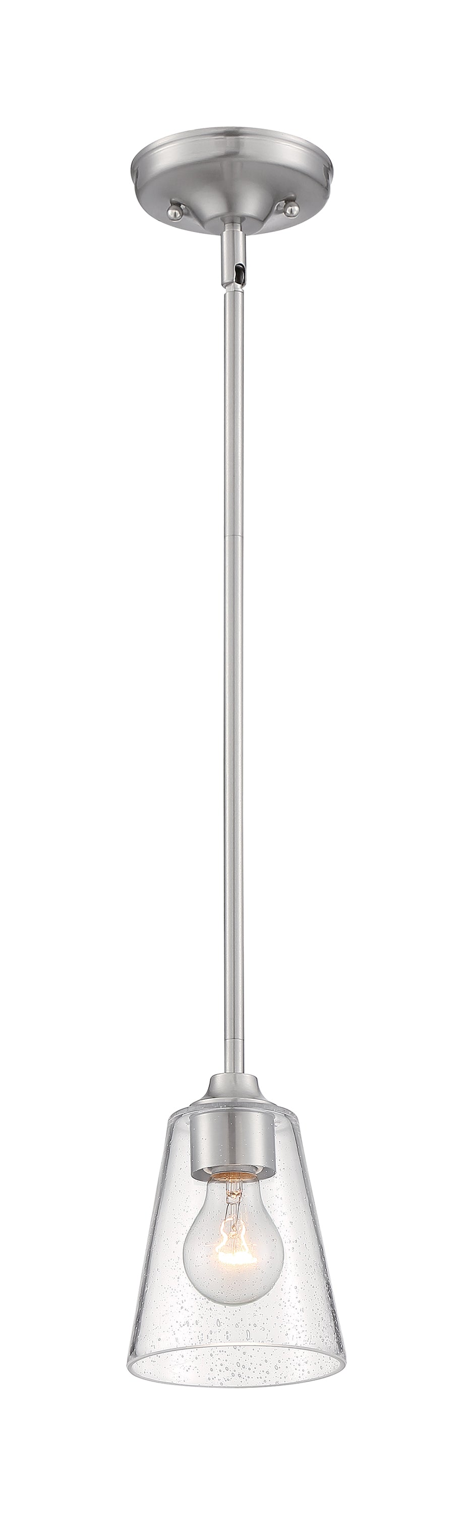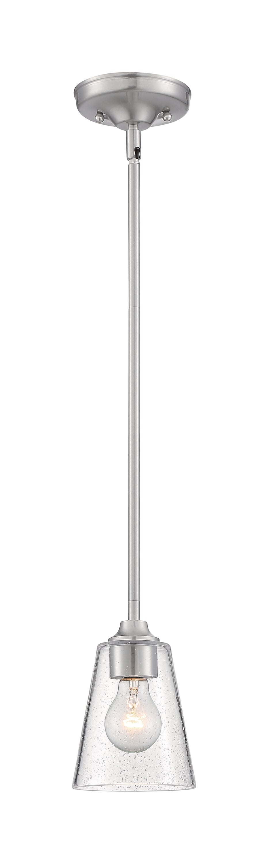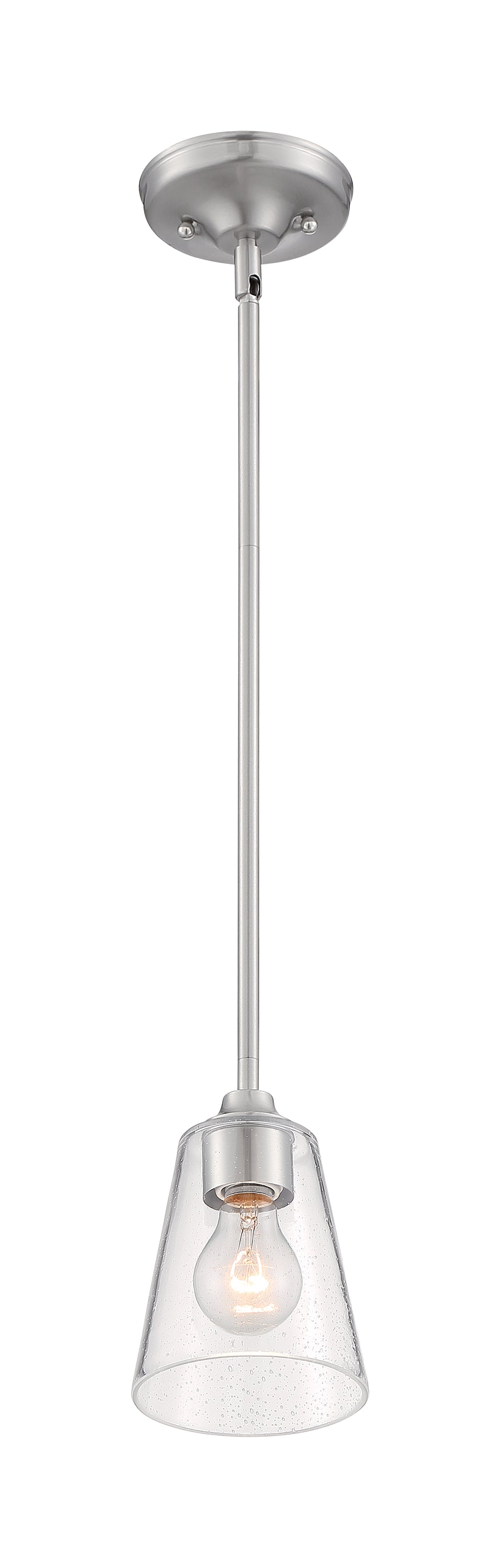 The seeded glass goblet shade accents the Brushed Nickel finish on the Bransel one-light mini pendant. The sleek, streamlined appearance of the Bransel compliments both the popular modern farmhouse style or can be at home in a coastal setting. Five inches wide, the Bransel can be a single light source or used in a multiple light application.