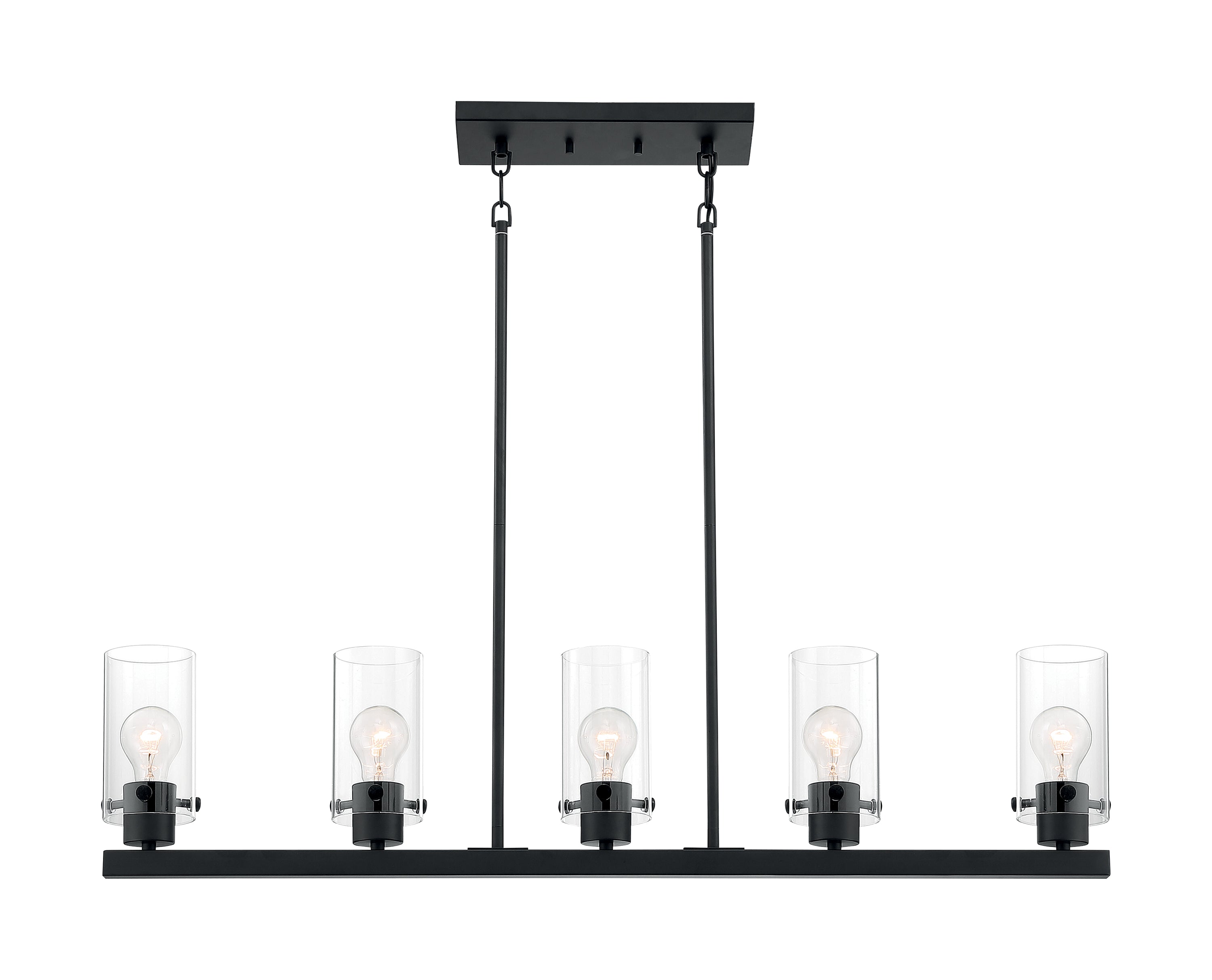 The Sommerset five-light island pendant complements both modern and transitional styles. Five bulbs sit inside clear glass, for a sleek, streamlined design. The Sommerset is the perfect light source over an island or other linear designs.
