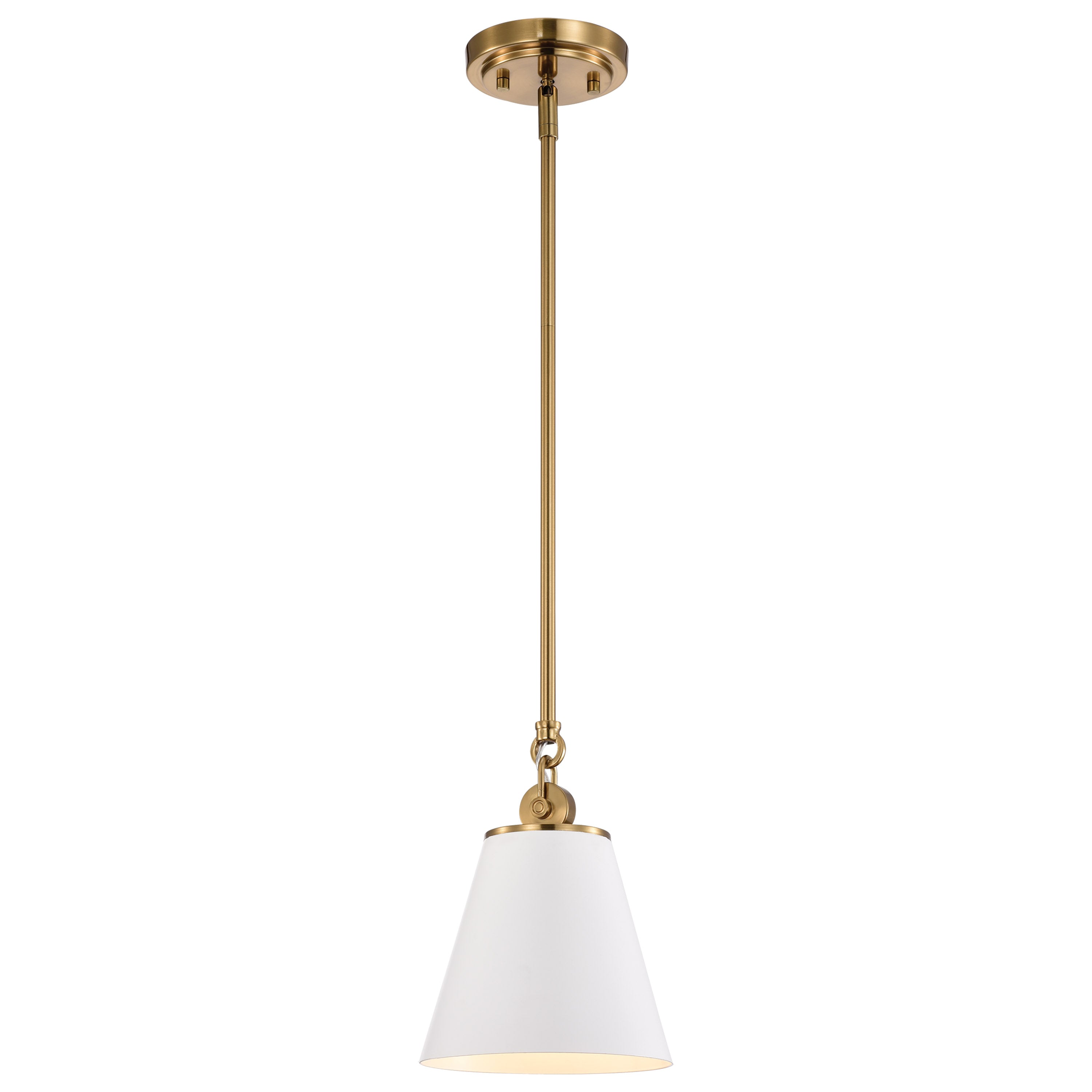 With subtle detailing, the Dover mini pendant is graceful yet unassuming. The simple white shade features a white lining to reflect the light, and the trim is finished in vintage brass to match the fixture's body. Place a trio of them over a kitchen island for added light or over nightstands in a bedroom as a permanent lighting solution.