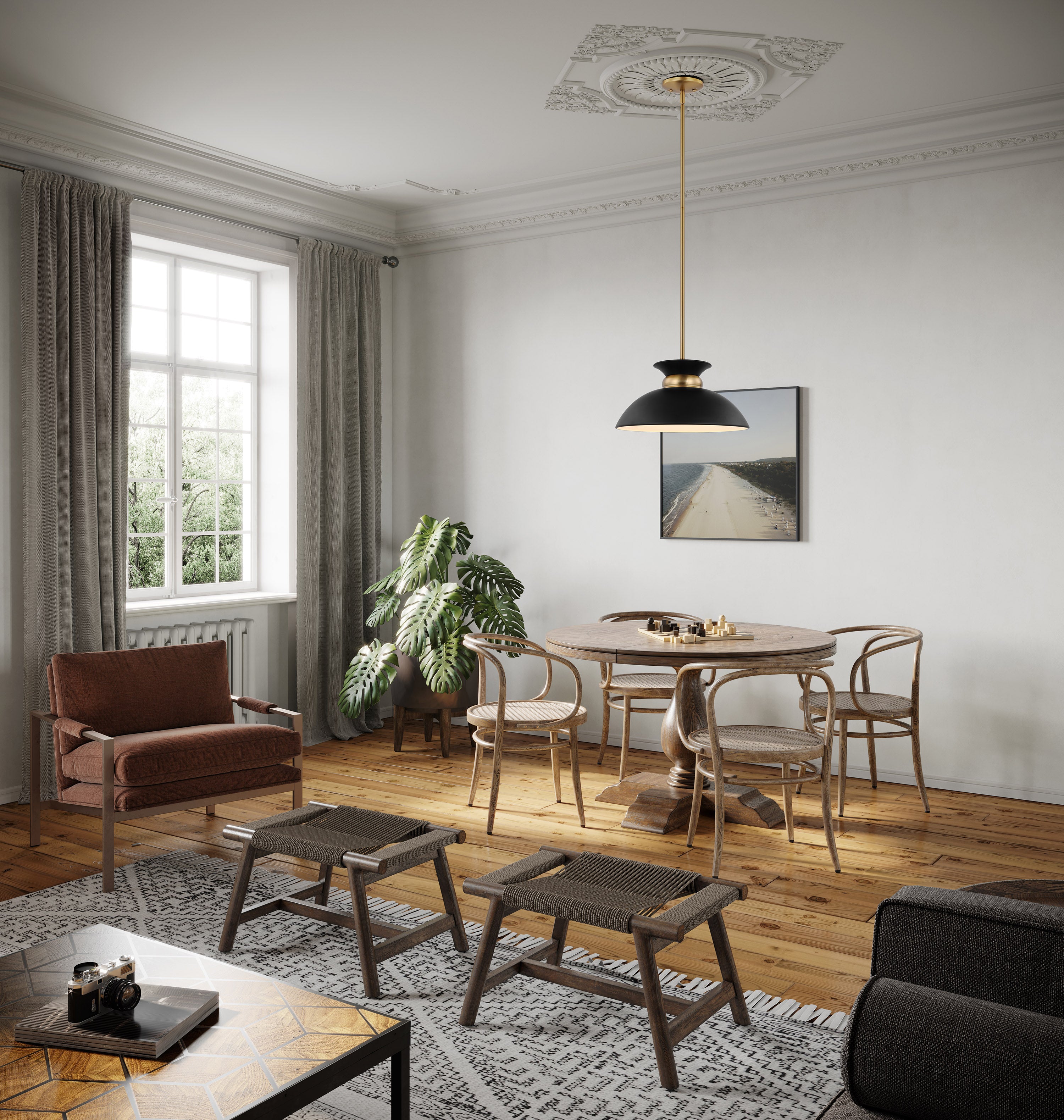 The simplistic design of the Perkins small pendant is understated, yet refined. The decorative burnished brass band on the shallow-dome metal shade cinches at the top, creating the illusion of a swirling skirt. The white interior of the shade provides maximum light reflection and is complemented with a matte black finish on the exterior. No longer just for the kitchen, this beautiful pendant will give any room in your home a facelift.