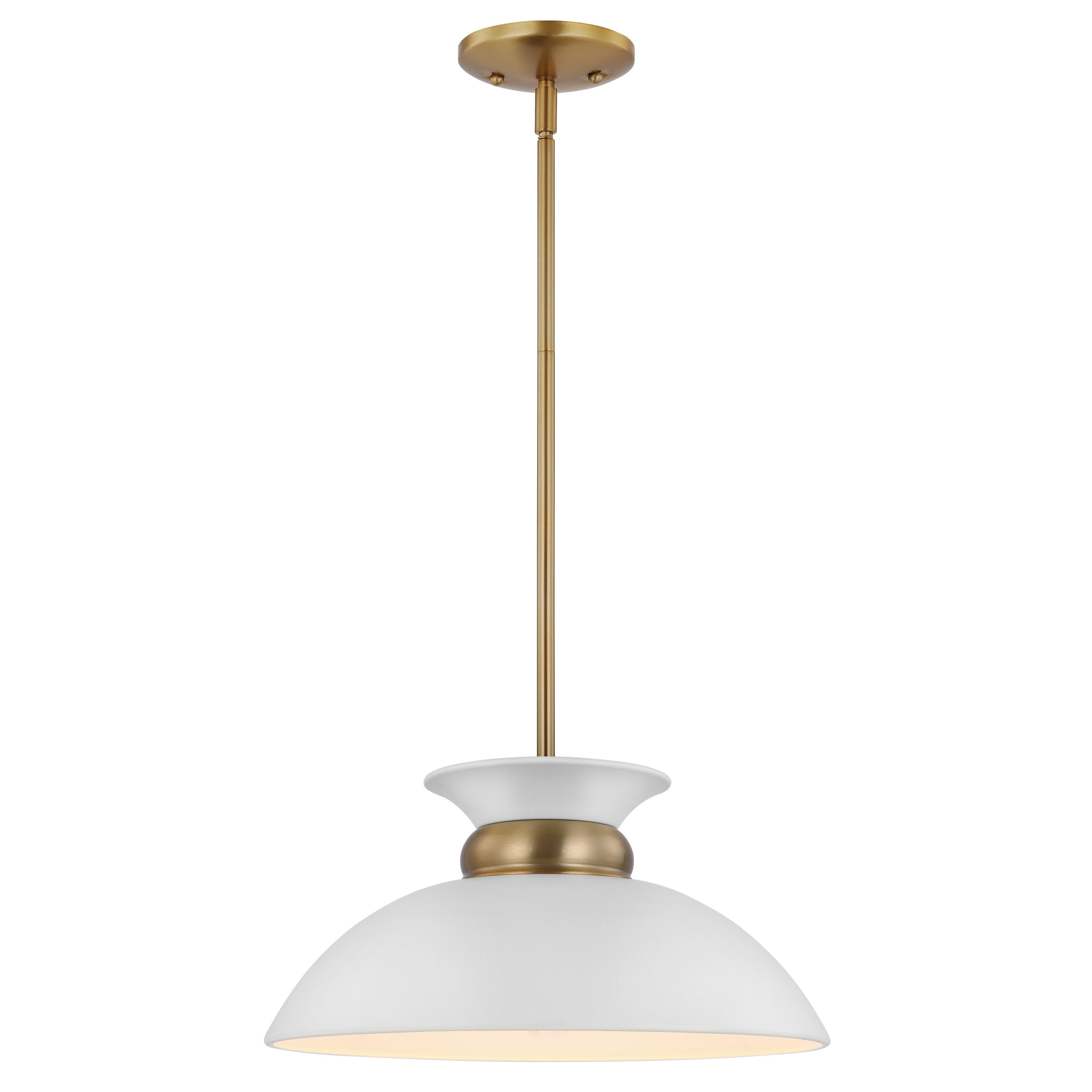 The simplistic design of the Perkins small pendant is understated, yet refined. The decorative burnished brass band on the shallow-dome metal shade cinches at the top, creating the illusion of a swirling skirt. The white interior of the shade provides maximum light reflection and is complemented with a matte white finish on the exterior. No longer just for the kitchen, this beautiful pendant will give any room in your home a facelift.