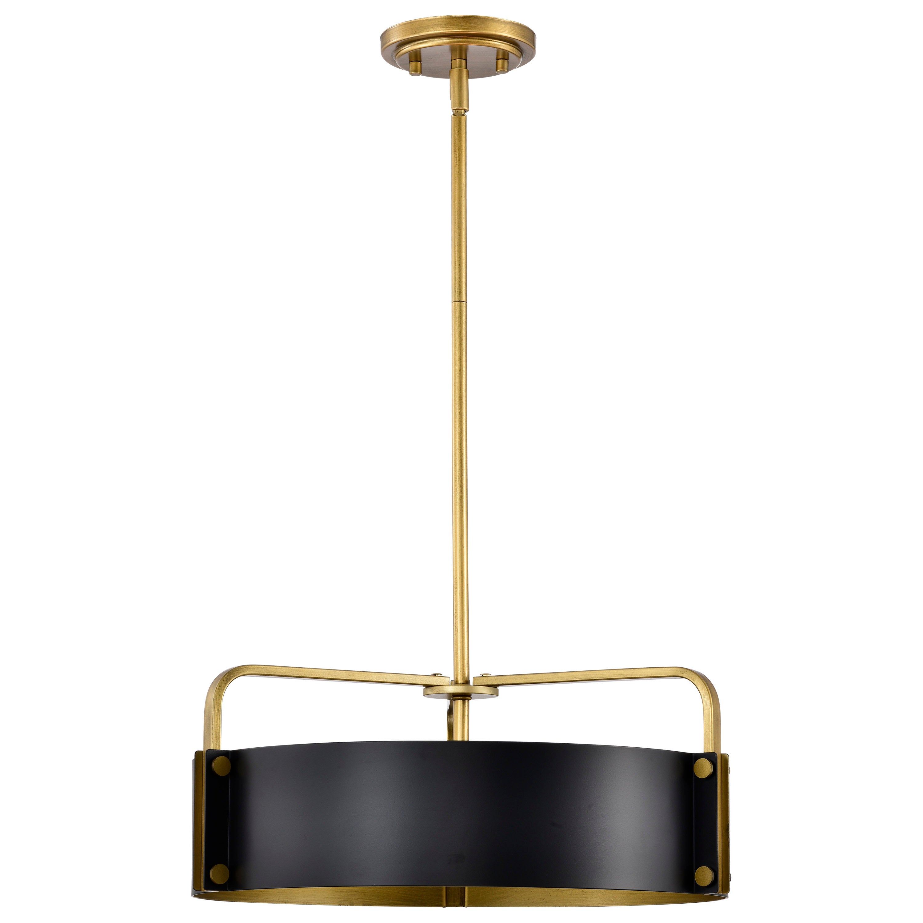 The Altos Collection adds a touch of drama and intrigue to any space. The natural brass accents provide a warmth to the industrial-inspired construction, which is finished in a velvety, matte black. The meticulous attention to detail in the laser-cut shade and matching rivets provide Altos with its signature style and refined design. Effortlessly blending traditional with modern aesthetics, elevate your surroundings with a functional flush mount or stunning pendant.