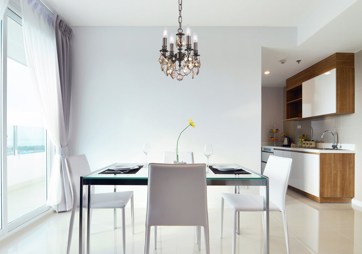 Lillie collection hanging fixtures radiate glamor and sparkle in a compact design that includes an attractive etched base in dark bronze, French gold, and pewter. Undulating branches leading to three or four candelabra bulbs (not included) are highlighted by hanging pendeloque crystals. Additional crystal strands create a circular wall of light at the bottom of this sophisticated design, accented by a lovely crystal bead at the bottom. Create a stunning focal point in your dining room, living room, bedroom, bathroom, and entryway with a Lillie collection hanging fixture. Elegant-cut, royal-cut, Swarovski Elements, or Swarovski Spectra crystal trims are available in golden teak and crystal to match your décor.