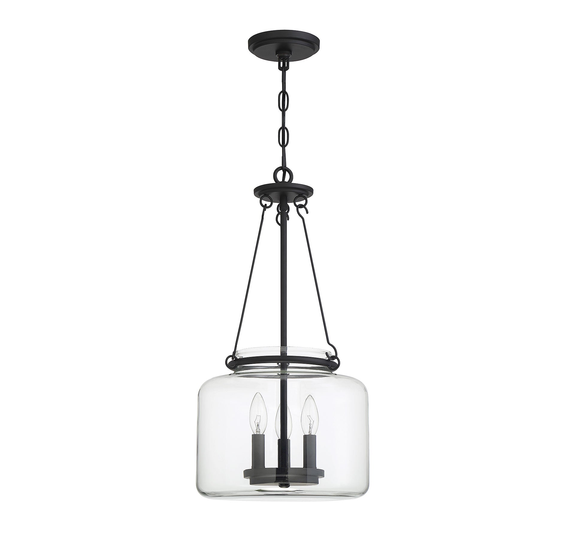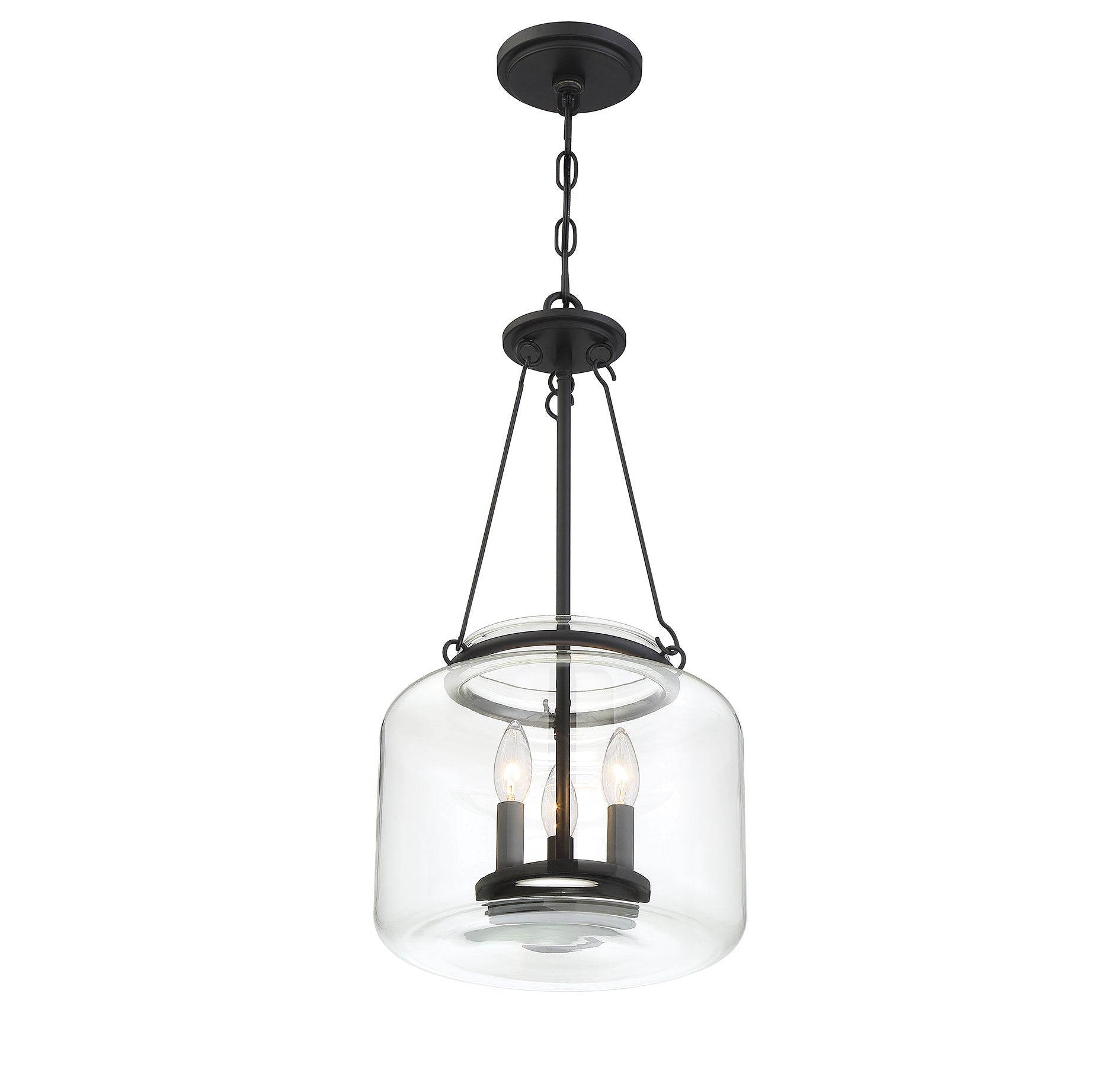 Created exclusively for Savoy House by designer Brian Thomas, the Akron pendant proves that a classic, simple style can be stunning! The clear glass shade surrounds an inner disc-shaped light structure with three metal candle covers finished in matte black. It has a comfortable, nostalgic appeal that blends very well with transitional, traditional, vintage and other decor styles. Three 60W candelabra size bulbs provide plenty of illumination through the pristine clear glass. The Akron measures 12" wide and 24" high and it brings a touch of vintage inspiration to your dining room, kitchen, living room, foyer, family room, office, bedroom, stairway or great room.