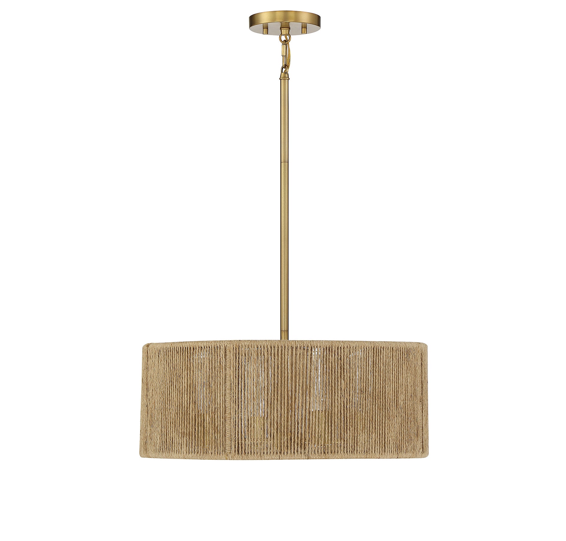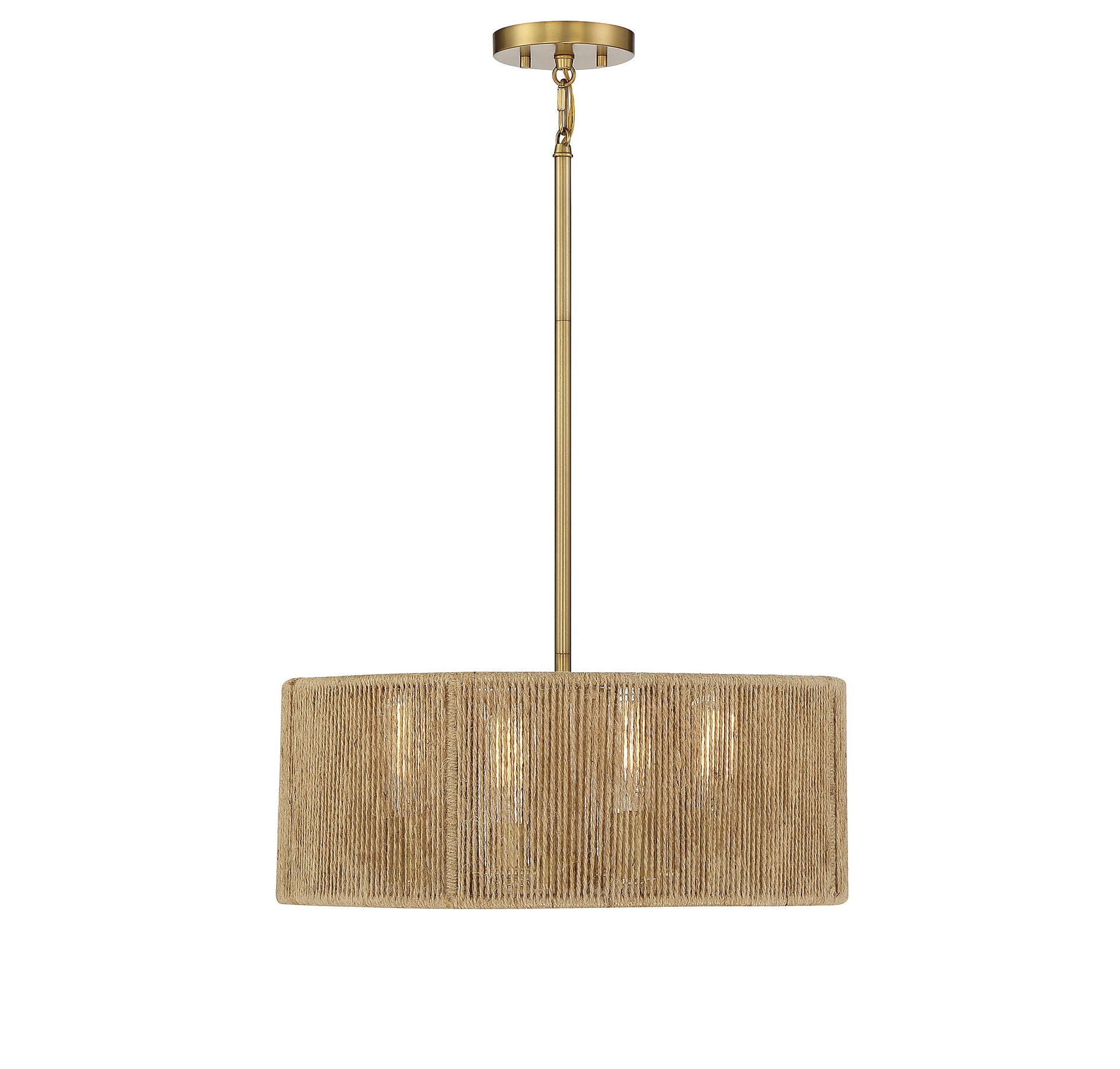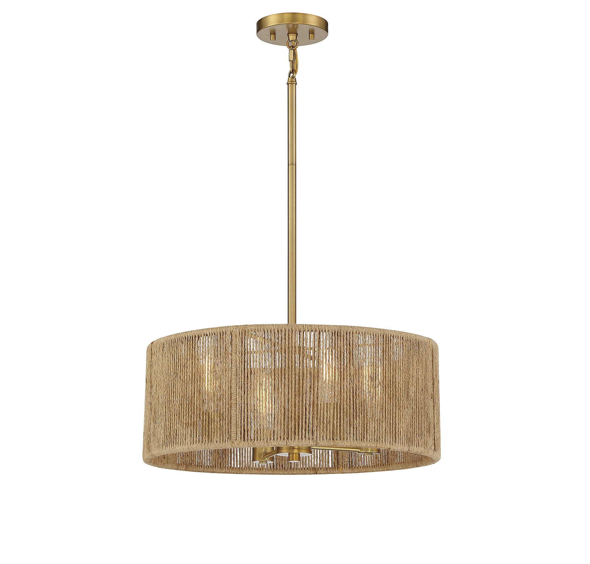 This Savoy House Ashe 4-light pendant has a warm, organic design. Its drum shade is strung with rows of textured rope, allowing light to shine through and providing a stylish look even when the lights are off. Finished in warm brass. Ashe is 20" in width and has an adjustable height ranging from 14" to 60". It uses four standard size bulbs with a max of 60 watts per bulb. Comes with four 12" downrods and one 6" downrod, plus 80" of cord.