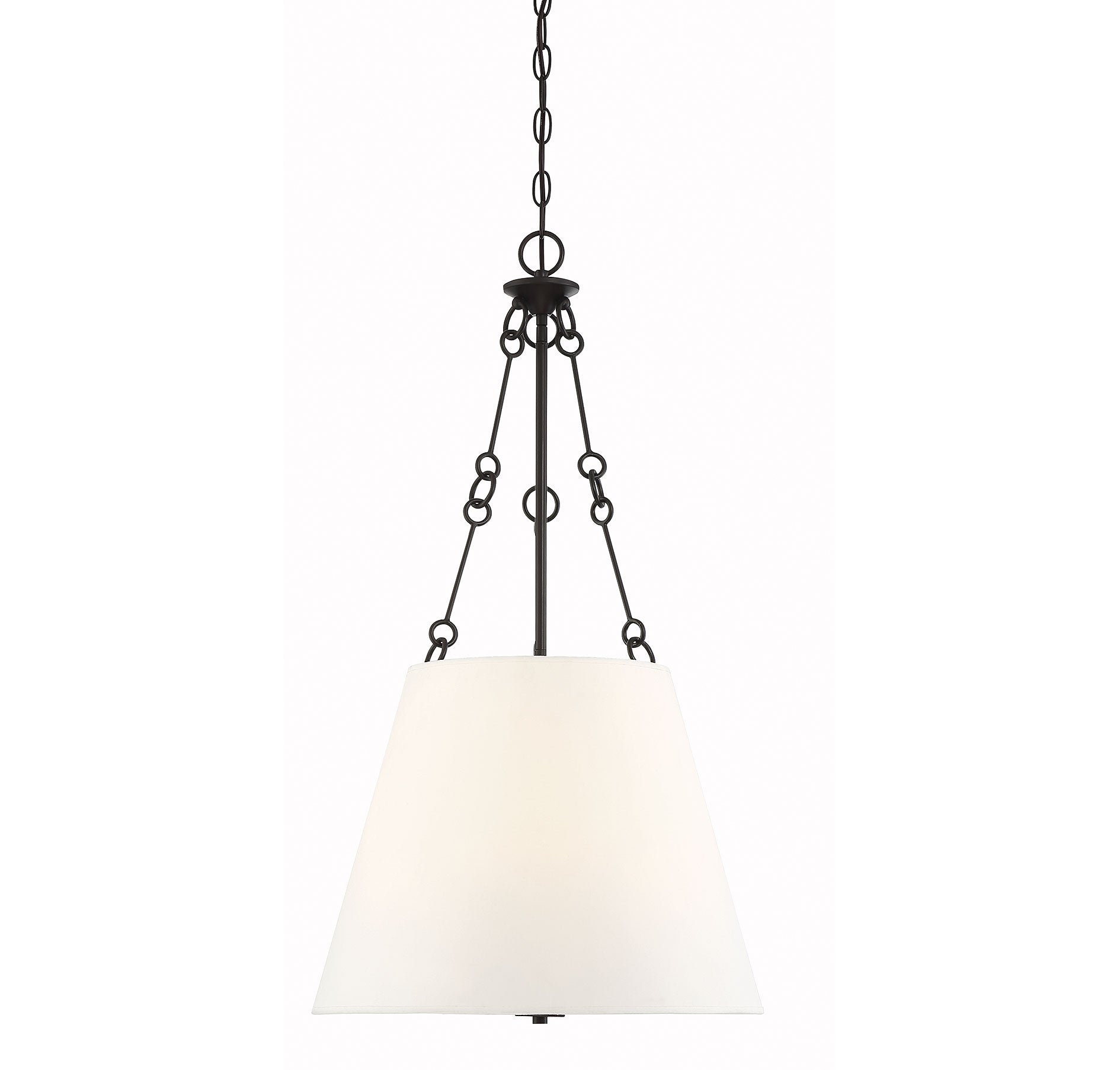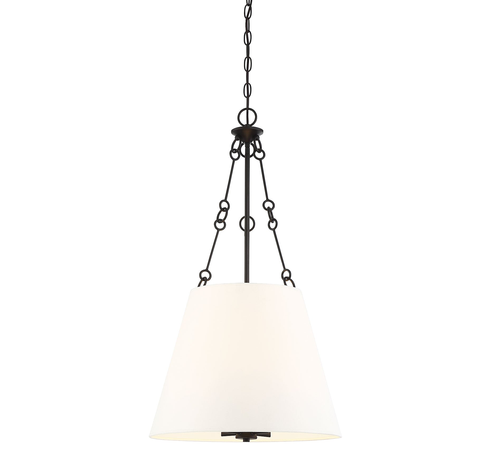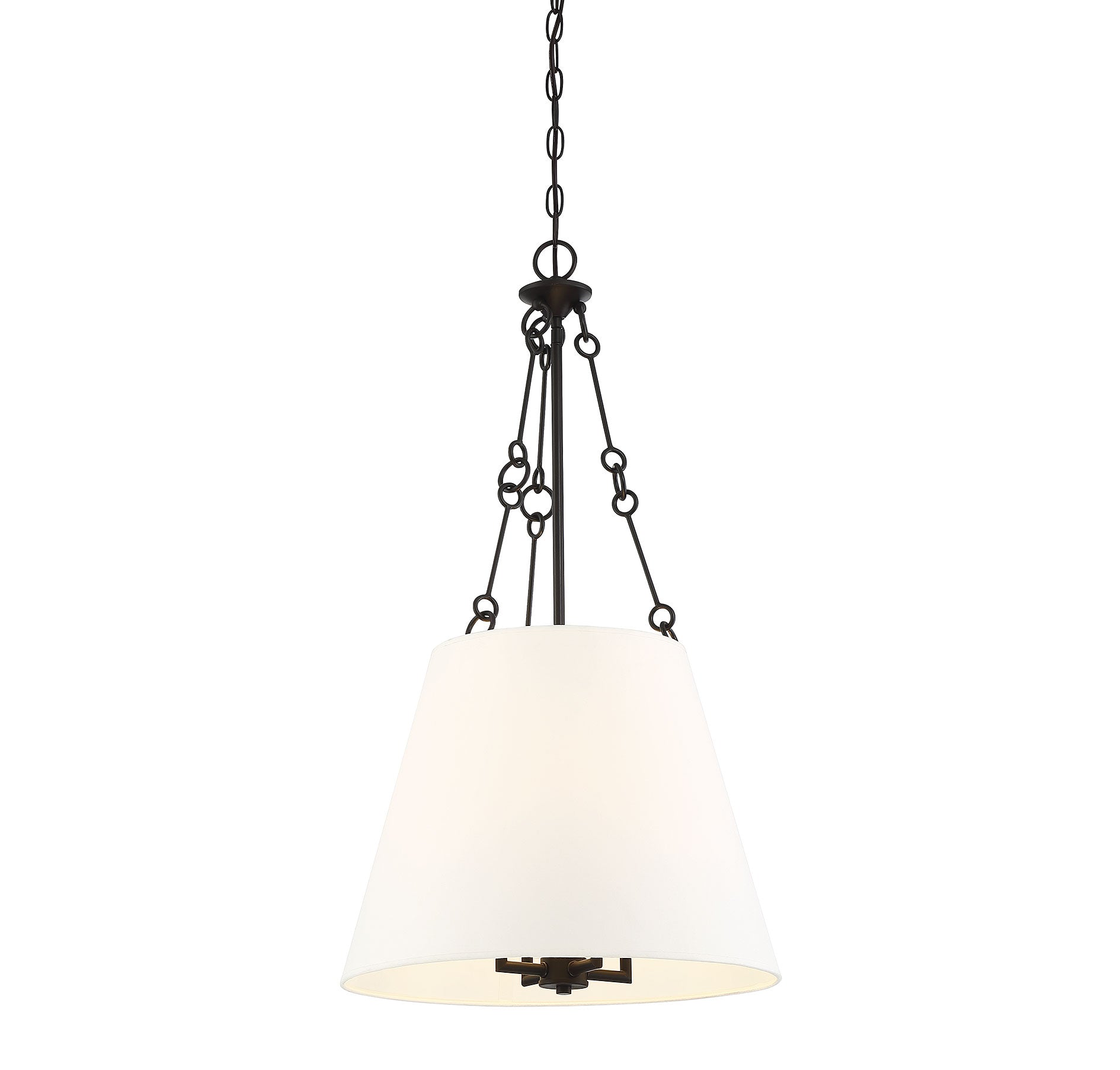 This Savoy House Austin 4-light pendant has a crisp and transitional style with a large white fabric shade that obscures the light sources, creating a soft and comfortable glow. English bronze finish. Pendants are extremely versatile and can fit in many different spaces, such as kitchens, family rooms, great rooms, foyers, entryways, offices, bedrooms and bathrooms. Because this pendant is chain-hung, you can use as much or as little chain as you need to fit your specific hanging height needs, and this pendant can be used on a sloped ceiling. Bulb not included. You can pair Austin with hardware finished in bronze or mix it with hardware in other finishes. Its subtle elegance means it is a perfect choice for rooms of any decor style. When you choose a Savoy House lighting fixture, you can be certain you've selected a piece that will withstand the test of time.