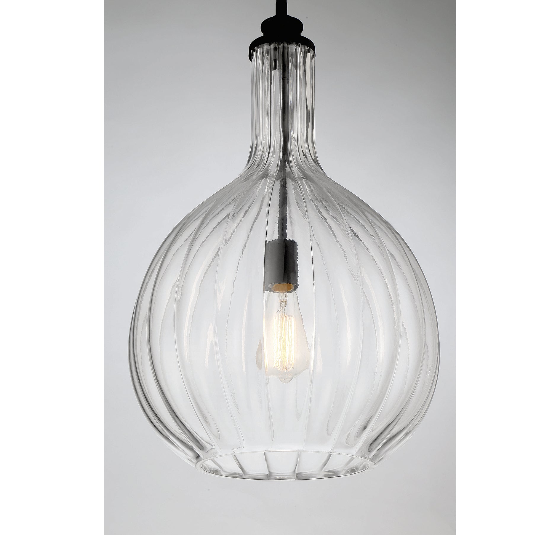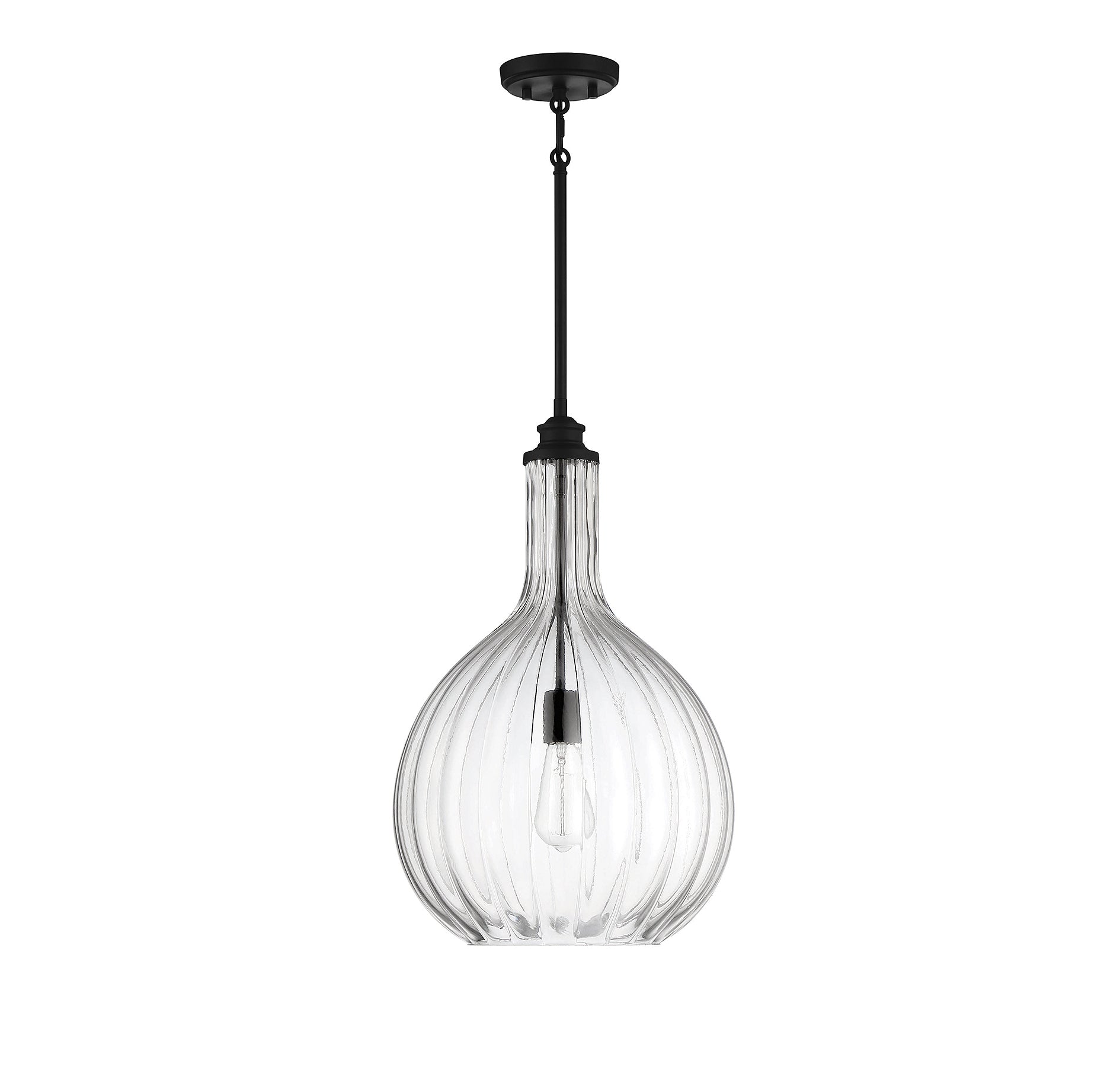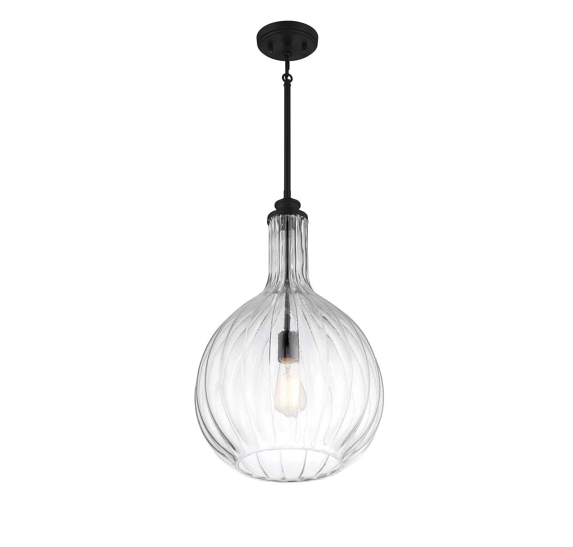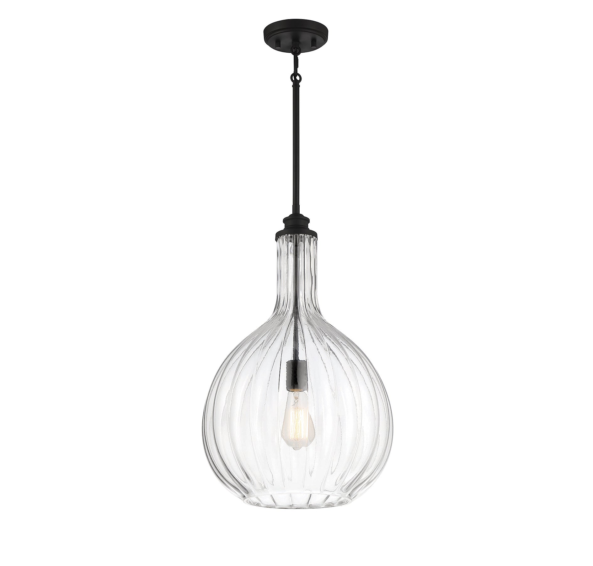 The generously proportioned Brandon collection brings a clean look to any space with a clear, fluted blown glass shade and matte black accents. This one-light pendant has an adjustable height from 28" to 74" and provides illumination from one 60-watt standard size bulb.