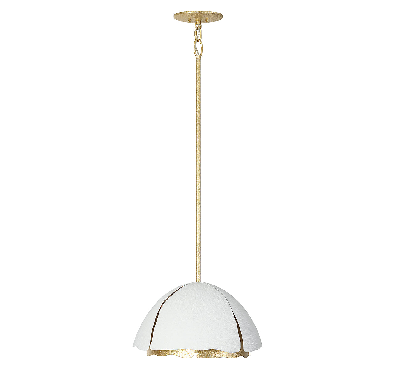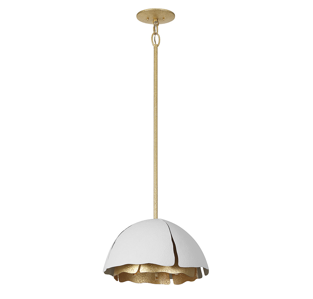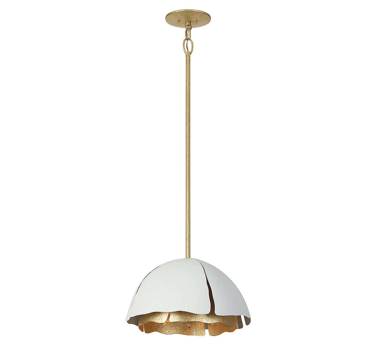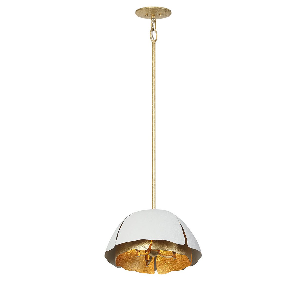The Savoy House Brewster 3-light pendant showcases a softly beautiful look inspired by a blooming flower. Its curving metal petals are finished in cavalier gold and royal white to create a winning combination. Brewster is 9.3" in height and 16" in width. It uses 3 candelabra size bulbs of up to 60 watts per bulb (bulbs not included). Comes with four 12" downrods and one 6" downrod.