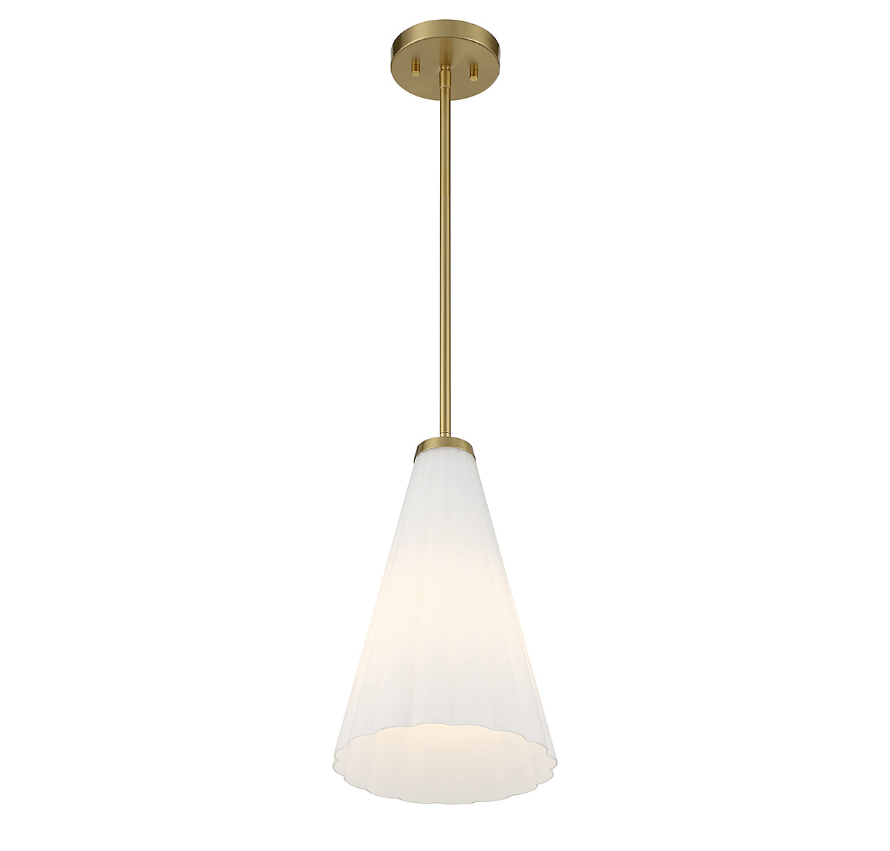 With its elegantly fluted shade of white opal glass and a warm brass finish, this Savoy House Bristol 1-light pendant is a beautiful way to boost the light and style of a room. Use it solo or in groupings! Bristol is 9" in width and has an adjustable height ranging from 15.5" to 69". Comes with four 12" downrods and one 6" downrod. Uses 1 standard size bulb with a max of 60 watts (bulb not included).