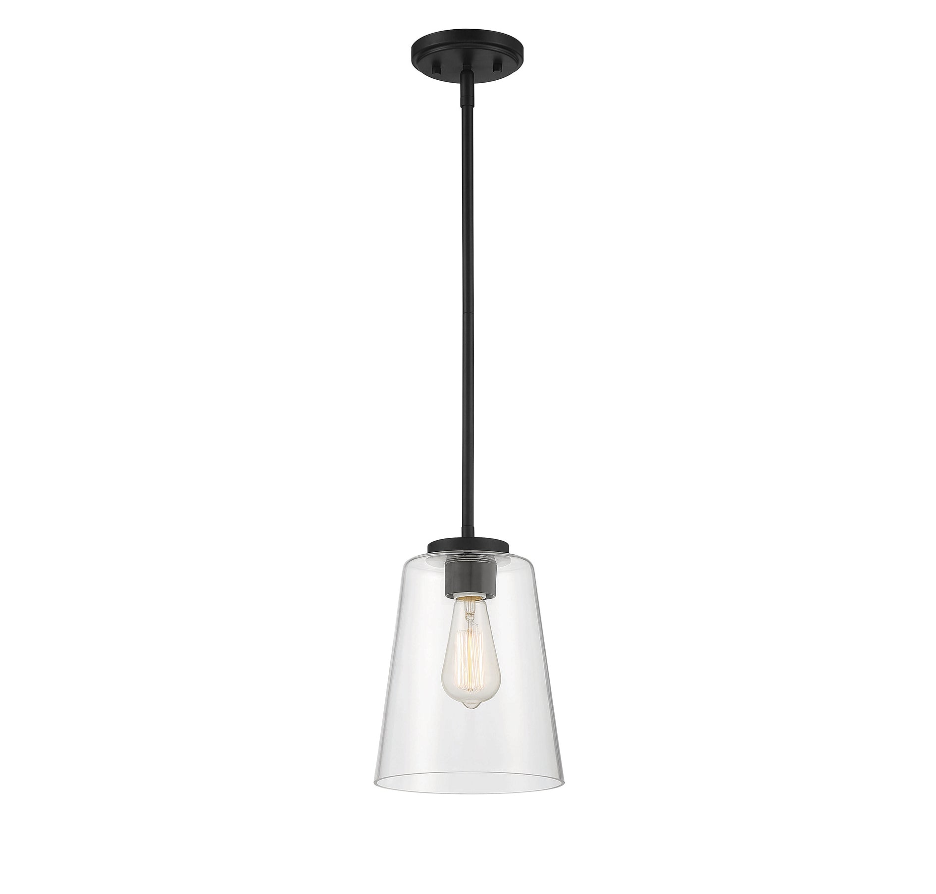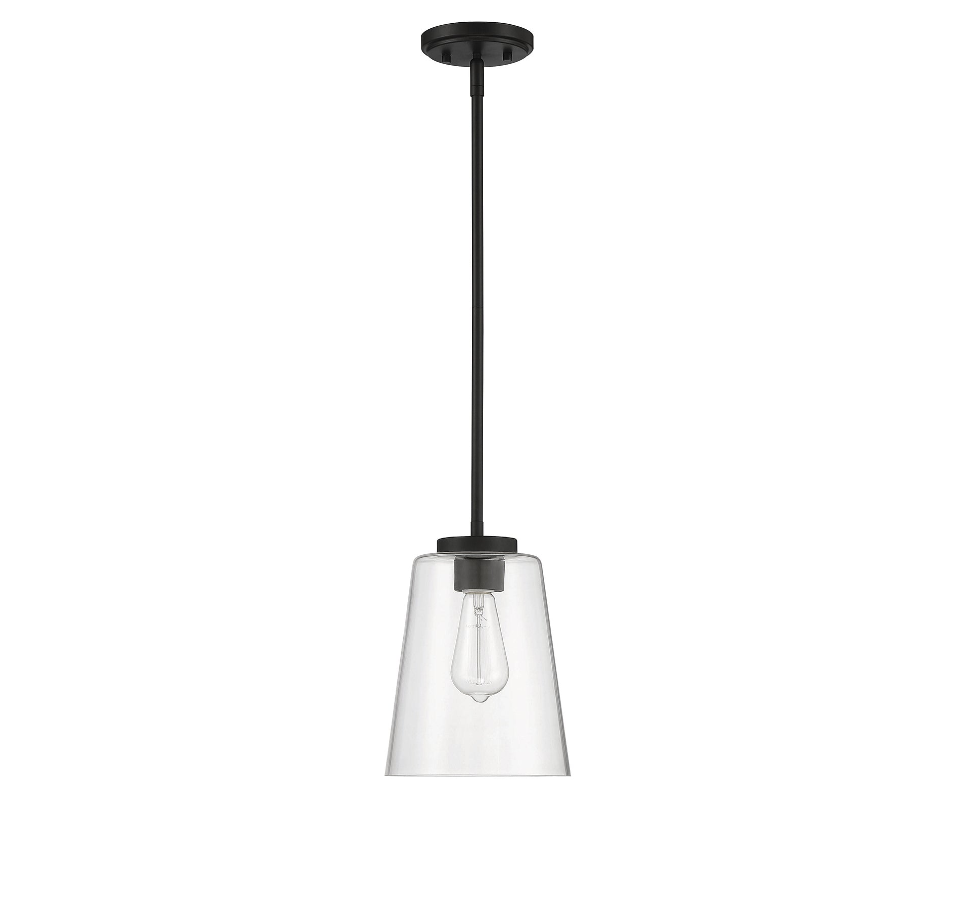 The Calhoun collection is distinguished by simple lines that can easily enhance transitional and contemporary decor. With an adjustable height from 20.5" to 39.5" and measuring 8" wide, this one-light large pendant offers a clean silhouette in a matte black finish and clear glass shade. It is illuminated by one 60-watt standard size bulb.