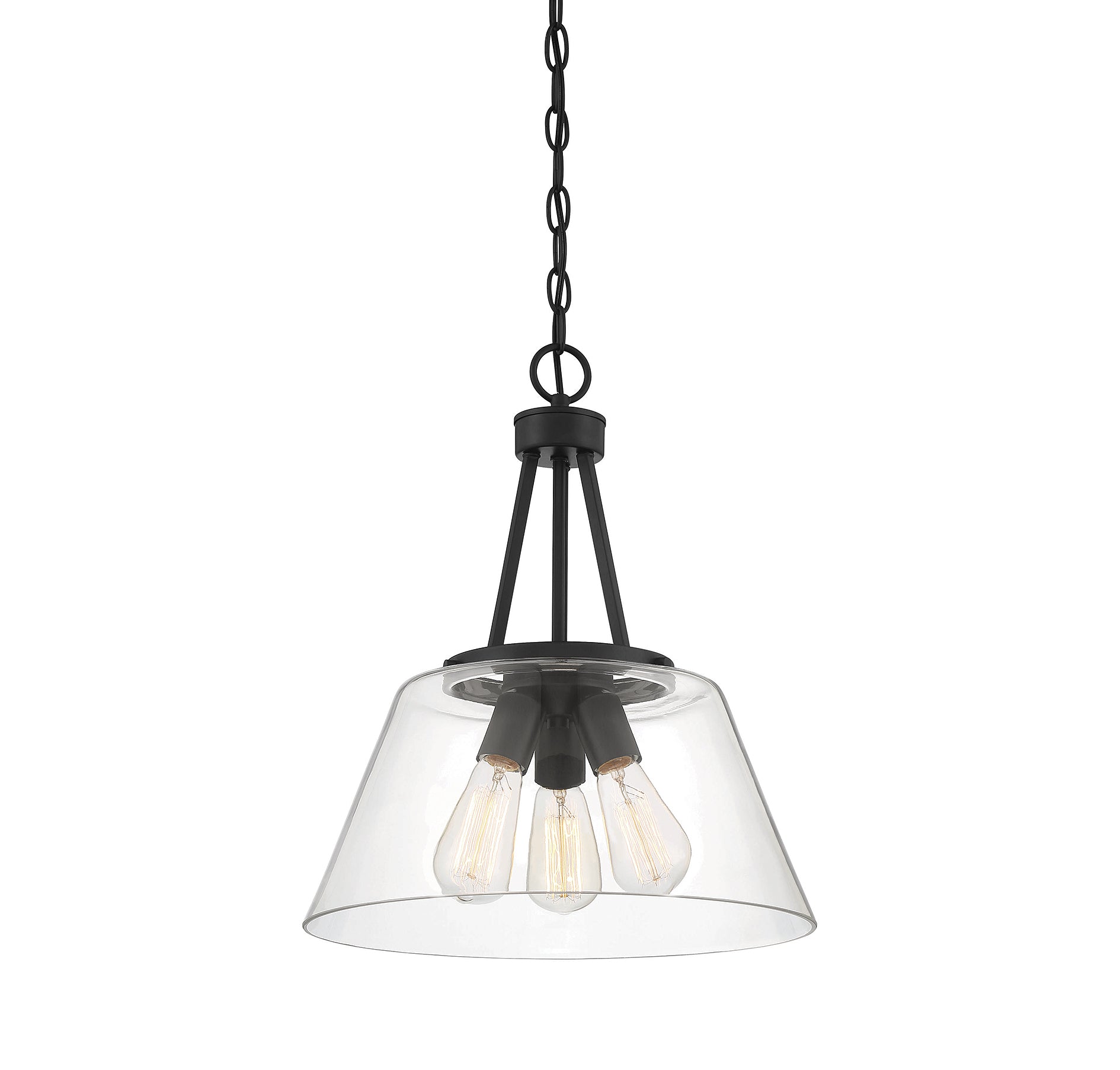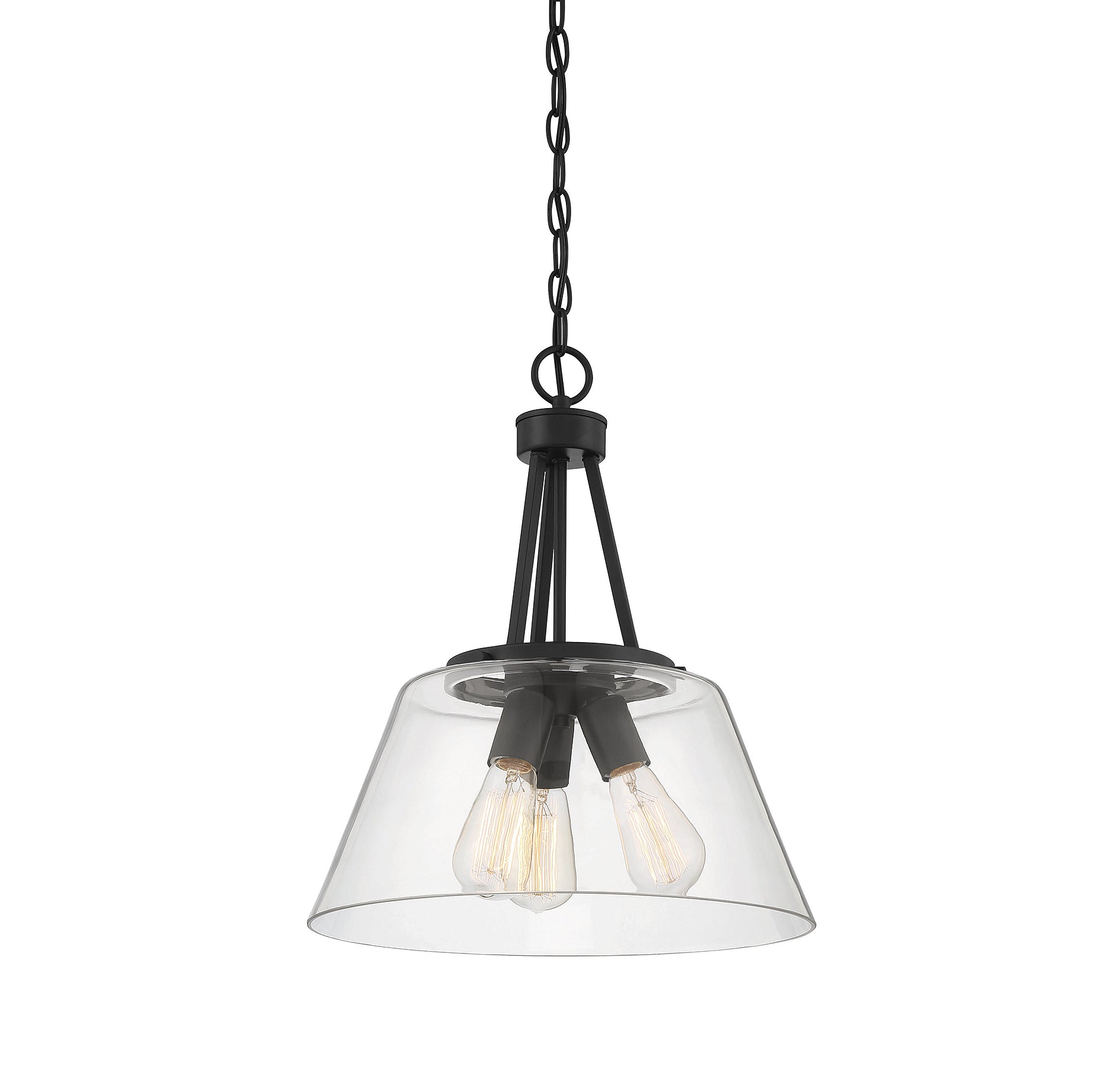 The Calhoun collection is distinguished by simple lines that can easily enhance transitional and contemporary décor. Measuring 18" high x 15" wide, this three-light pendant offers a clean silhouette in a matte black finish and clear glass shades. It is illuminated by three 60-watt standard size bulbs.
