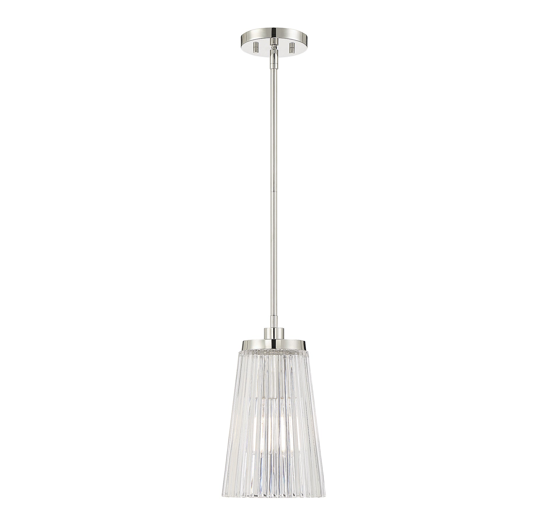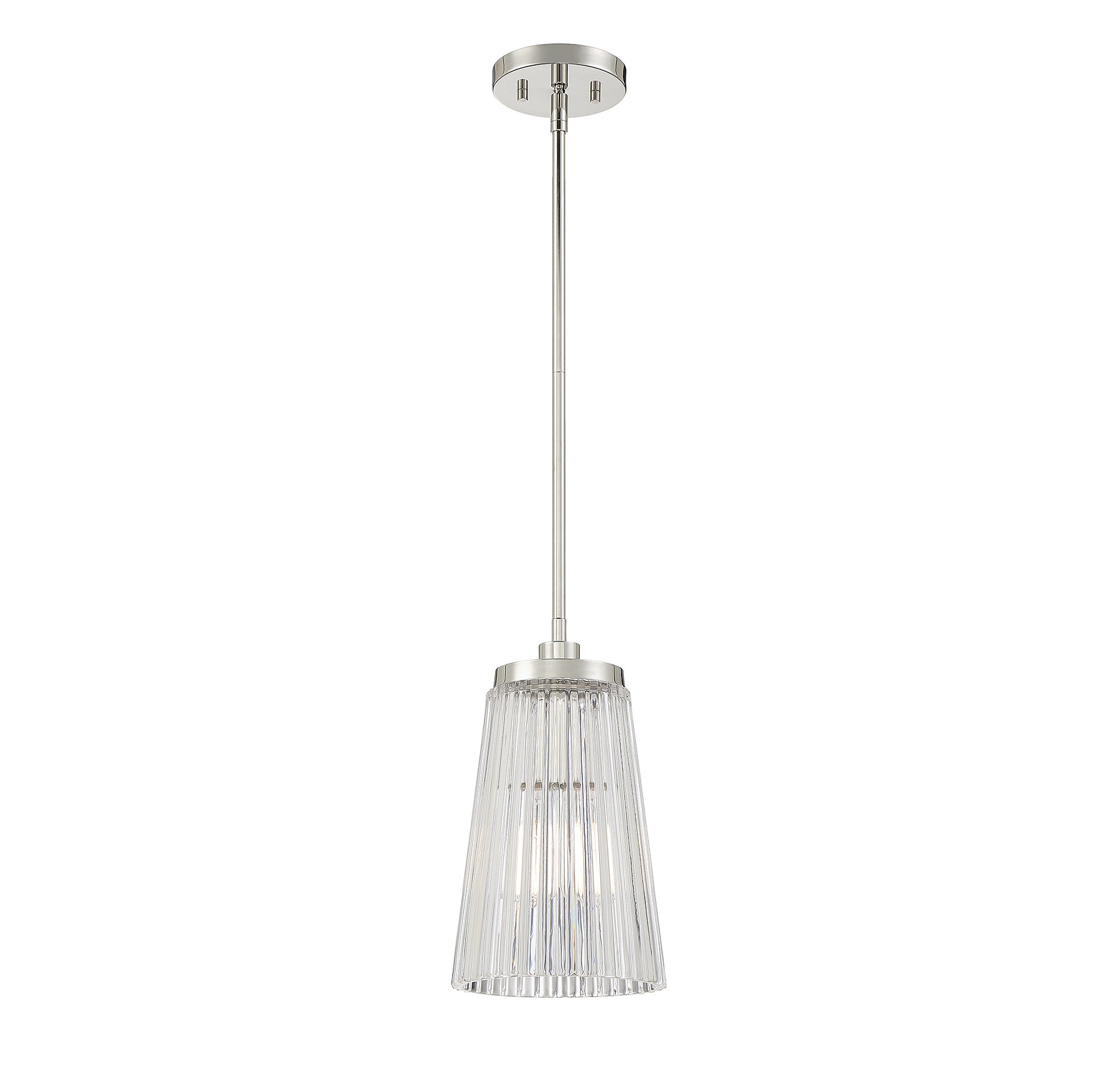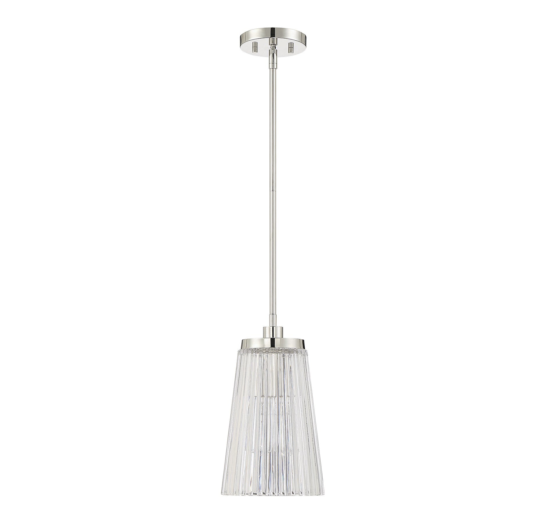 A textured, eye-catching shade of clear ribbed glass takes center stage in the Chantilly 1-light pendant from Savoy House. Finished in polished nickel. Chantilly is 8" in diameter and it has an adjustable height ranging from 22.5" to 41.5". It uses one standard size bulb with a max of 60 watts. Comes with three 9.5" downrods, plus 120" of cord.