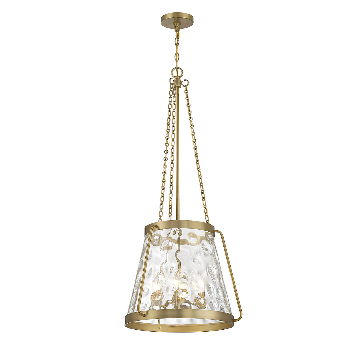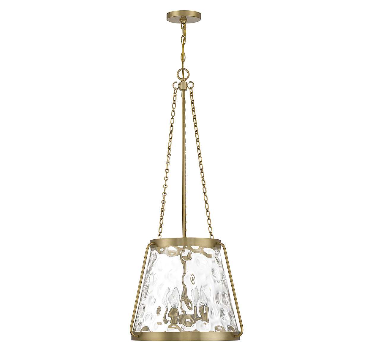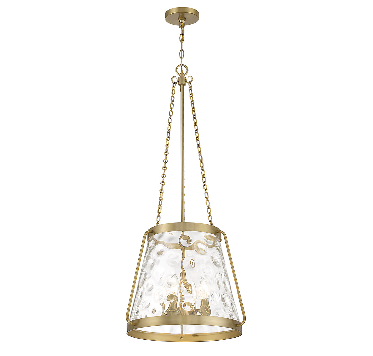 The Savoy House Crawford 4-light pendant proves that a classic style can be stunning! A lantern-inspired shade of clear water glass hangs down from an understated structure with industrial-inspired details. Finished in warm brass. Crawford is 39.5” in height and 18” in width. It uses 4 candelabra size bulbs of up to 60 watts per bulb (bulbs not included).