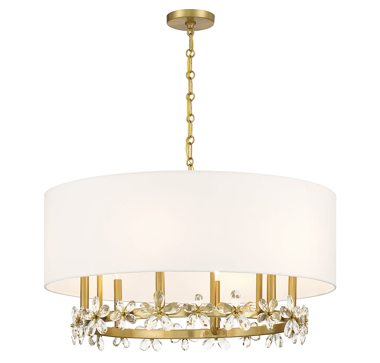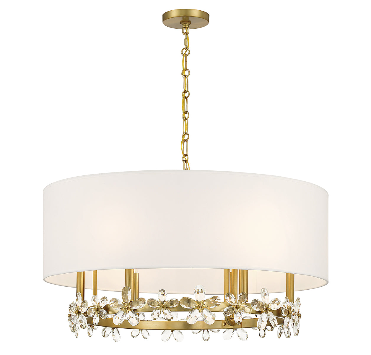 Give your home its flowers with the whimsical Savoy House Dahlia 6-light pendant. Its streamlined structure is decorated with clear crystal flowers to create a look that is always fresh and fun, whether the light is on or off. Finished in warm brass with a white shade. Dahlia is 16.50" in height and 30" in width. It uses 6 candelabra size bulbs of up to 60 watts per bulb (bulbs not included).