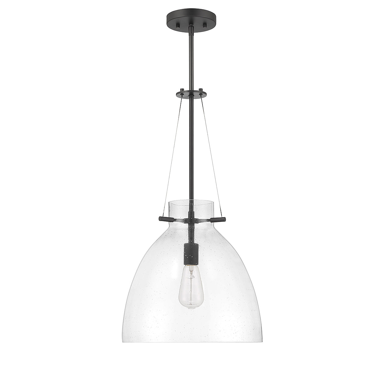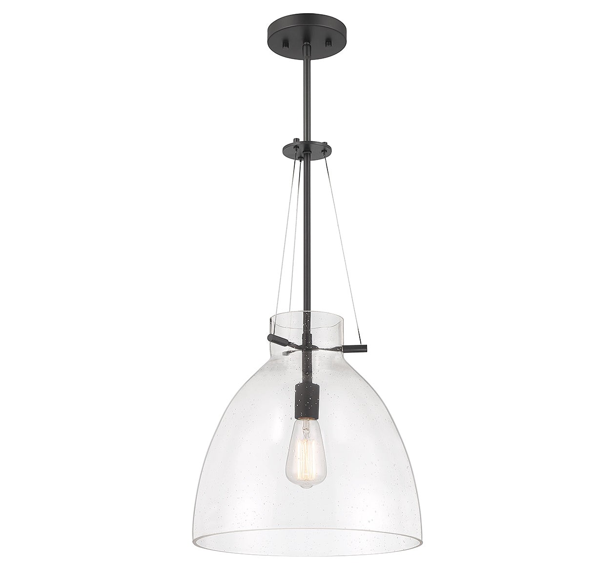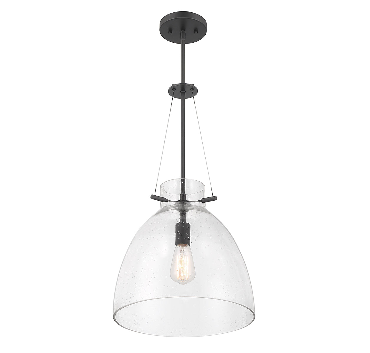The Savoy House Foster 1-light pendant is the perfect way to add a sleek look to any space. Its large shade of clear seeded glass has a pleasantly curving shape and pairs nicely with the matte black finish. Foster is 25.50" in height and 14" in width. It uses 1 standard size bulb with a max of 60 watts (bulb not included). Comes with four 12" downrods and one 6" downrod.