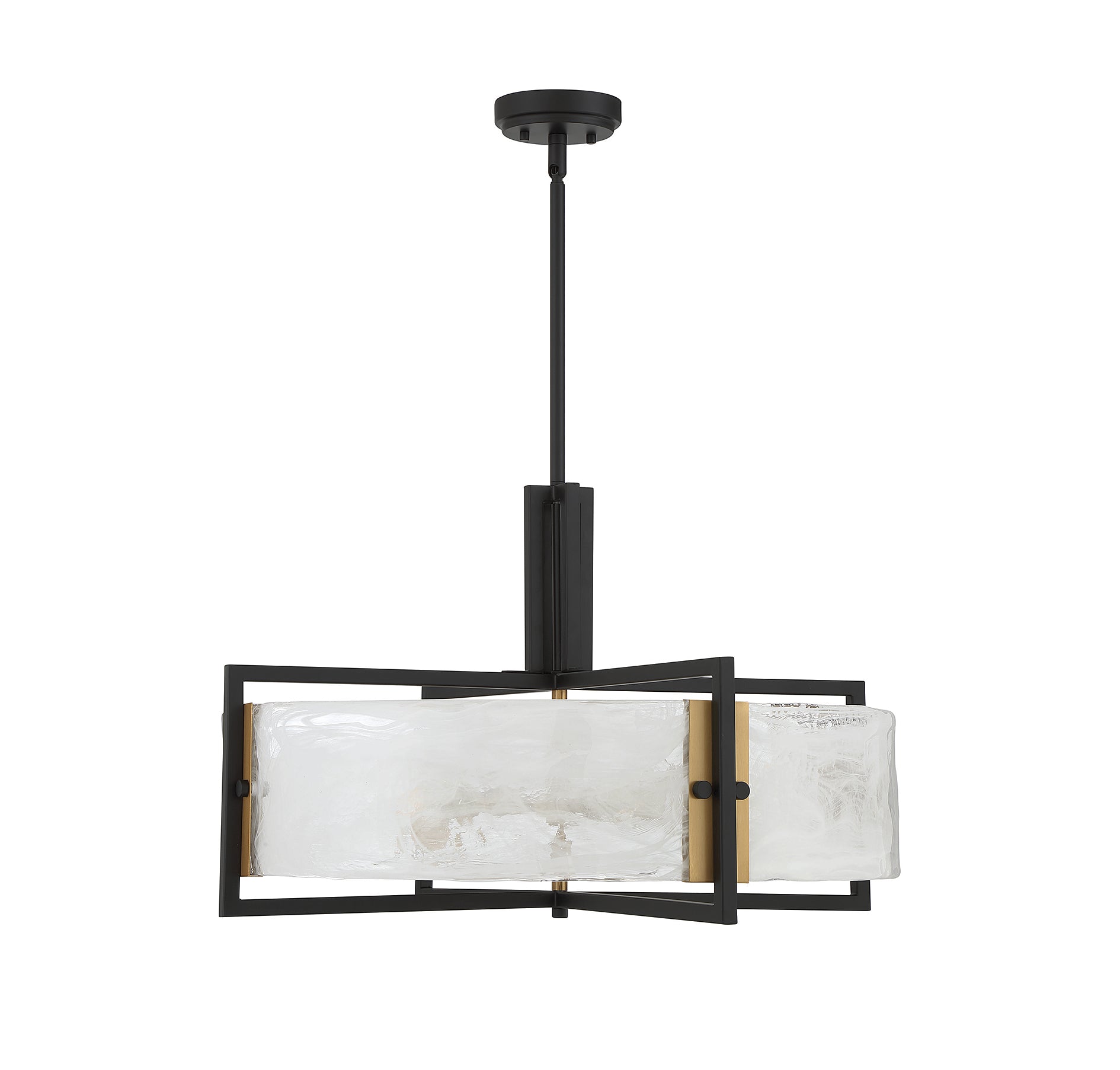 Swirling, mesmerizing strie piastra glass surrounds the lights within the Savoy House Hayward 5-light pendant. The matte black frame showcases warm brass accents for another dimension of style. Hayward is 28" in width and has an adjustable height ranging from 23" to 69". It uses five standard size bulbs of up to 60 watts per bulb. Comes with four 12" downrods and one 6" downrod, plus 80" of cord.