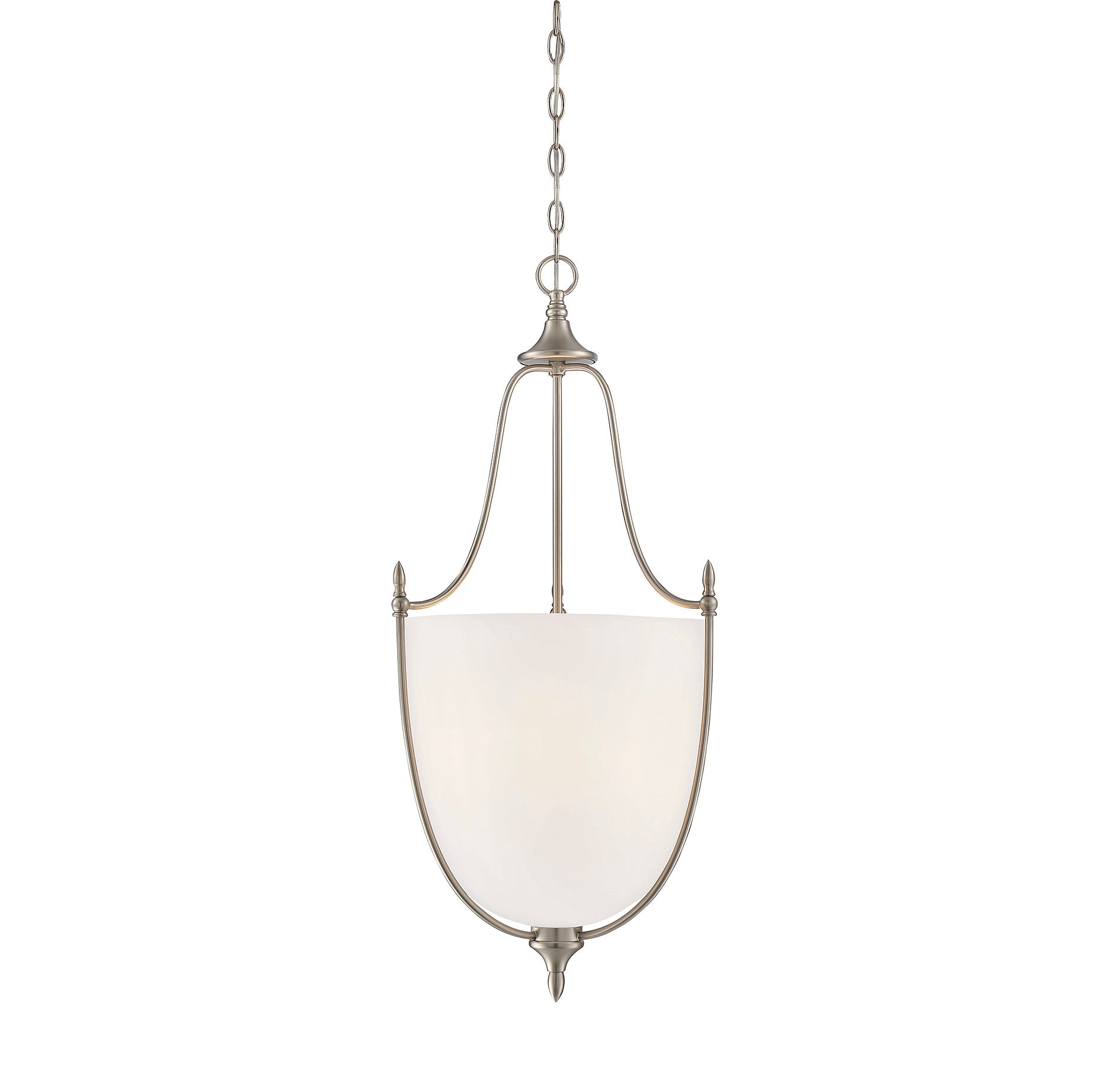 Great lighting, like the Savoy House Herndon 3-light pendant, is a key piece of home design! Finished in timeless satin nickel, its streamlined, finely crafted details create a clean, classic design that looks terrific. The style is familiar and pleasant, which sets a serene and relaxed mood. Graceful arched bars hold a white frosted glass shade and three 60W standard size bulbs provide soft, flattering light to ensure you and your guests are comfortable. This pendant is 16" wide and 34" high, creating a stylish fixture with casual elegance you’ll enjoy for years to come.