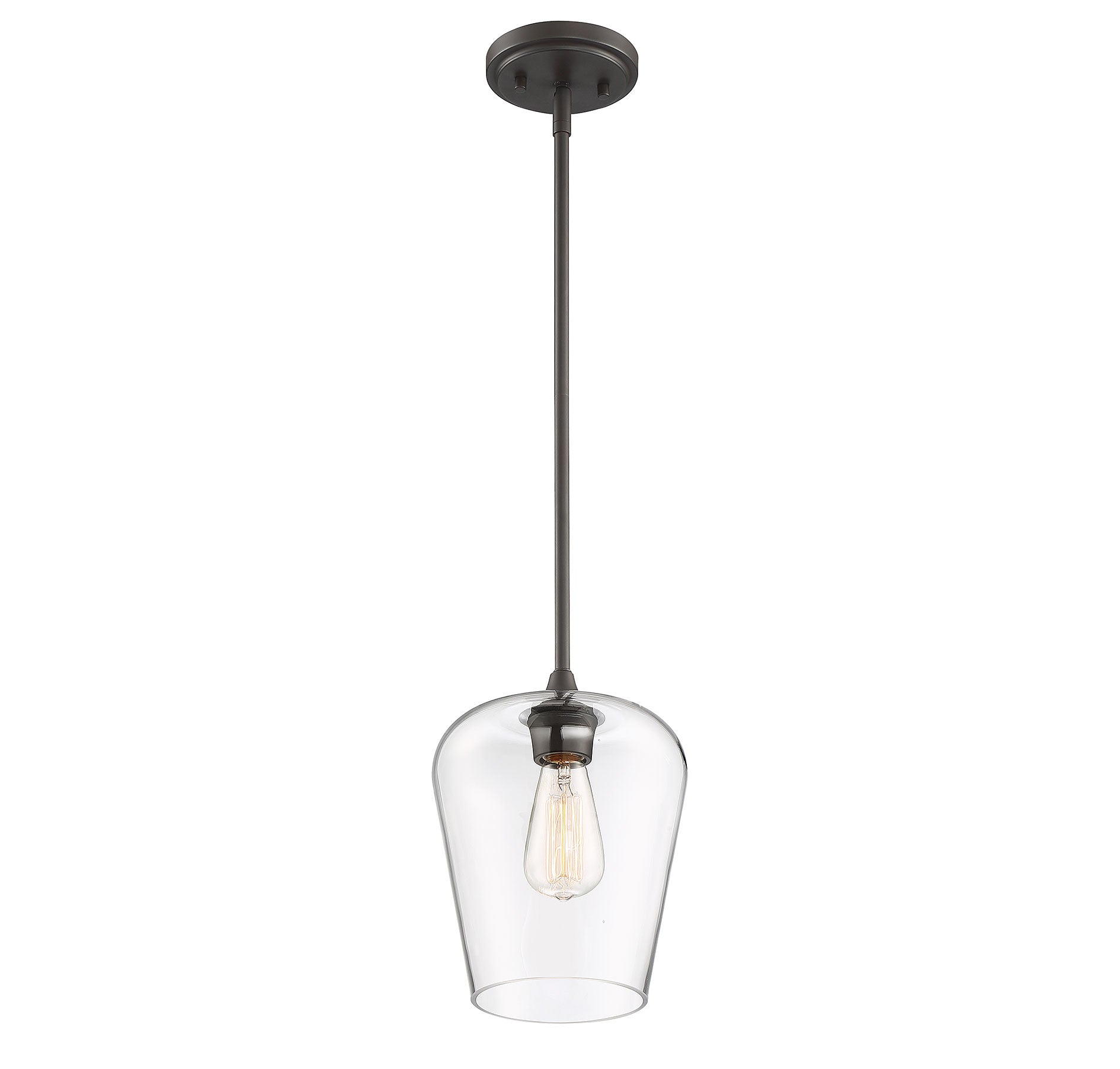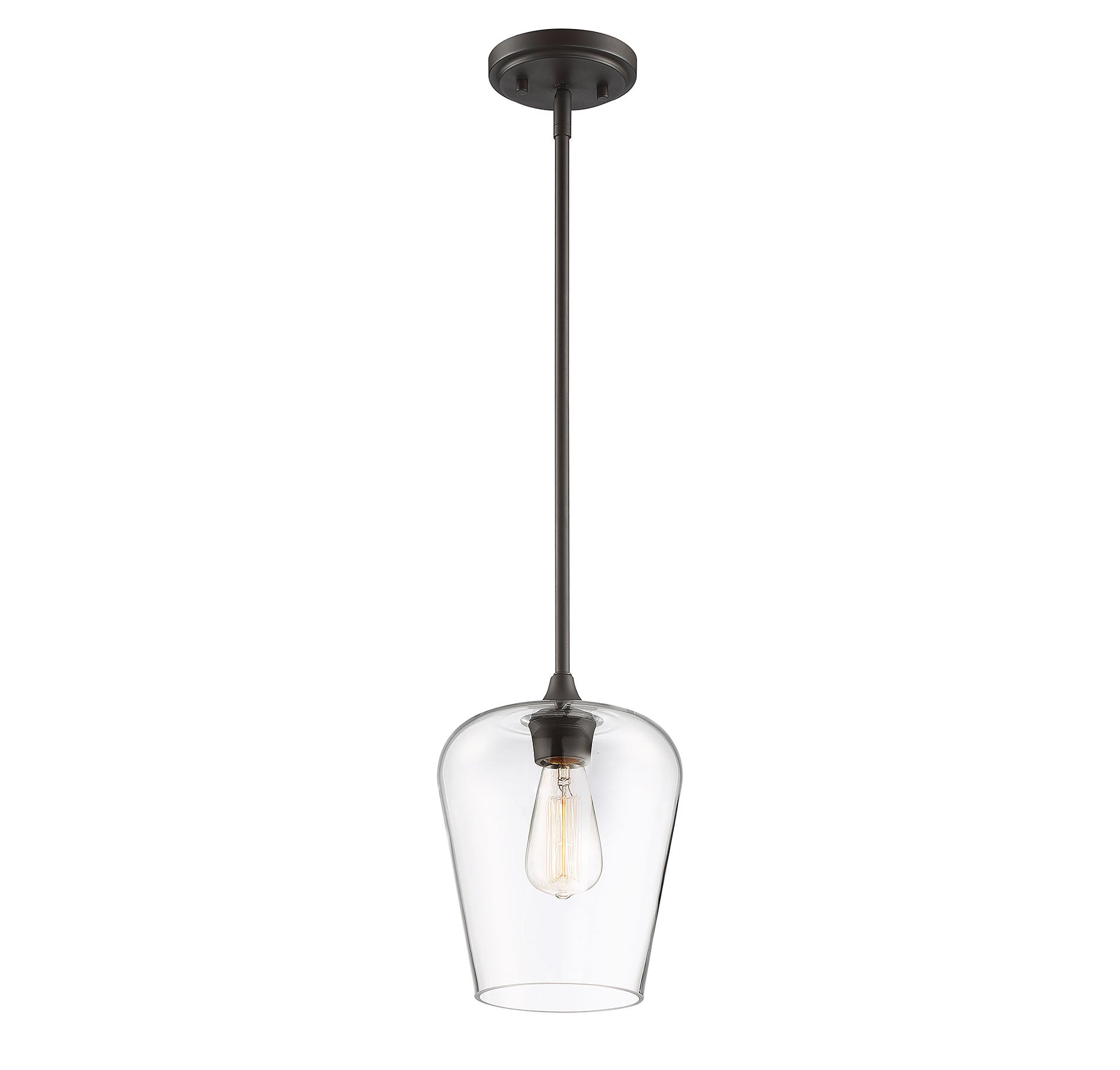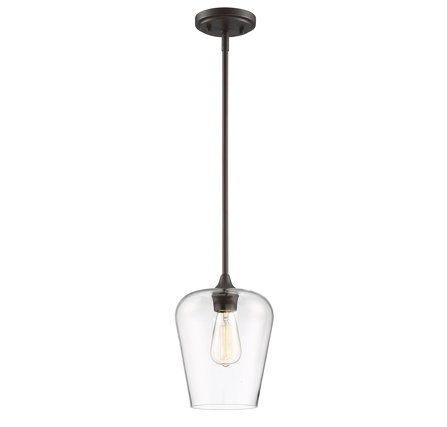 Get a pendant look with understated elegance when you get the Savoy House Octave 1-light pendant. It features a shade of curved clear glass, minimal detailing and a bold English bronze finish. Pendants are extremely versatile and can fit in many different spaces, such as kitchens, family rooms, great rooms, foyers, entryways, offices, bedrooms and bathrooms. The hanging height is adjustable and this pendant can be used on a sloped ceiling. Since the bulb is exposed, try using a stylized bulb (not included) like Edison style for a different twist! The fashionable warm brass finish can be paired with brass hardware or mixed with hardware in other finishes. Try the Octave with glam, transitional or contemporary style rooms for a chic look. When you choose a Savoy House lighting fixture, you can be certain you've selected a piece that will withstand the test of time.