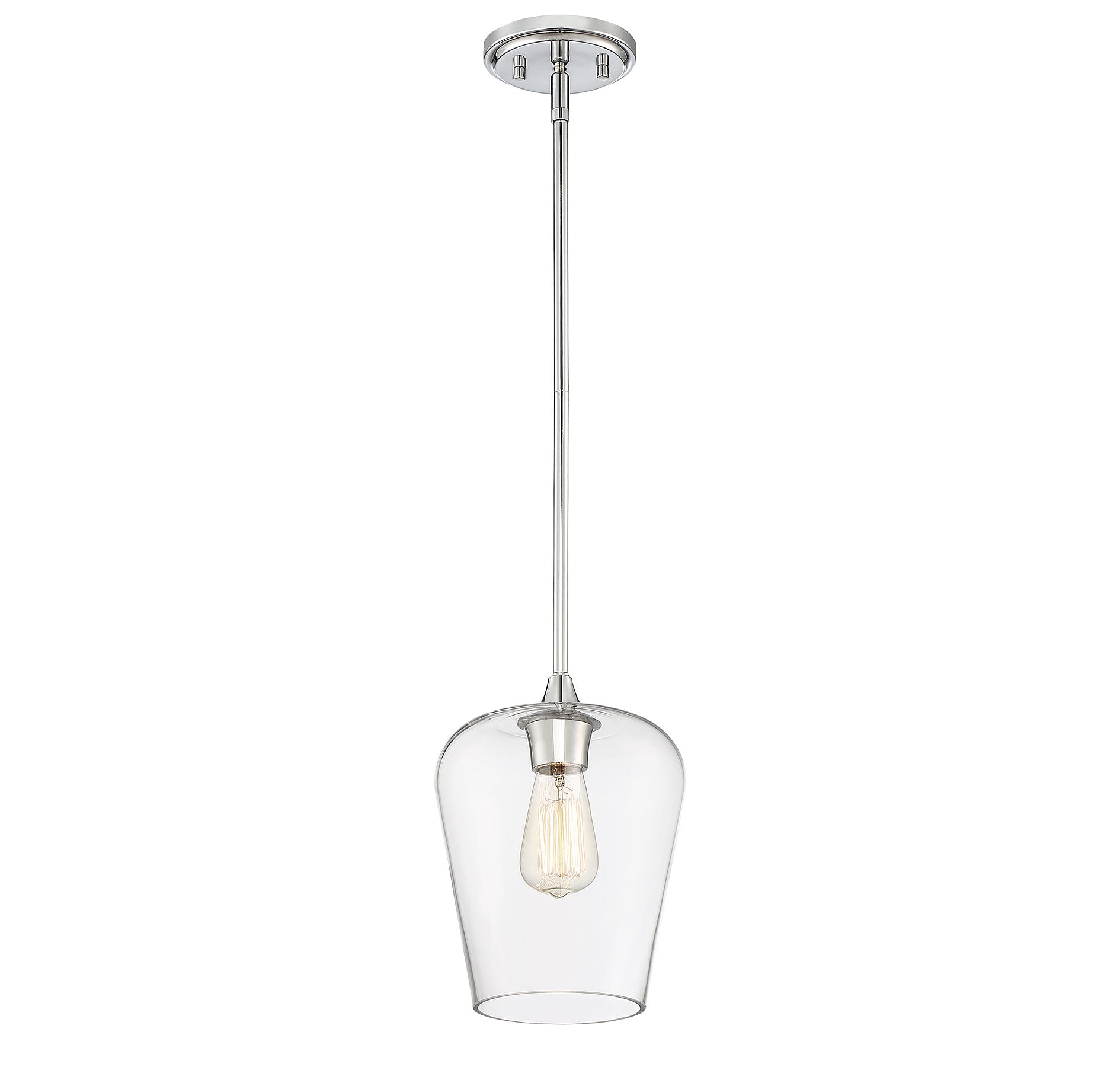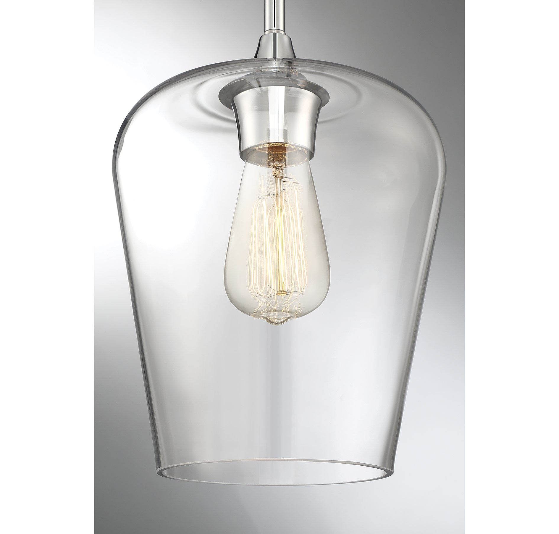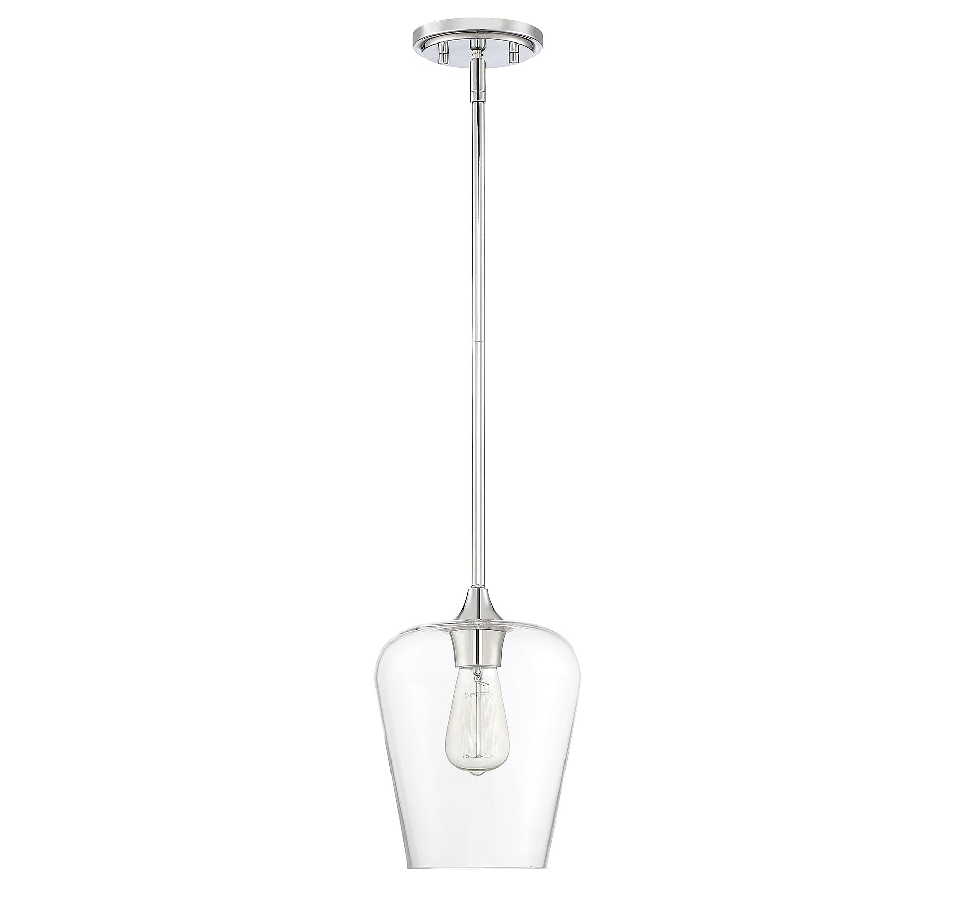 Get a pendant look with understated elegance when you get the Savoy House Octave 1-light pendant. It features a shade of curved clear glass, minimal detailing and a sleek polished chrome finish. Pendants are extremely versatile and can fit in many different spaces, such as kitchens, family rooms, great rooms, foyers, entryways, offices, bedrooms and bathrooms. The hanging height is adjustable and this pendant can be used on a sloped ceiling. Since the bulb is exposed, try using a stylized bulb (not included) like Edison style for a different twist! The chrome finish can be paired with chrome hardware or mixed with hardware in other finishes. Try the Octave with glam, transitional or contemporary style rooms for a chic look. When you choose a Savoy House lighting fixture, you can be certain you've selected a piece that will withstand the test of time.