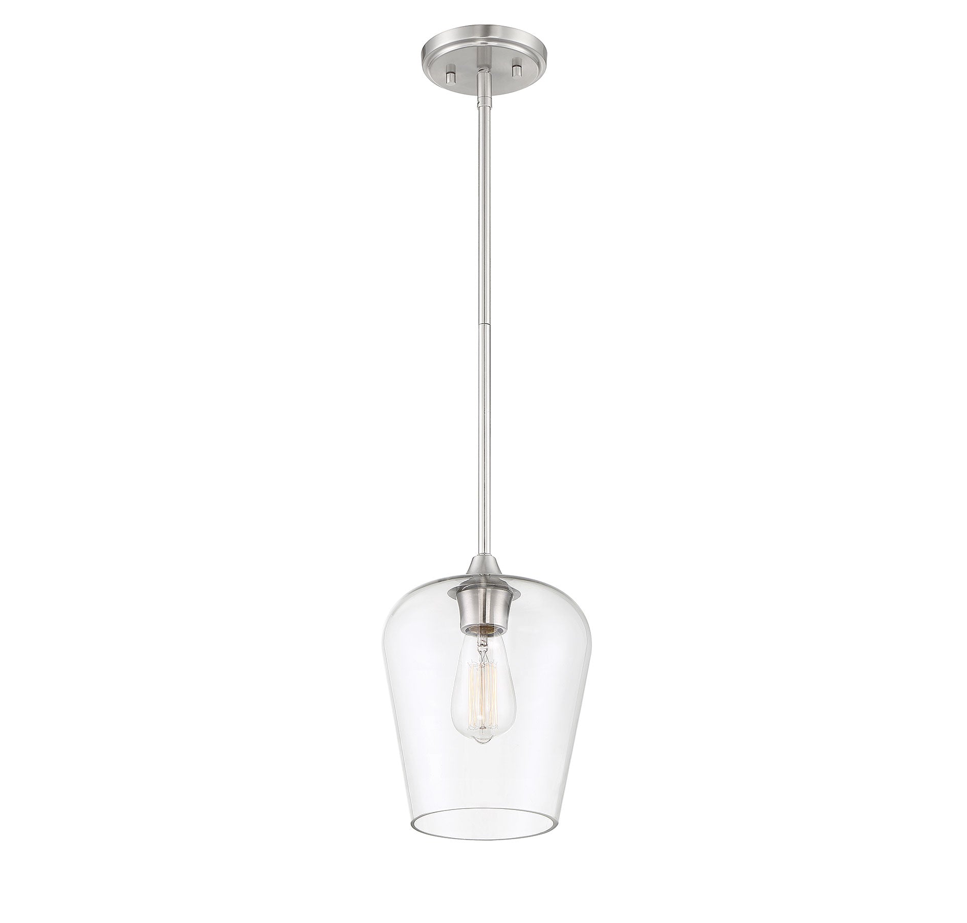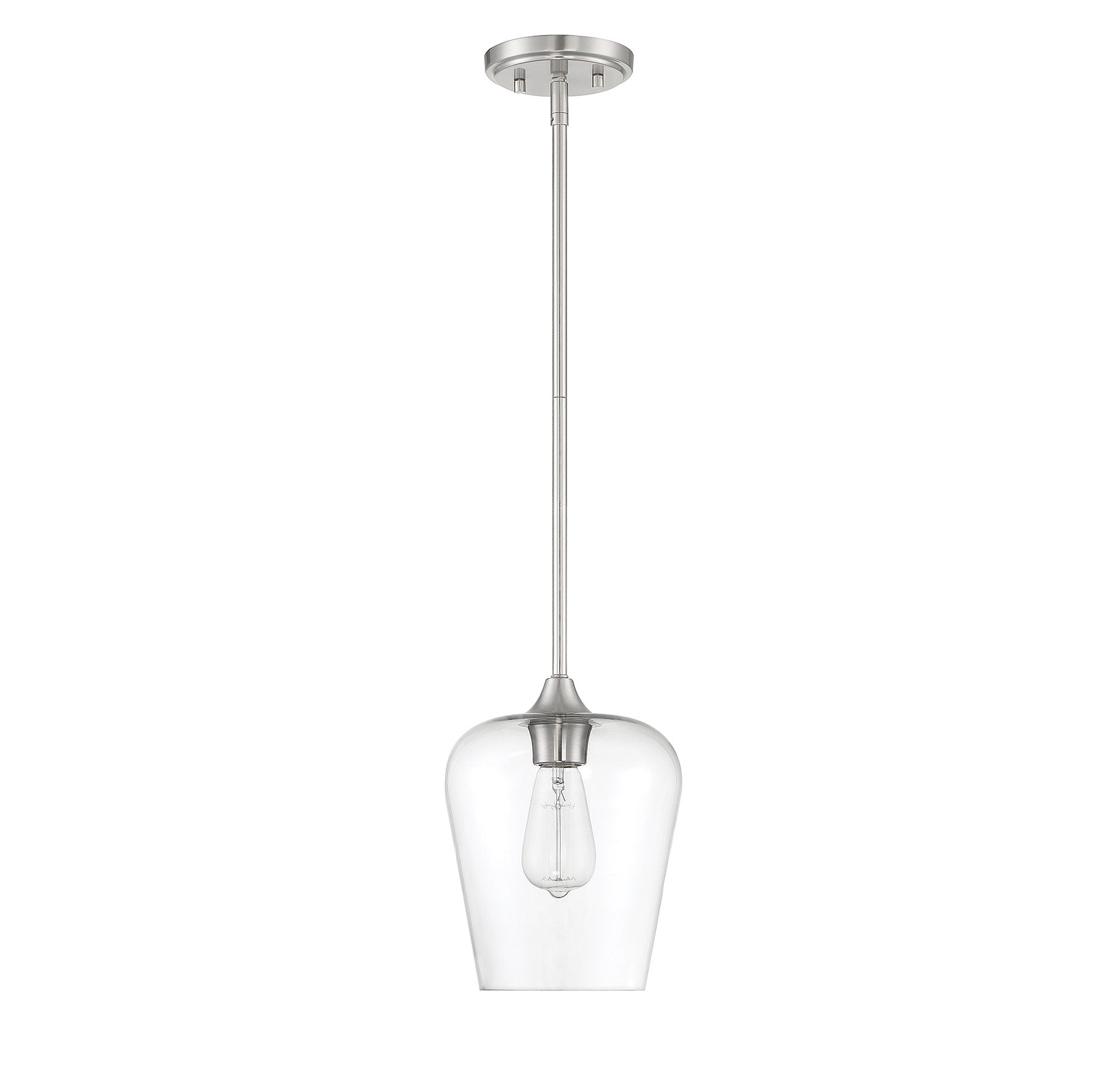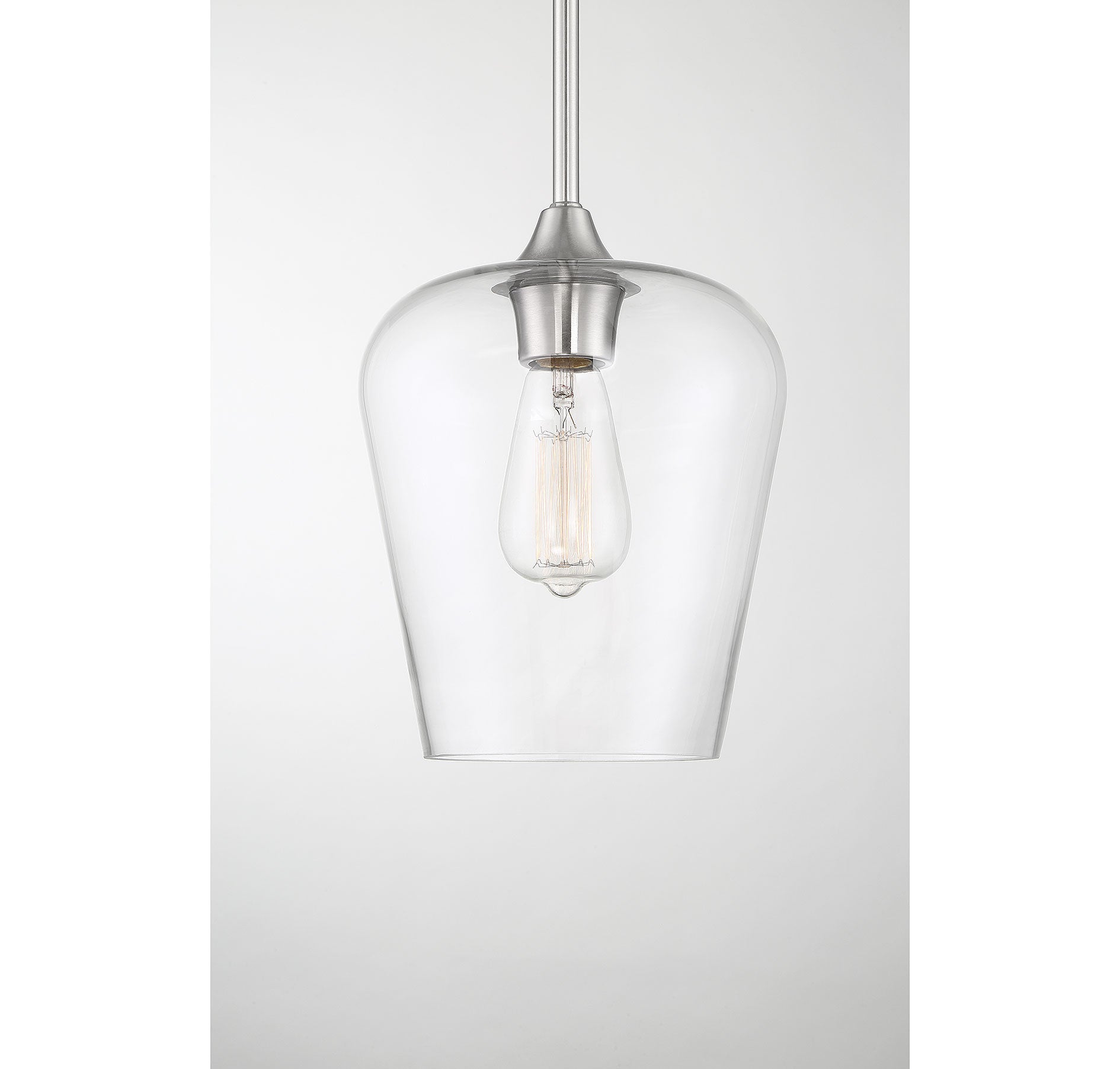 In the Savoy House Octave 1-light pendant, a bold, light-colored frame and streamlined silhouette create an air of elegance and sophistication. The satin nickel finish and large clear glass shade go with absolutely everything. Whether you have transitional, contemporary, bohemian or other decor styles in your home, you’ll love the way this Octave fixture stylishly blends in. At 8" wide by 10.5" high, this pendant is a perfectly graceful, proportionate size whether used solo or in groupings. The curved glass shade has a sleek, uncluttered look and one 60W standard size bulb provides lovely light for clean, casual style in your dining area, living room, kitchen, foyer, bedroom, bathroom, hallway, family room, office, great room or stairway.