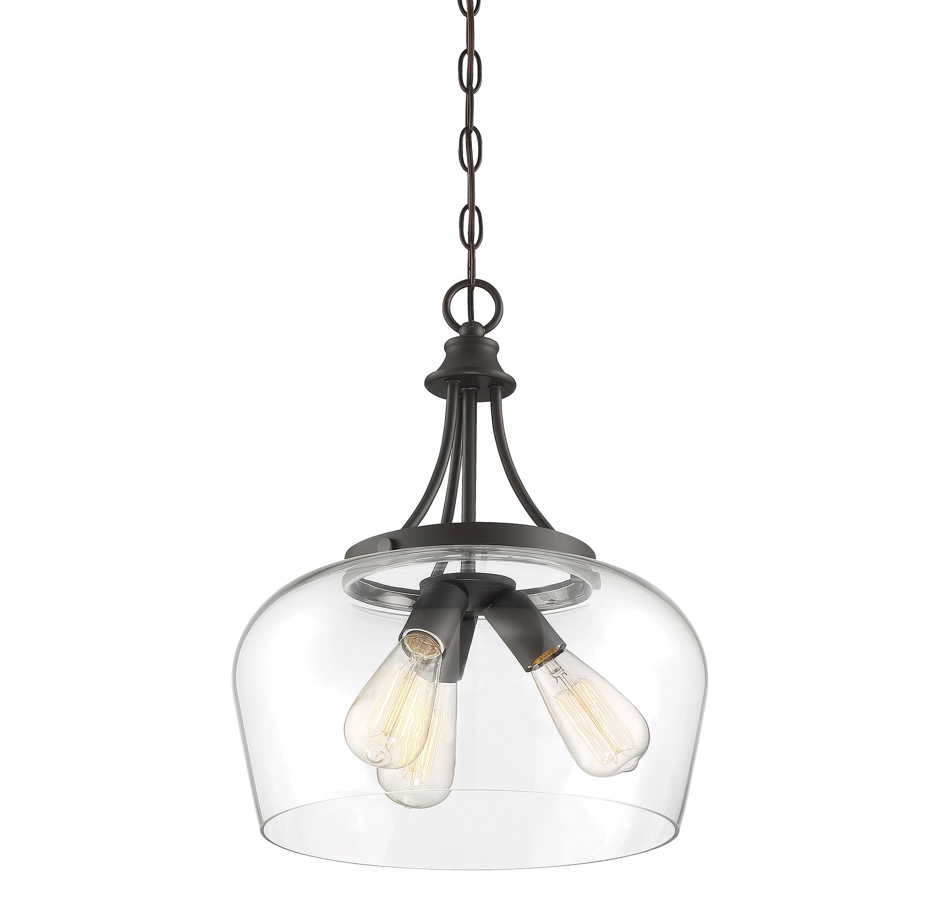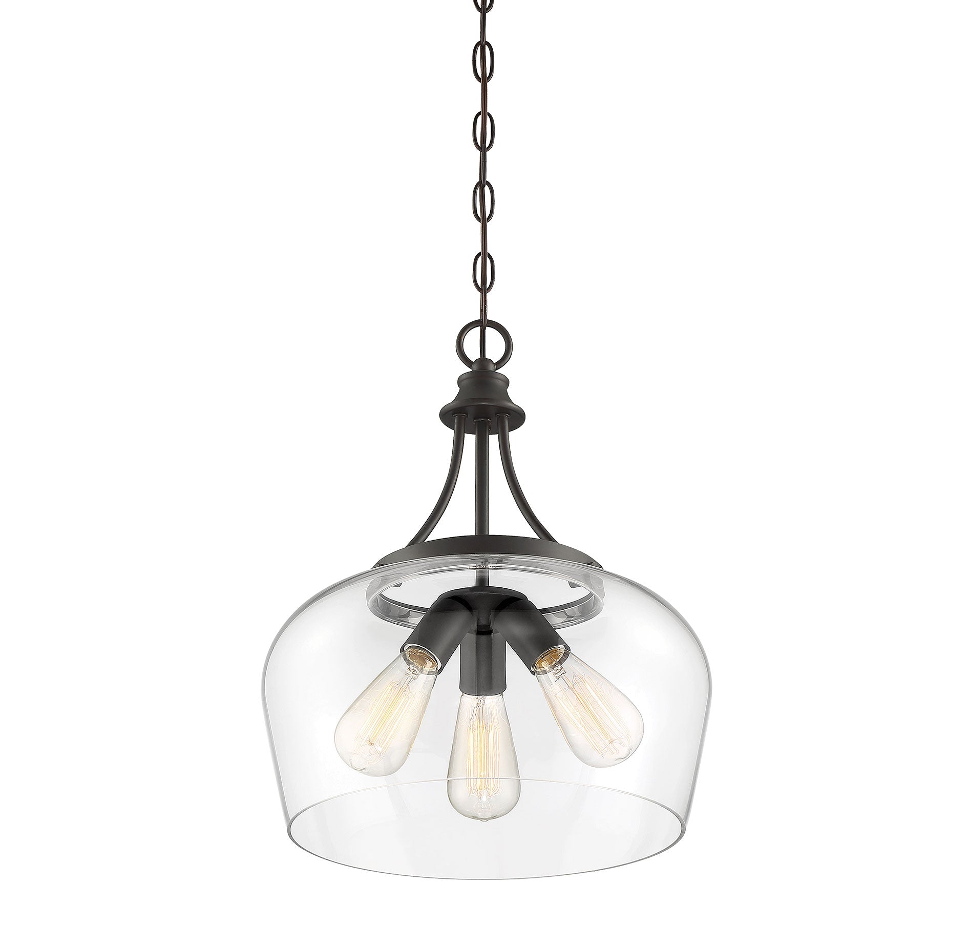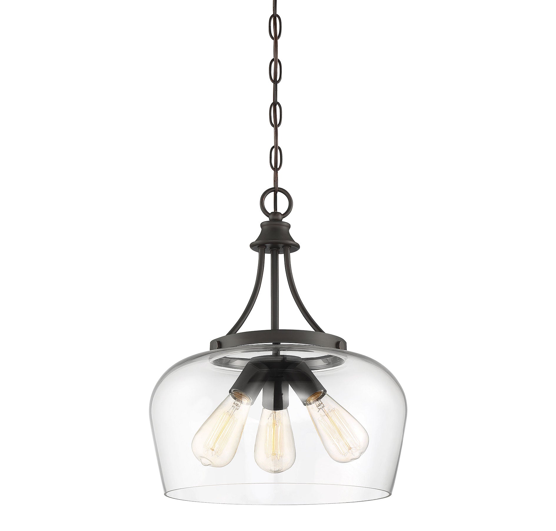 Get a pendant look with understated elegance when you get the new Savoy House Octave 3-light pendant. It features a single large shade of curved clear glass, minimal detailing and a bold English bronze finish. Pendants are extremely versatile and can fit in many different spaces, such as kitchens, family rooms, great rooms, foyers, entryways, offices, bedrooms and bathrooms. Because this pendant is chain-hung, you can use as much or as little chain as you need to fit your specific hanging height needs, and this pendant can be used on a sloped ceiling. Since the bulbs are exposed, try using stylized bulbs (not included) like Edison style for a different twist! The English bronze finish can be paired with bronze hardware or mixed with hardware in other finishes. Try the Octave with glam, transitional or contemporary style rooms for a chic look. When you choose a Savoy House lighting fixture, you can be certain you've selected a piece that will withstand the test of time.