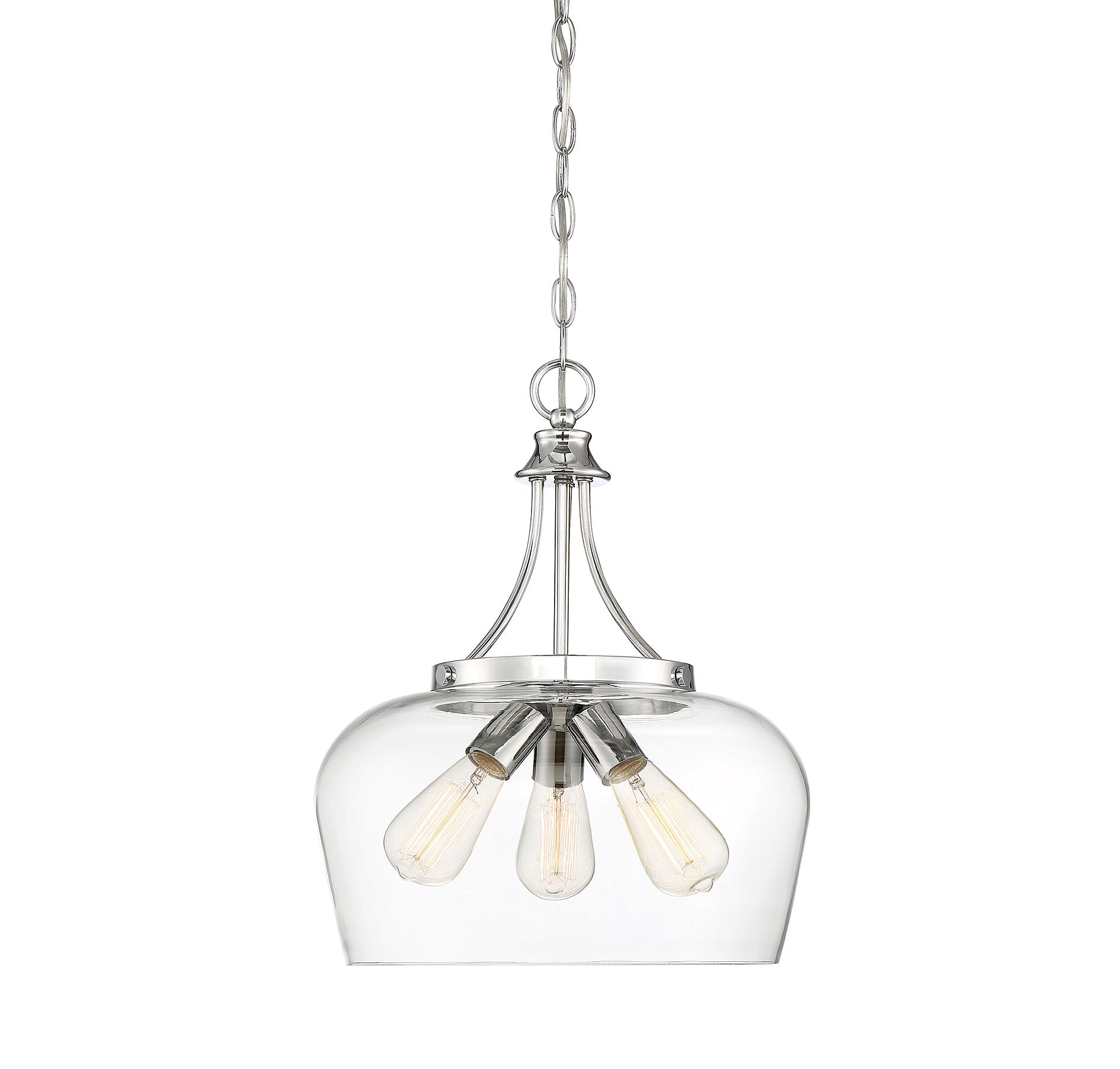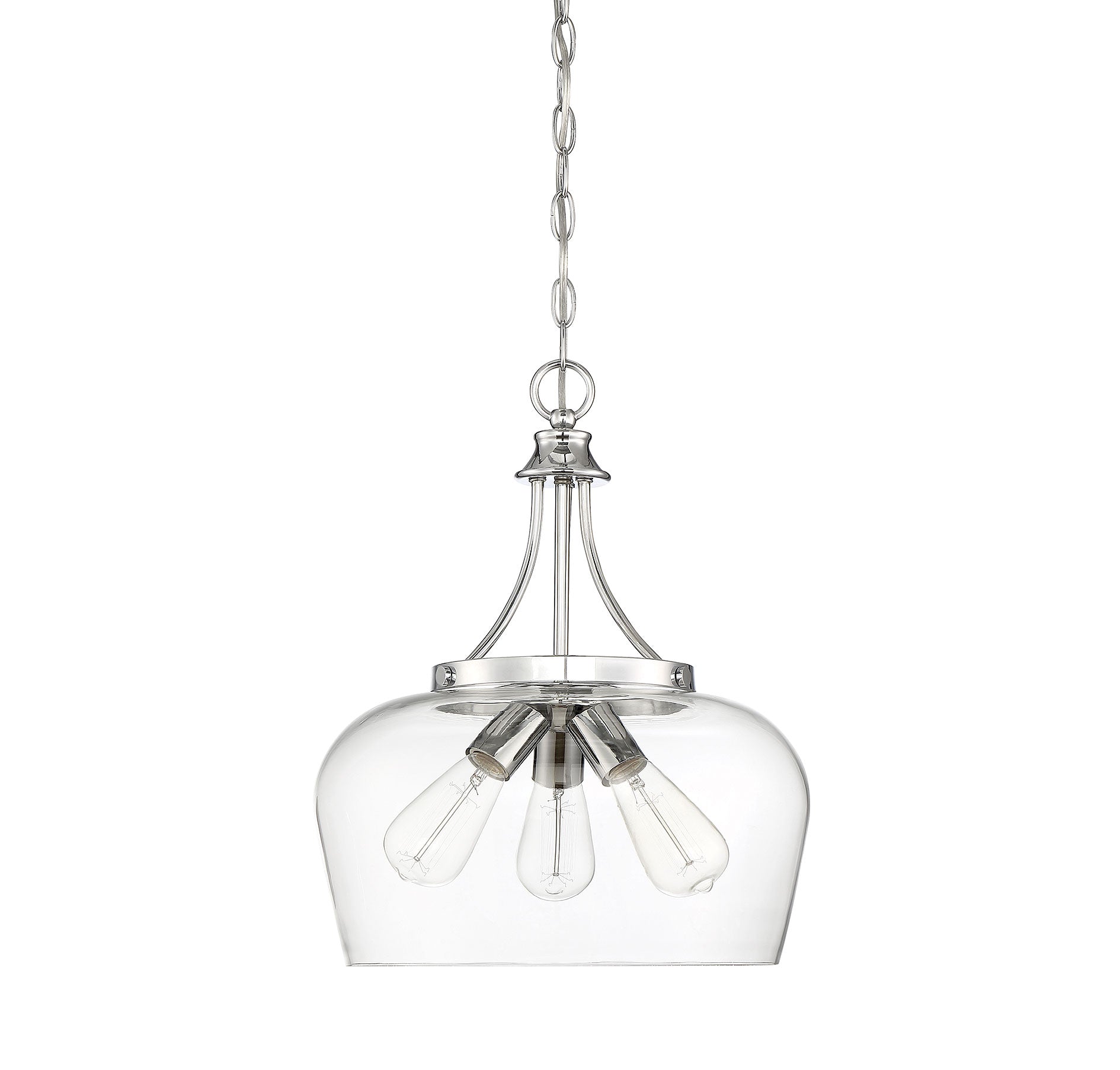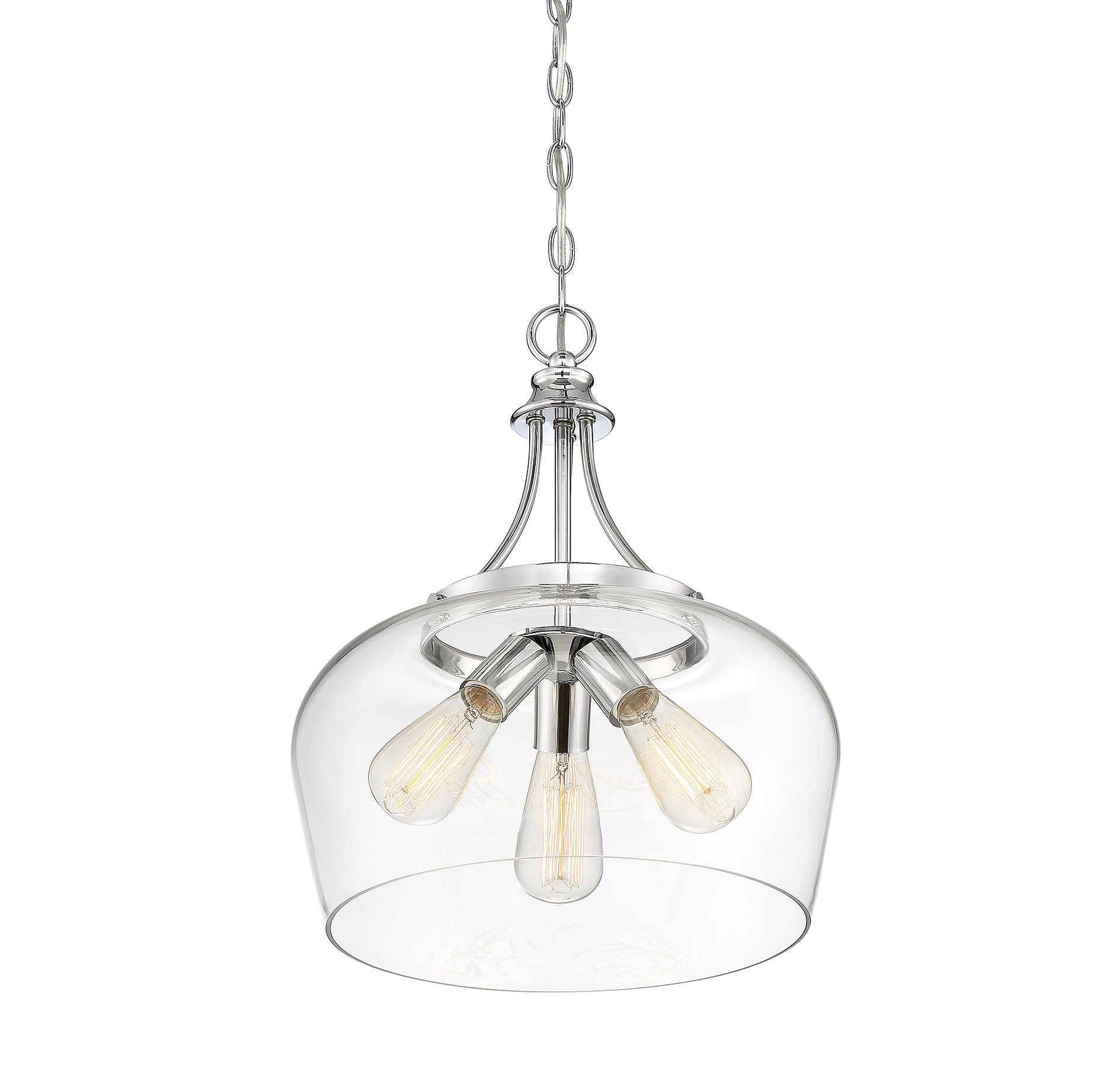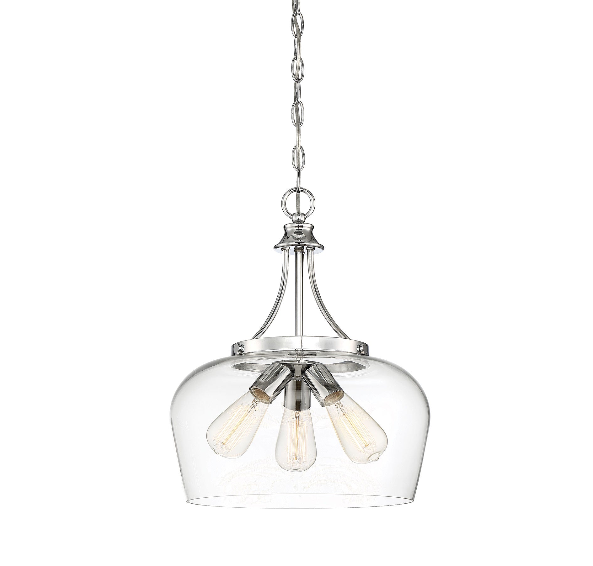 Get a pendant look with understated elegance when you get the new Savoy House Octave 3-light pendant. It features a single large shade of curved clear glass, minimal detailing and a sleek polished chrome finish. Pendants are extremely versatile and can fit in many different spaces, such as kitchens, family rooms, great rooms, foyers, entryways, offices, bedrooms and bathrooms. Because this pendant is chain-hung, you can use as much or as little chain as you need to fit your specific hanging height needs, and this pendant can be used on a sloped ceiling. Since the bulbs are exposed, try using stylized bulbs (not included) like Edison style for a different twist! The polished chrome finish can be paired with chrome hardware or mixed with hardware in other finishes. Try the Octave with glam, transitional or contemporary style rooms for a chic look. When you choose a Savoy House lighting fixture, you can be certain you've selected a piece that will withstand the test of time.