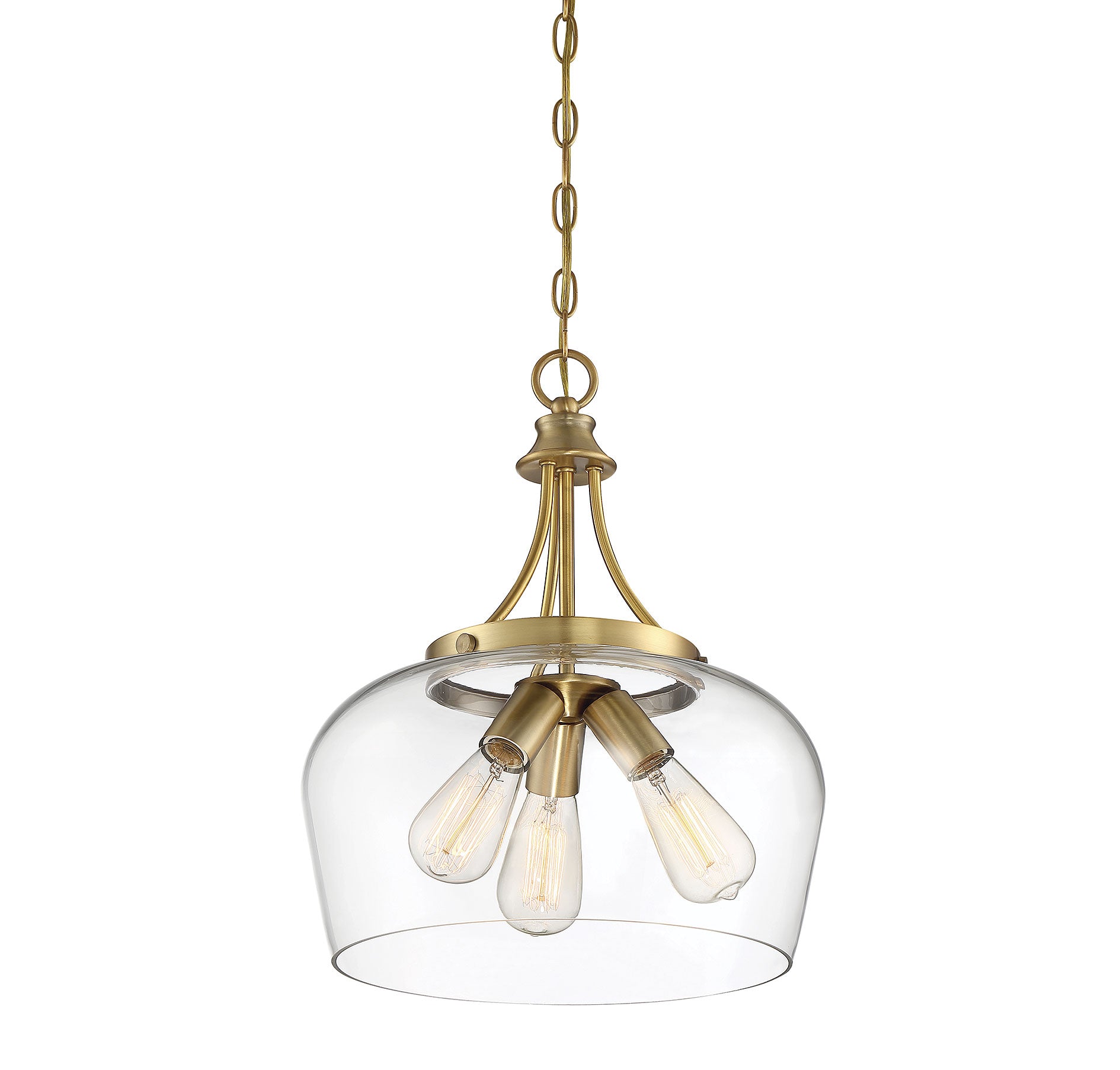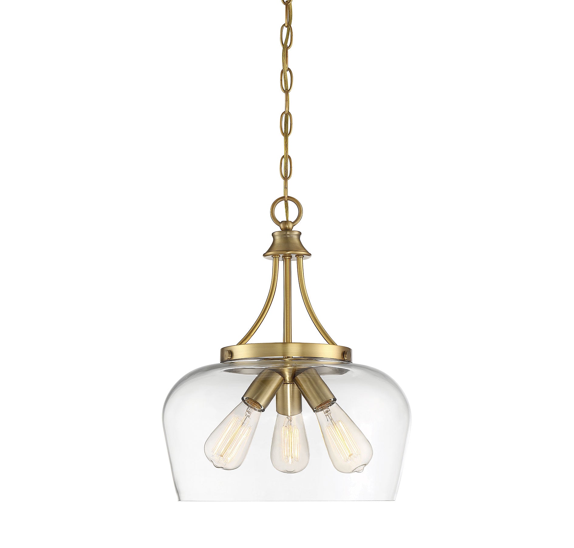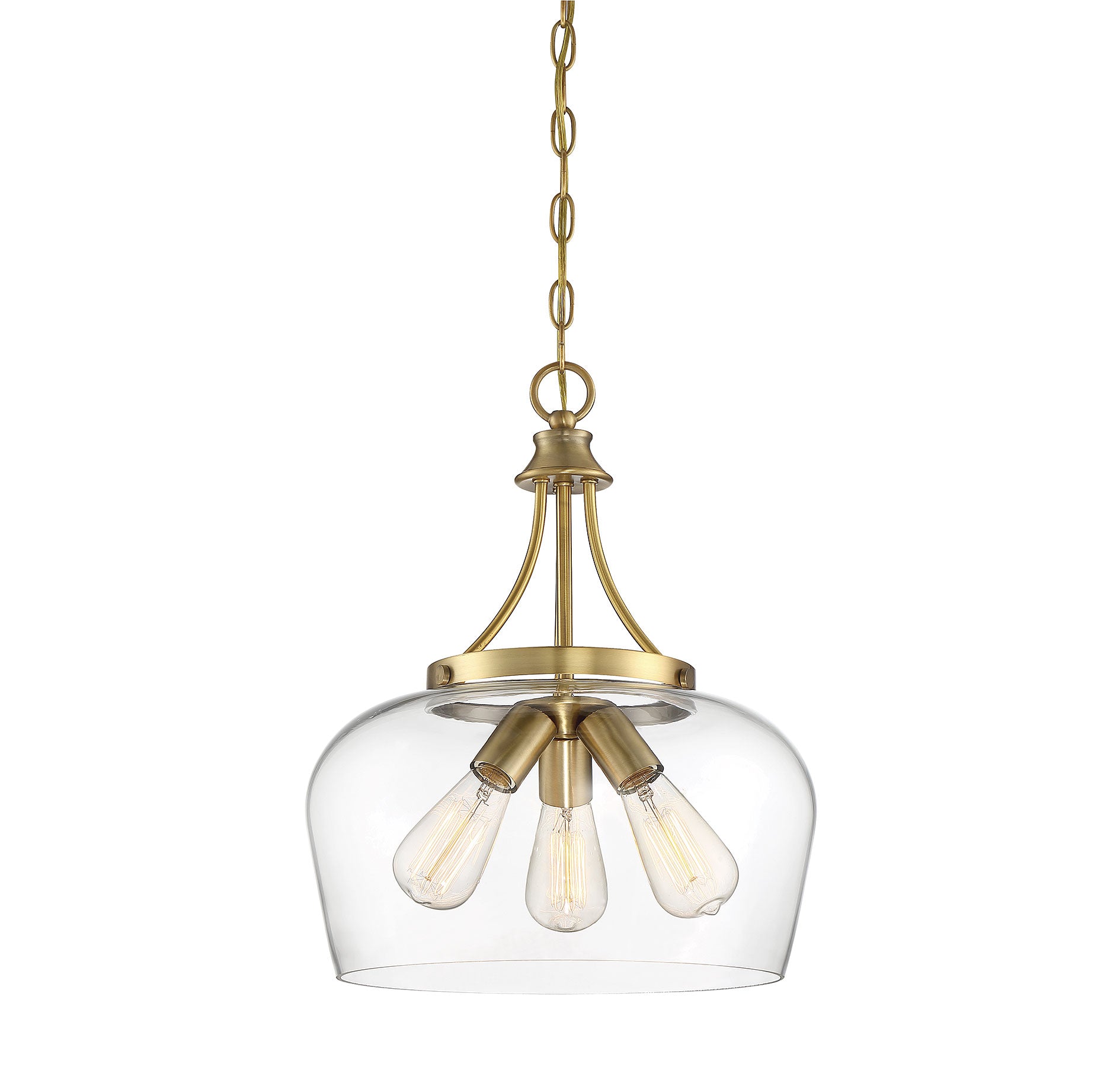 Get a pendant look with understated elegance when you get the new Savoy House Octave 3-light pendant. It features a single large shade of curved clear glass, minimal detailing and a rich warm brass finish. Pendants are extremely versatile and can fit in many different spaces, such as kitchens, family rooms, great rooms, foyers, entryways, offices, bedrooms and bathrooms. Because this pendant is chain-hung, you can use as much or as little chain as you need to fit your specific hanging height needs, and this pendant can be used on a sloped ceiling. Since the bulbs are exposed, try using stylized bulbs (not included) like Edison style for a different twist! The fashionable warm brass finish can be paired with brass hardware or mixed with hardware in other finishes. Try the Octave with glam, transitional or contemporary style rooms for a chic look. When you choose a Savoy House lighting fixture, you can be certain you've selected a piece that will withstand the test of time.